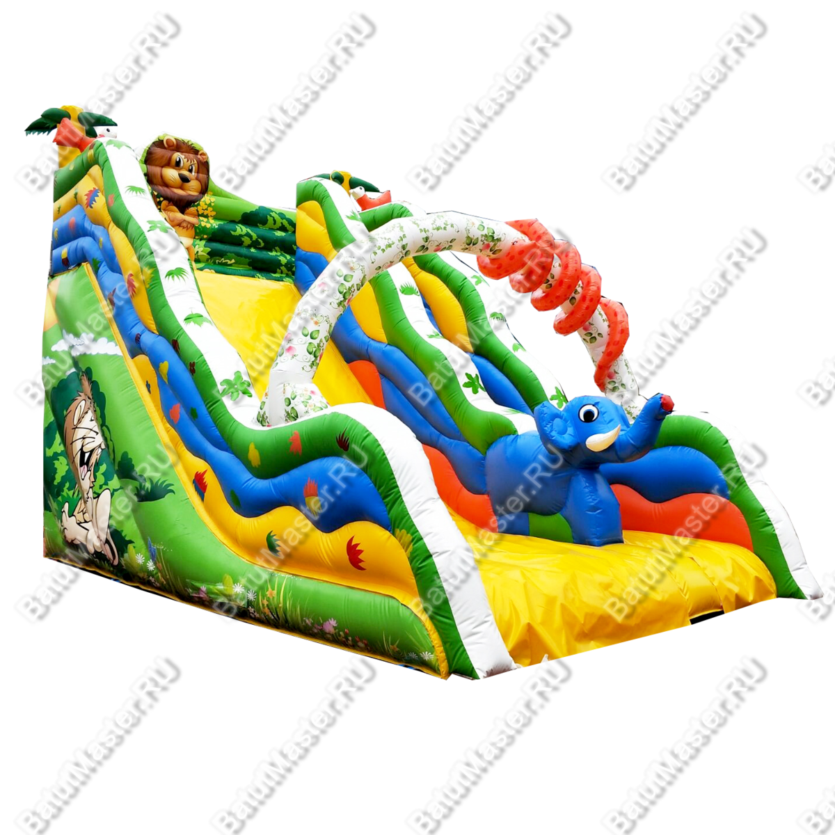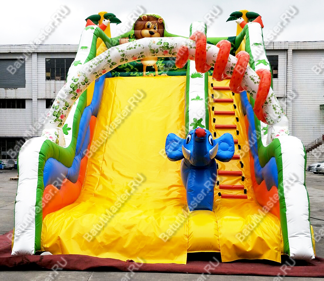 Надувной батут «Тропический микс» сразу понравится детишкам, ведь благодаря своей красочности он отлично передаёт тёплую атмосферу тропиков. Вся конструкция изобилует яркими цветами, которые также ассоциируются у ребёнка с тропиками. Также батут украшен декорациями, например, на входе стоит весёлый голубой слоник, а над горкой возвышается гордый лев, который следит за порядком. Через горку протянута арка, вокруг которой обвилась большая красная змея. Все эти детали приведут ребёнка в восторг, и его воображение перенсёт его в настоящие тропики.