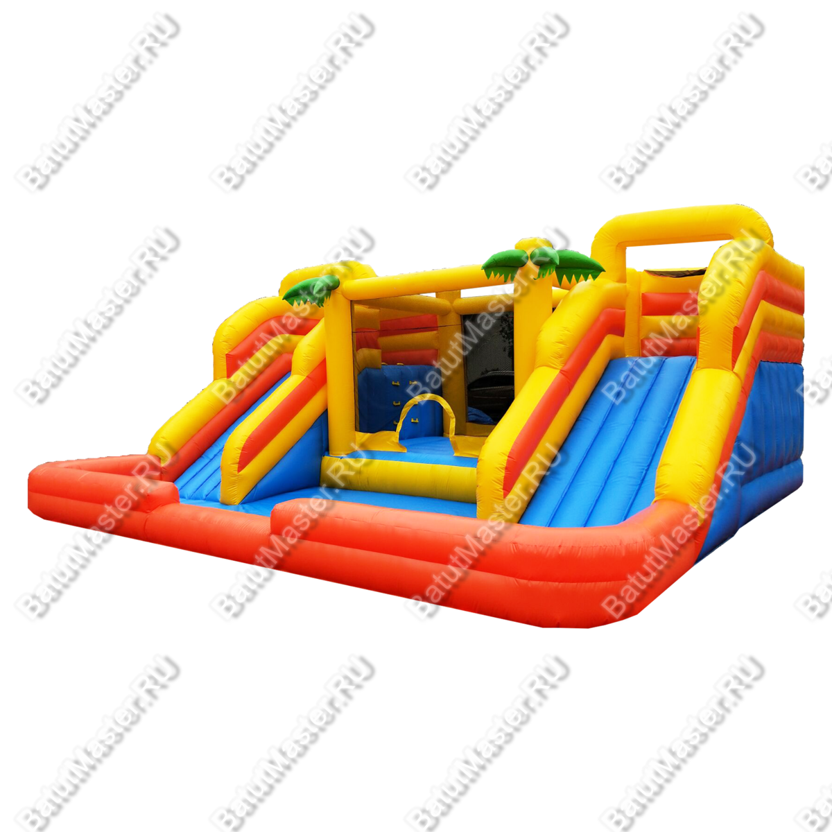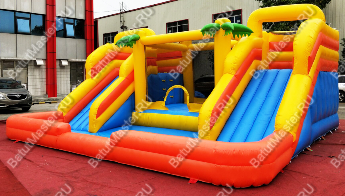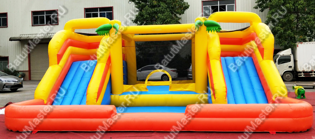 Надувной коммерческий батут для бизнеса привлечет внимание каждого ребенка. Здесь можно делать все, что захочется, места достаточно и все сделано так, чтобы дети могли резвиться большой дружной компанией. Тропический рай станет центром притяжения на любом детском празднике. Здесь есть две широкие горки, поэтому спускаться вниз можно одновременно и это будет очень весело.