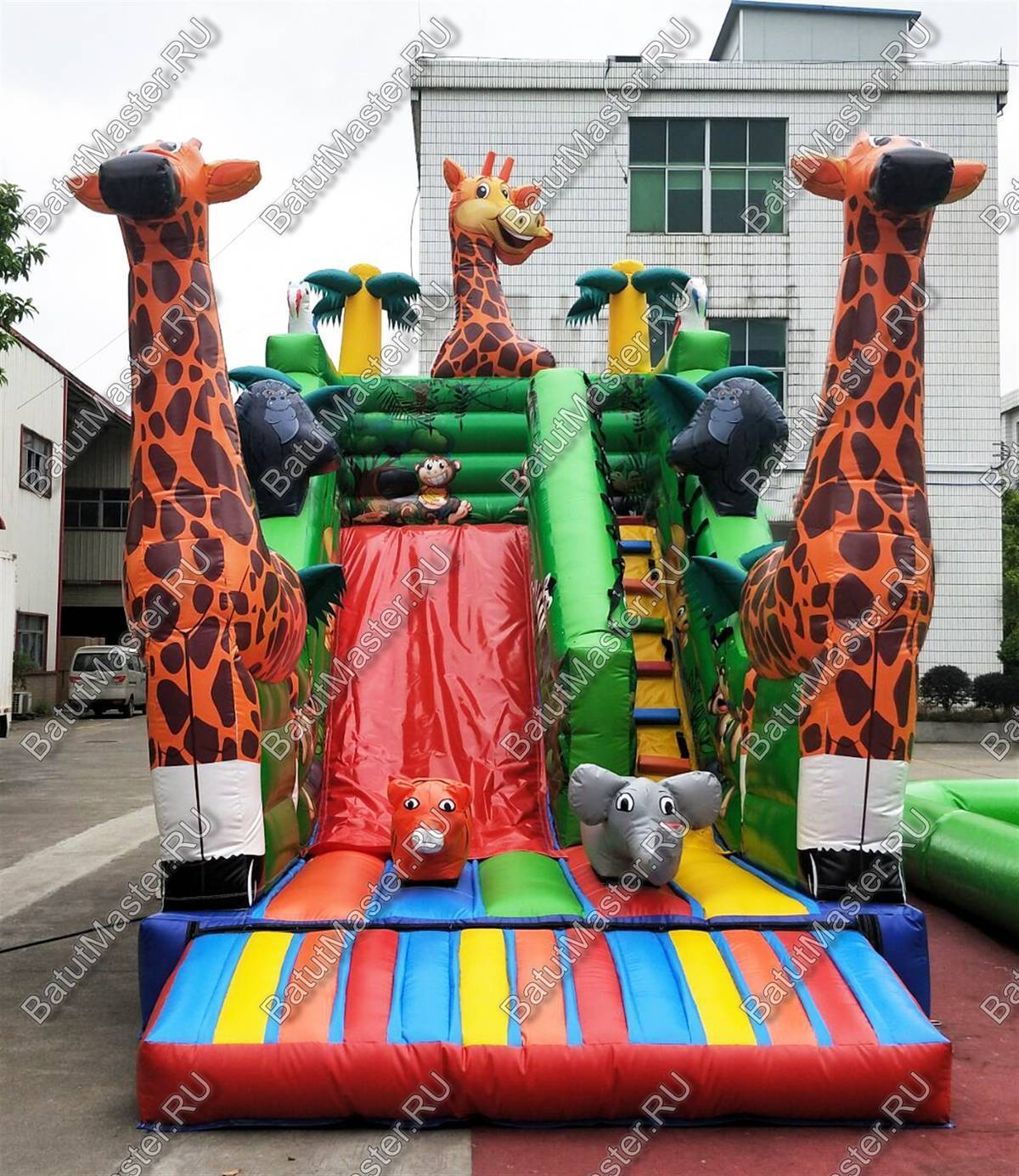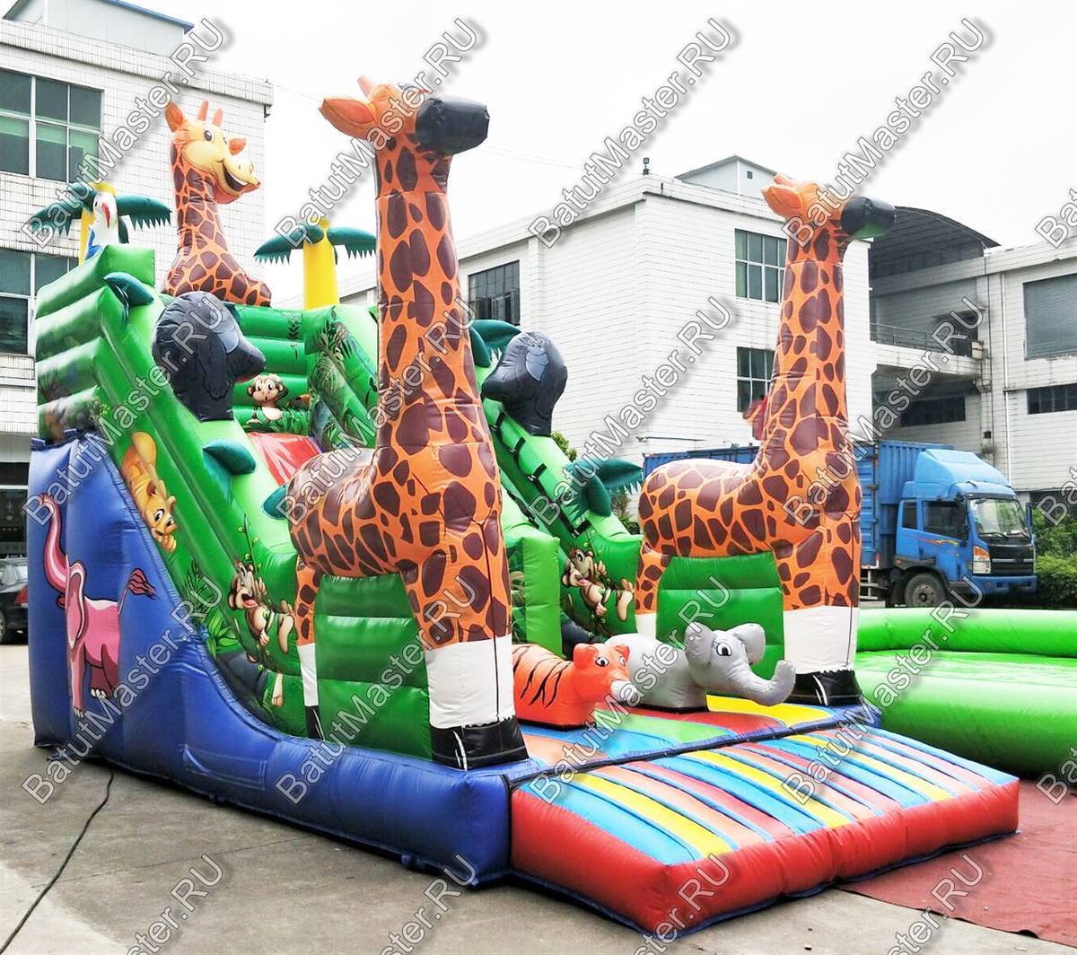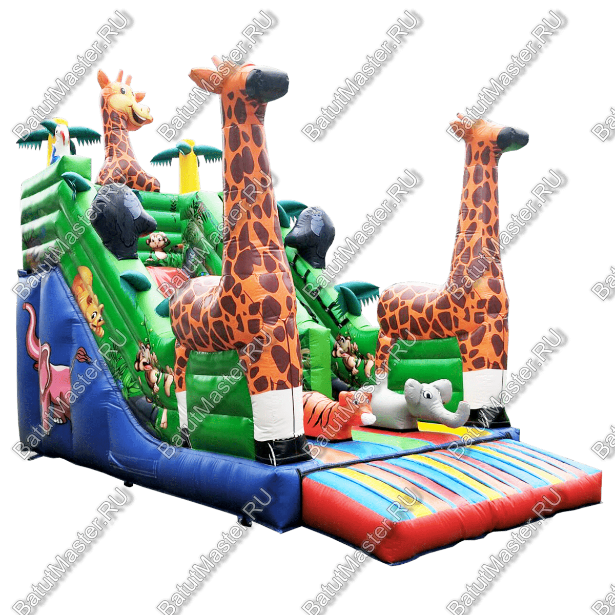 Добро пожаловать в гости к веселым жирафам! Современный и яркий надувной батут с большими фигурами тропических животных с радостью встретит маленьких непосед. Здесь имеется средняя по высоте горка, подъем с мягкими ступеньками, а также небольшие надувные модули для детей в виде слоника и бегемота. На заднем плане размещены пальмы, улыбающийся жираф и надувные обезьянки. Здесь имеется достаточное место для торможения, а также зона для прыжков. После спуска прыжки, снова подъем и так до бесконечности, ведь играть на данном батуте никогда не надоест. Веселиться тут можно всей дружной командой, забираться на животных и мягко приземляться на надувную основу батута. Спереди комплекс полностью открыт, а значит дети всегда будут на виду у своих родителей. Комплекс подходит для бизнеса. Станет прекрасным дополнением детской игровой комнаты в торгово-развлекательном центре или гостинице. Простой и не прихотливый в уходе. Собирается и разбирается за считанные минуты, благодаря наличию современного оборудования. Занимает небольшую площадь при достаточно интересном оснащении игровыми элементами. Коммерческий батут формирует силу и выносливость у детей на раннем этапе развития.