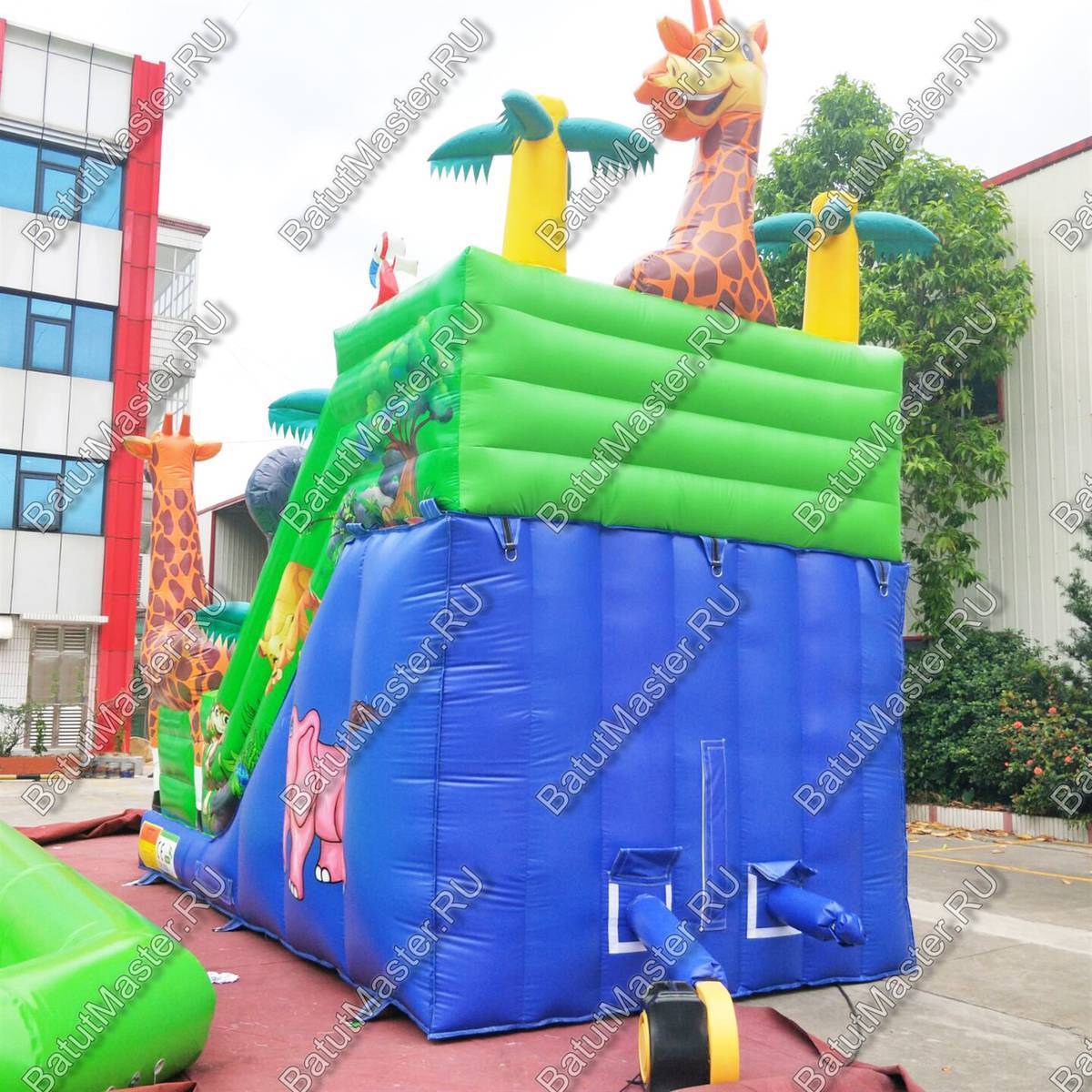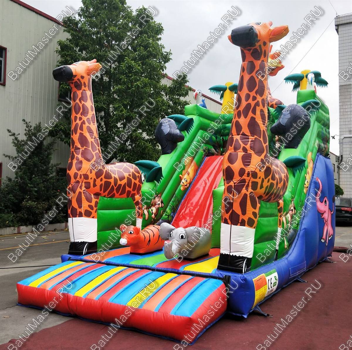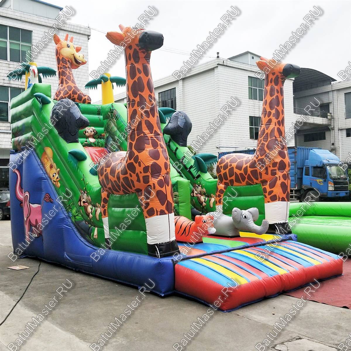 Добро пожаловать в гости к веселым жирафам! Современный и яркий надувной батут с большими фигурами тропических животных с радостью встретит маленьких непосед. Здесь имеется средняя по высоте горка, подъем с мягкими ступеньками, а также небольшие надувные модули для детей в виде слоника и бегемота. На заднем плане размещены пальмы, улыбающийся жираф и надувные обезьянки. Здесь имеется достаточное место для торможения, а также зона для прыжков. После спуска прыжки, снова подъем и так до бесконечности, ведь играть на данном батуте никогда не надоест. Веселиться тут можно всей дружной командой, забираться на животных и мягко приземляться на надувную основу батута. Спереди комплекс полностью открыт, а значит дети всегда будут на виду у своих родителей. Комплекс подходит для бизнеса. Станет прекрасным дополнением детской игровой комнаты в торгово-развлекательном центре или гостинице. Простой и не прихотливый в уходе. Собирается и разбирается за считанные минуты, благодаря наличию современного оборудования. Занимает небольшую площадь при достаточно интересном оснащении игровыми элементами. Коммерческий батут формирует силу и выносливость у детей на раннем этапе развития.