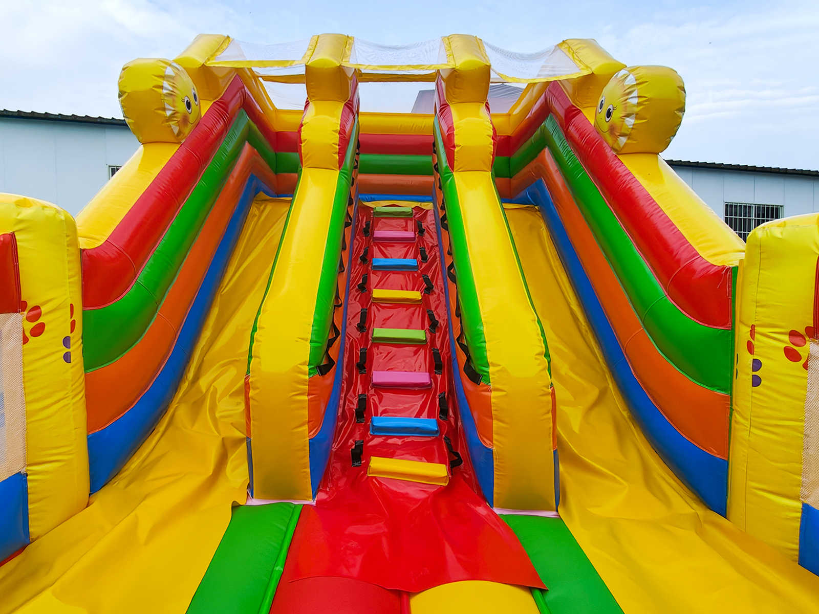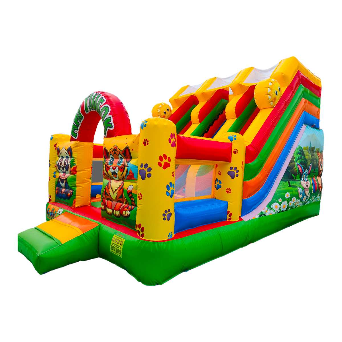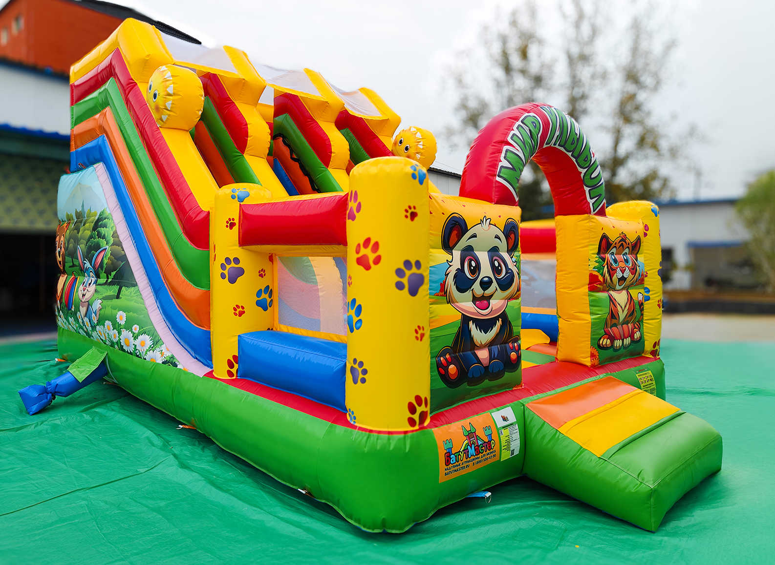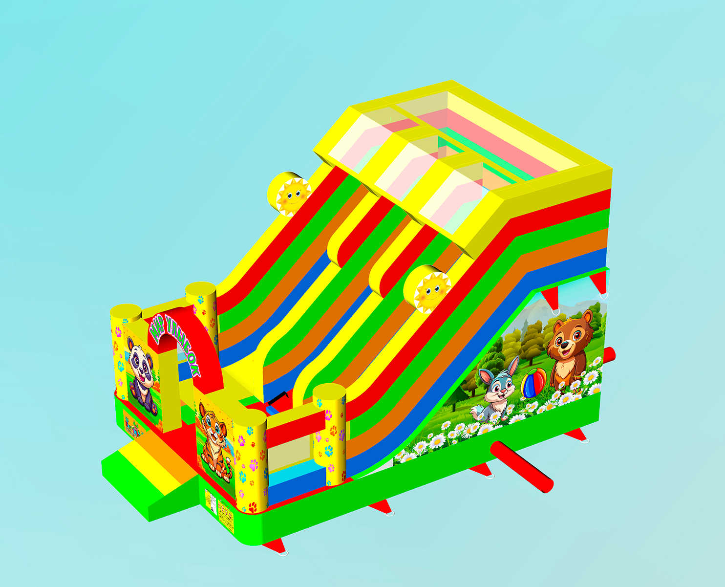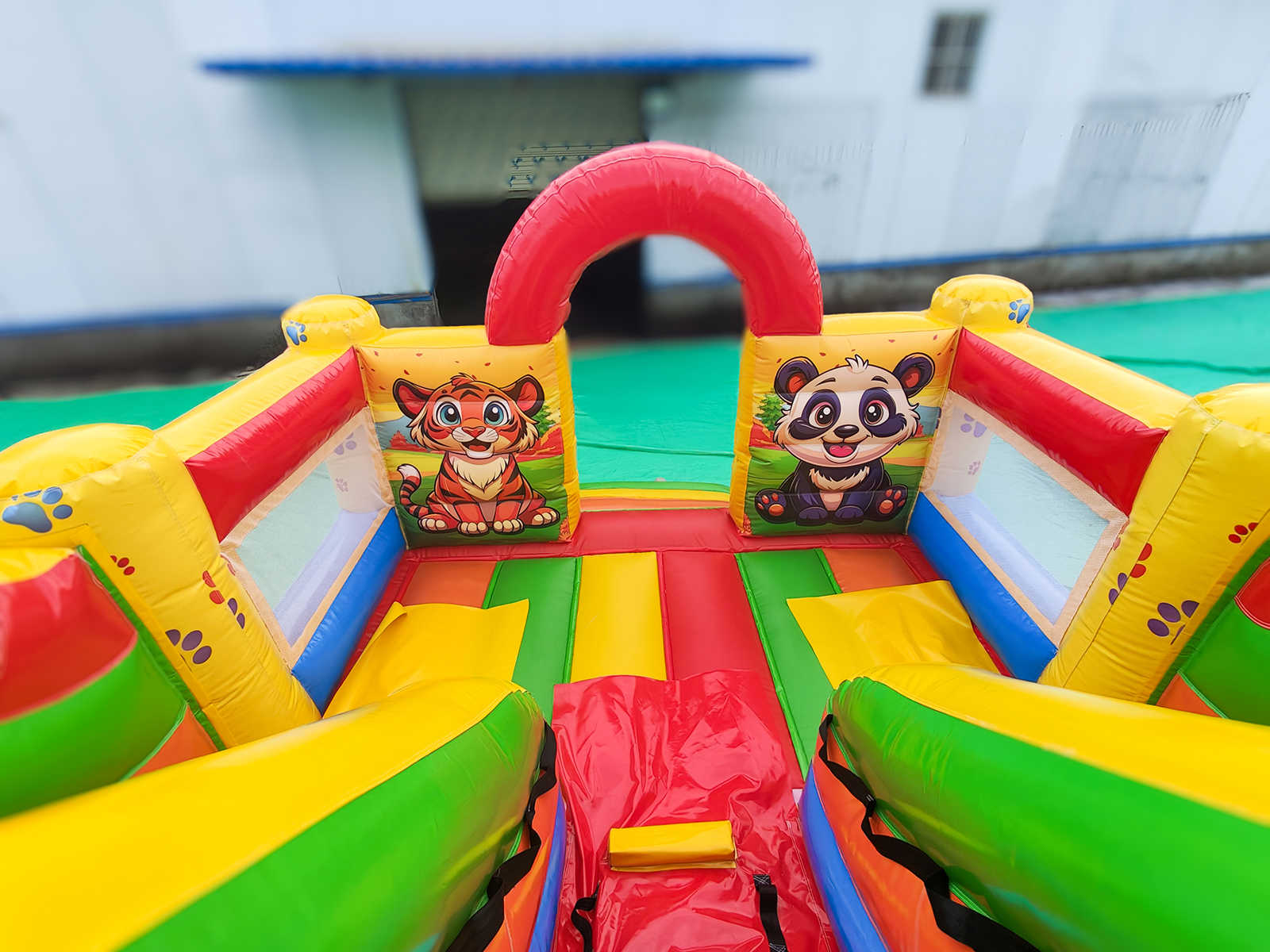 Надувной батут-горка «Зверята-непоседы» — это коммерческий аттракцион, который сразу выделяется среди конкурентов благодаря яркому дизайну, милым мультяшным персонажам (панда, тигр, зайчик), насыщенным цветам и оригинальной конструкции. Его размеры — 6x4x4.5 м — обеспечивают пространство для активных игр, прыжков, лазанья и скатываний, а вместимость до 7 детей одновременно делает его идеальным решением для больших праздников, фестивалей, парков развлечений, детских площадок, торговых центров или даже частных мероприятий.