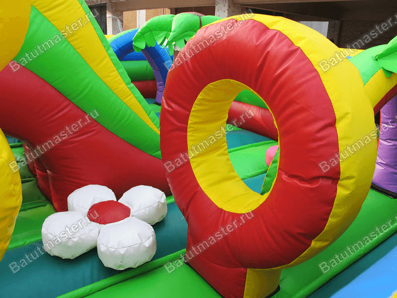В центре красочного батута установлена небольшая горка, немного позади нее – почти настоящие пальмы из ПВХ, по сторонам – желтые яркие улитки. Аттракцион не имеет сложных конструкций или спусков для детей более старшего возраста, поэтому пребывание на батуте будет безопасно даже для малышей и для тех, кто впервые знакомится с надувными площадками.