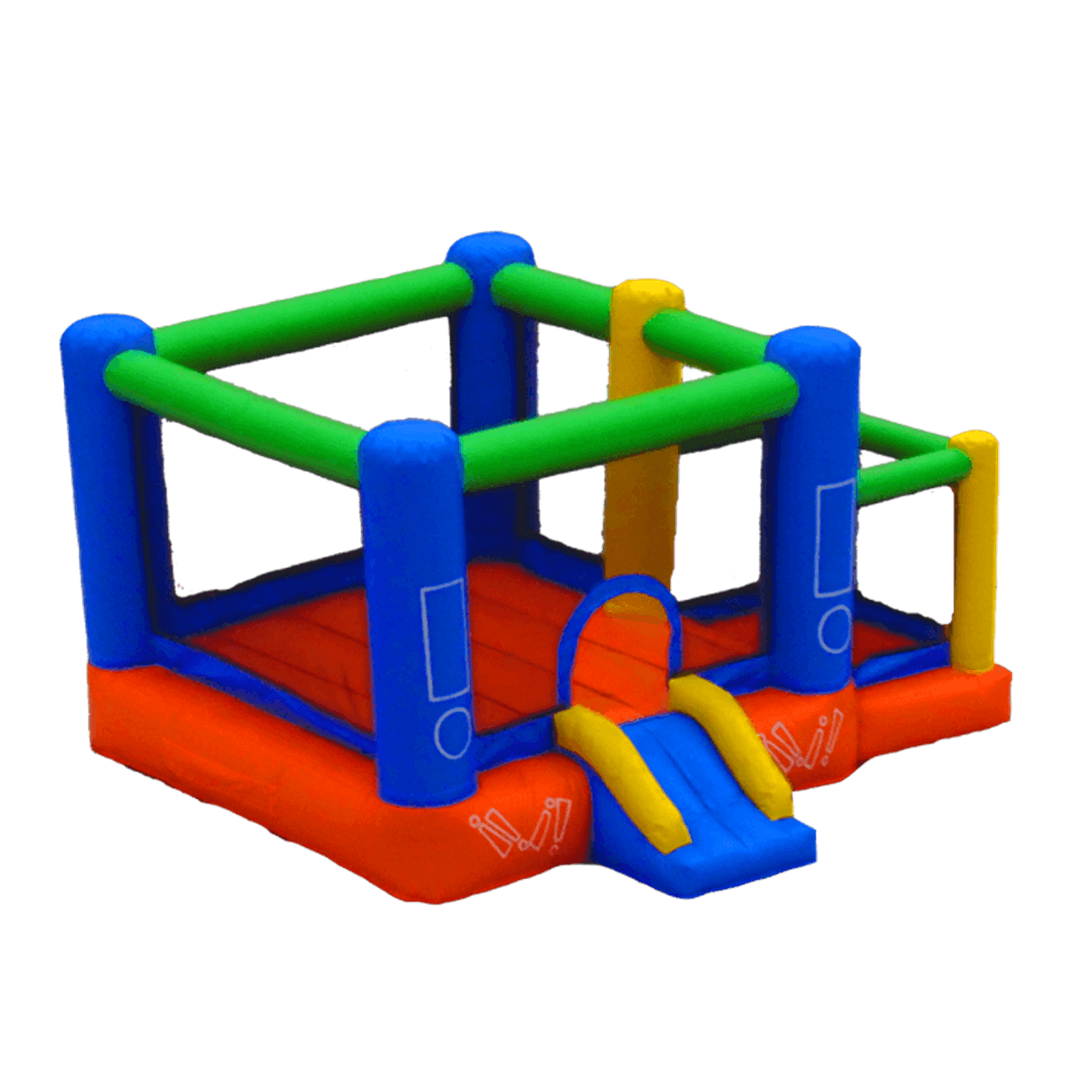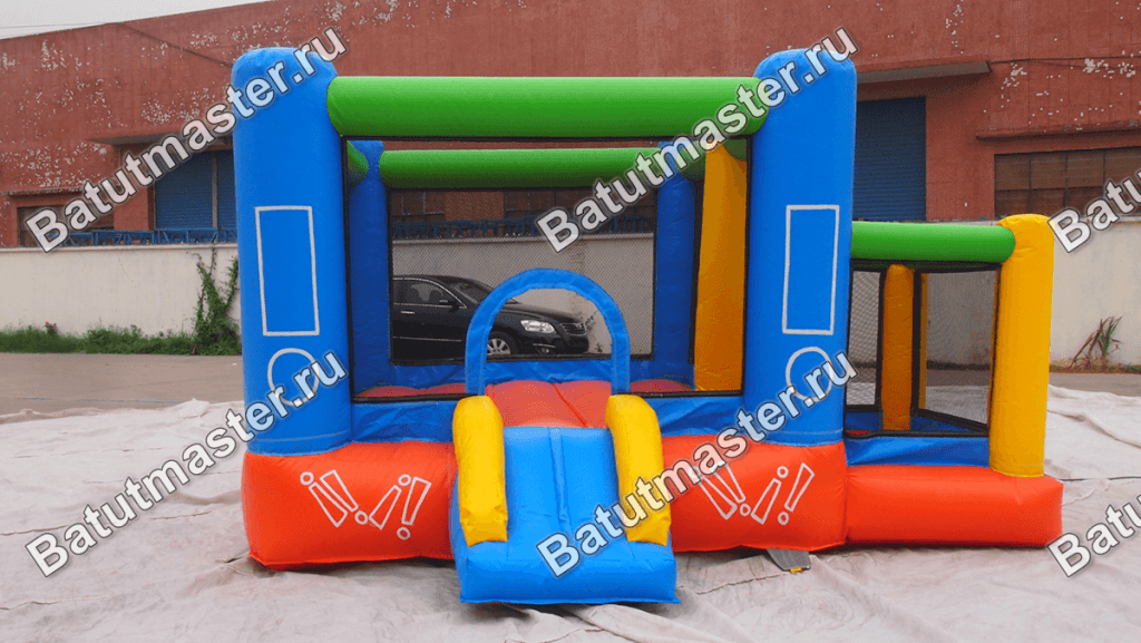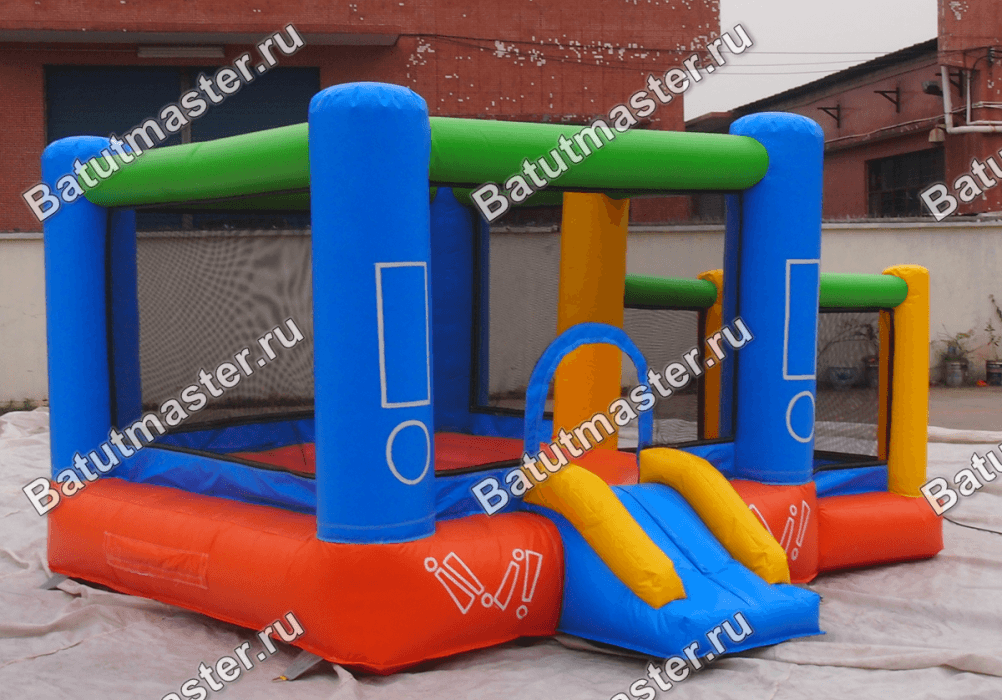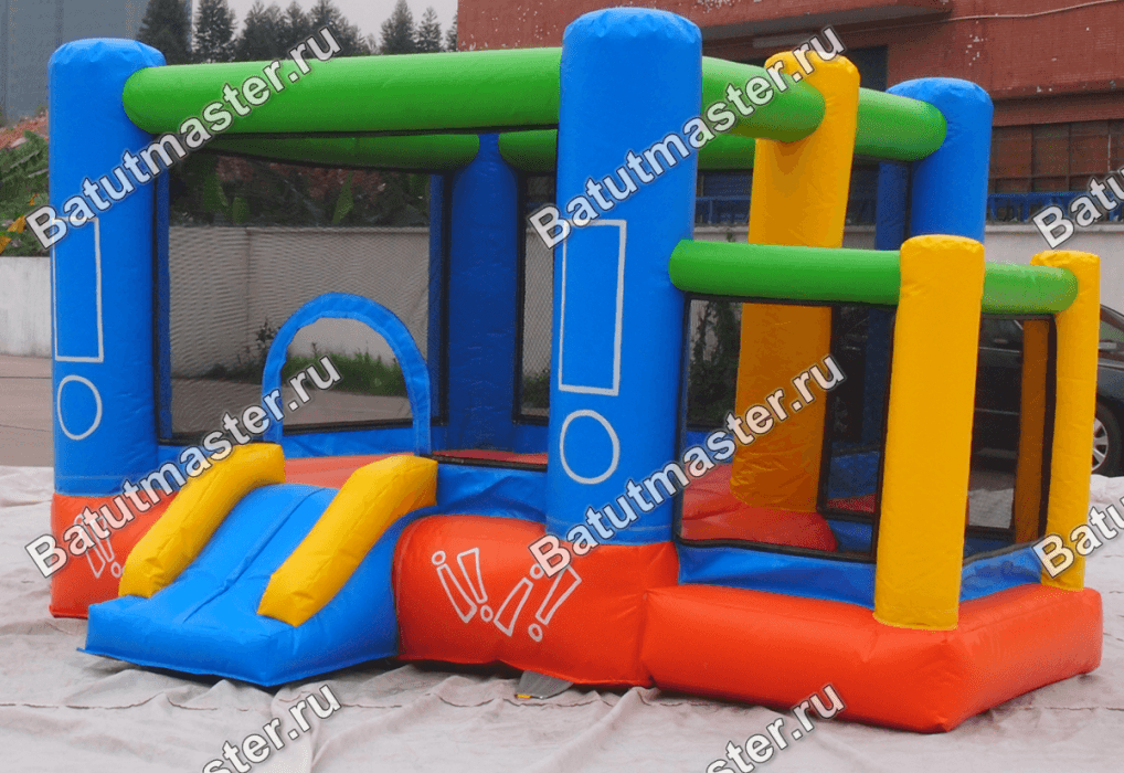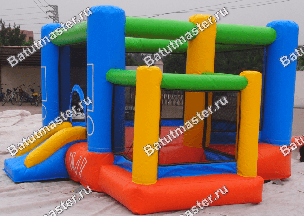 Наземный батут для самых маленьких и тех, кто еще пока мало знаком с надувными развлечениями имеет геометрическую форму настоящего кубика с разноцветными частями. Основная его часть в виде квадратной площадки оборудована некрутым подъемом и аркой, именно через них ребенок попадает в куб из прозрачных стен и голубых опор-столбов, которыми оснащен каждый угол. Нижняя подушка яркого батута сшита из красного надежного поливинилхлорида, а по самому верху проходят горизонтальные зеленые брусья.