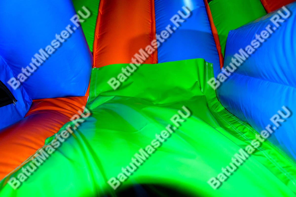С правой стороны надувного батута располагается зеленая горка с синей боковой лестницей, а все остальное пространство можно использовать в качестве площадки для бега и прыжков. Аттракцион полностью открытый сверху, а по верхнему периметру установлены веселые головы зеленых динозавров. Стенки конструкции изготовлены из прозрачной нейлоновой сетки, поэтому они полностью прозрачные и позволяют родителям наблюдать за развлечениями своих детей.
