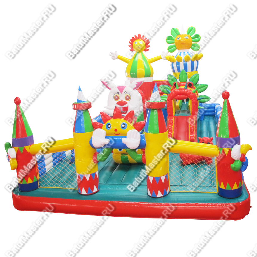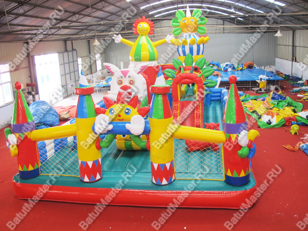 Внутри надувного батута детей ждёт множество развлечений: игровые фигуры и элементы в виде растений и животных, лесенки, тоннели и горки.