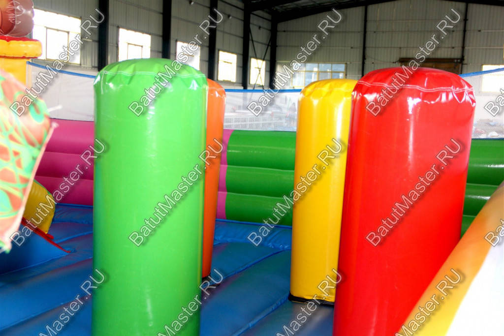 По-летнему яркий батут с множеством надувных обитателей подойдет для игр и забав самых маленьких посетителей. Сейчас даже сложно представить насколько малыш будет рад встретиться с мягкими птичками и героями из любимых мультиков. Как только ребенок войдет на площадку, его ожидает главное удовольствие этого надувного батута: уточка с открытым ртом, внутри которой поместилась небольшая горка. Все четыре стены аттракциона ограждены мягким забором из разноцветных секторов, а в каждом углу установлены опоры с головами в виде ромашек с розовыми лепестками.
