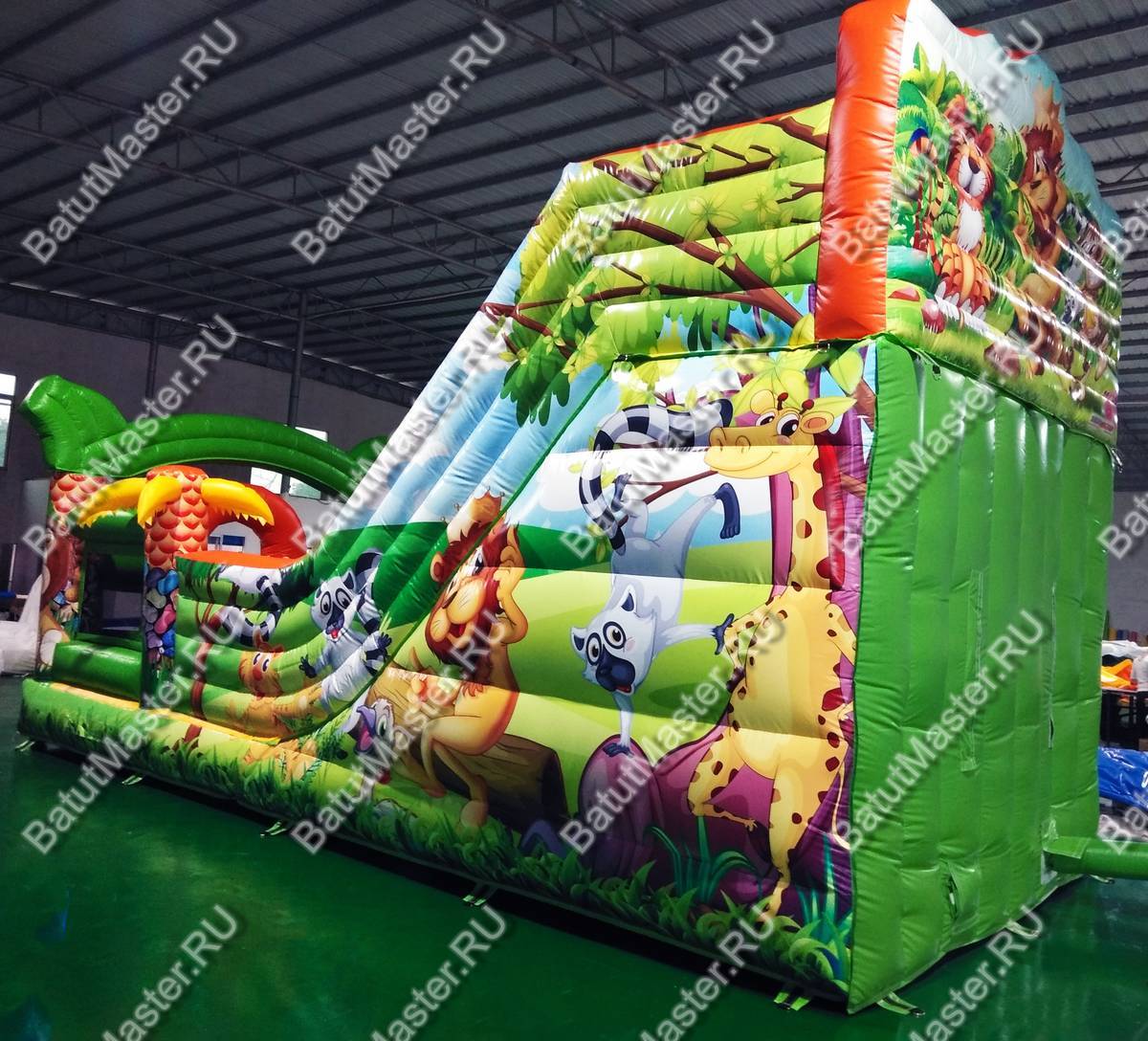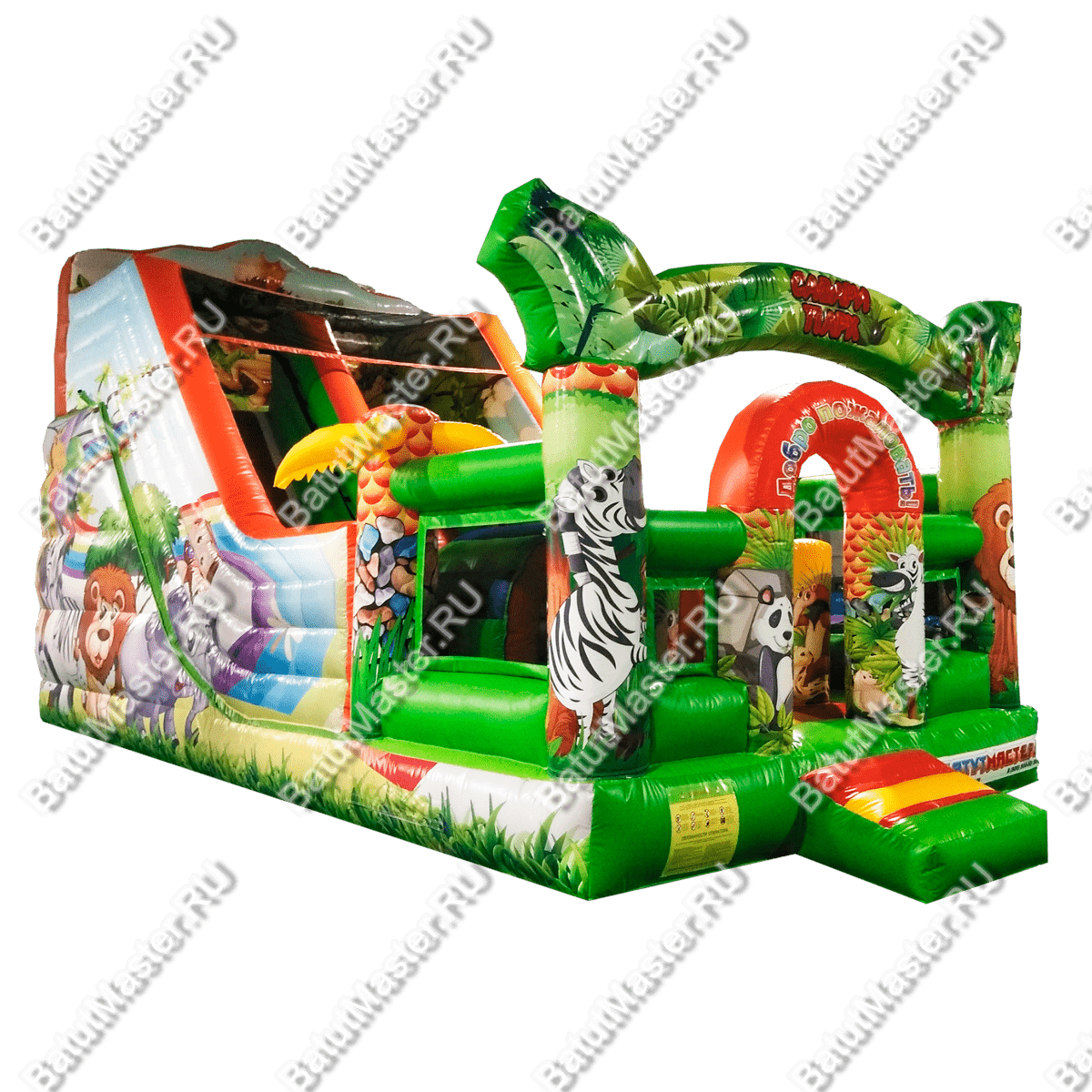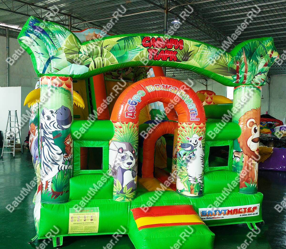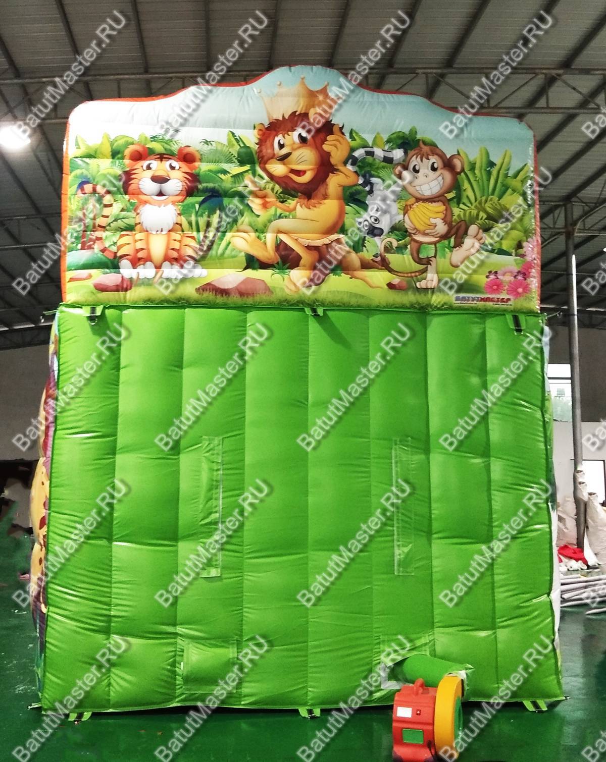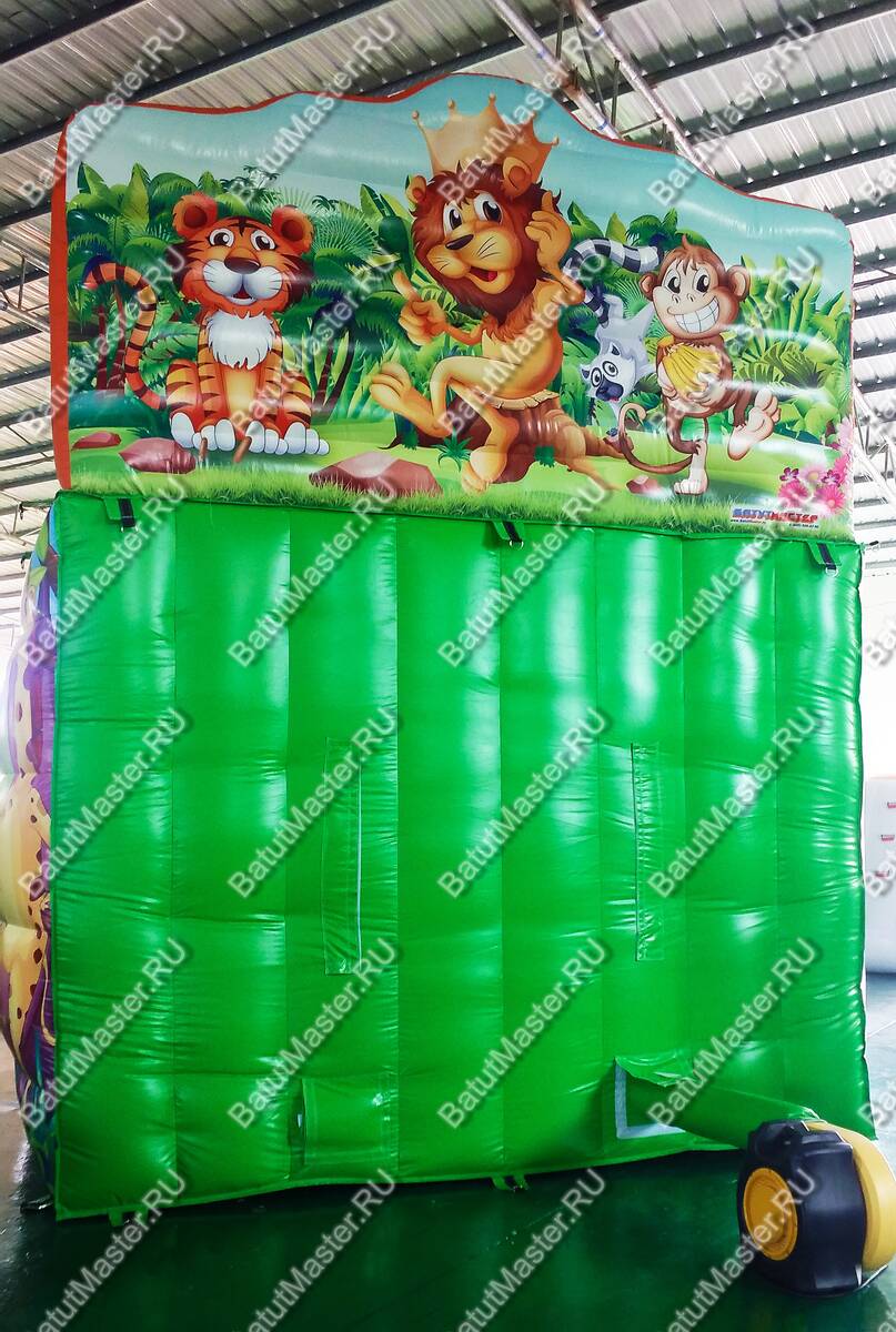 Украшением батута являются надувные пальмы и яркие красочные изображения животных саванны. Для того, чтобы забраться наверх, им необходимо будет преодолеть мягкие удобные ступеньки, по которым следует двигаться на четвереньках, и при этом приложить не мало усилий.