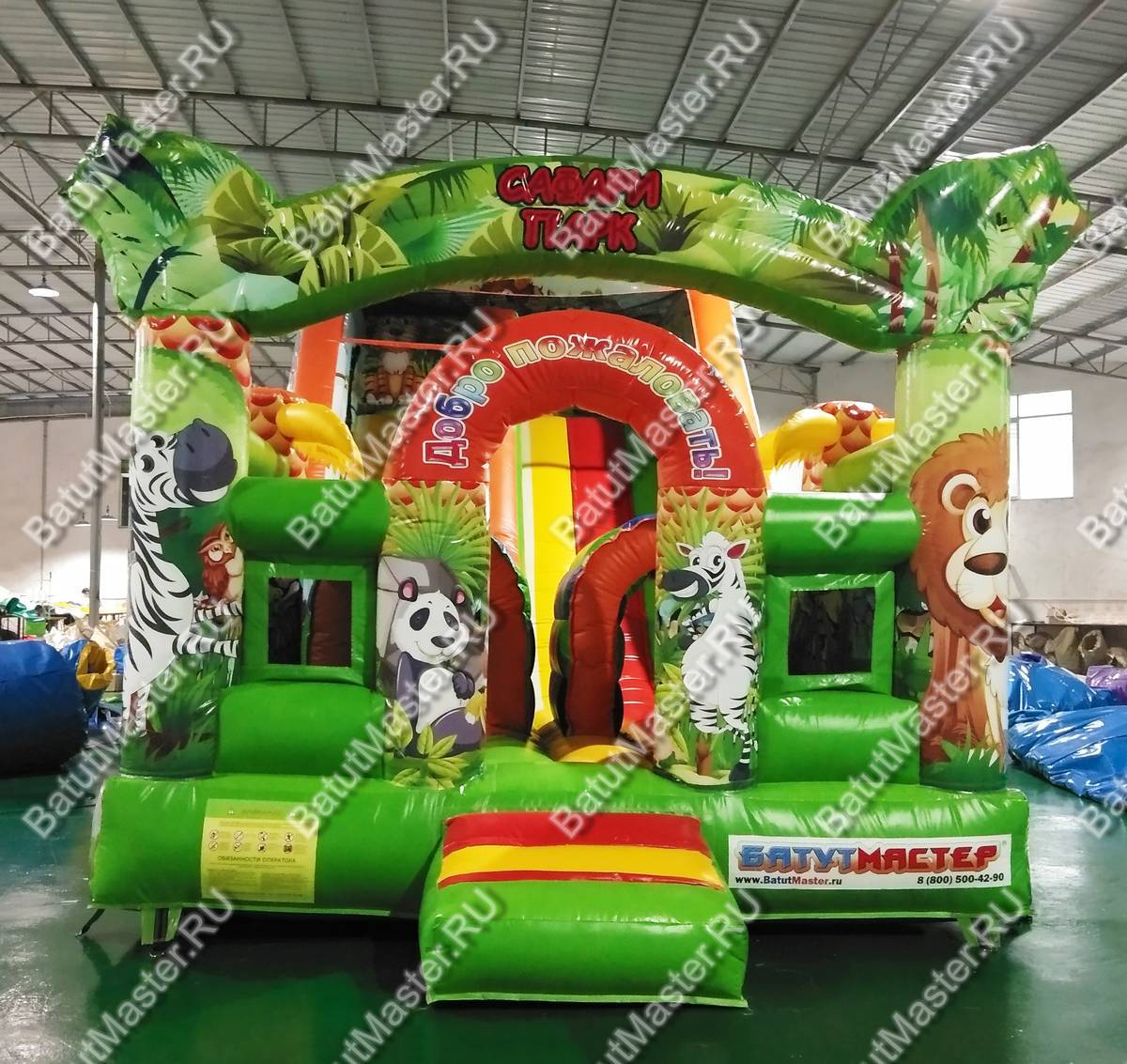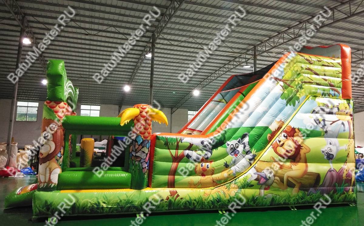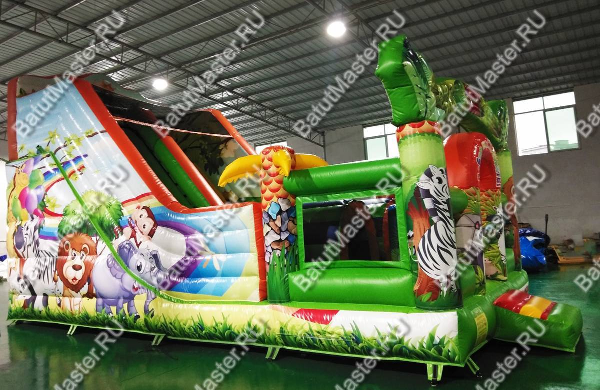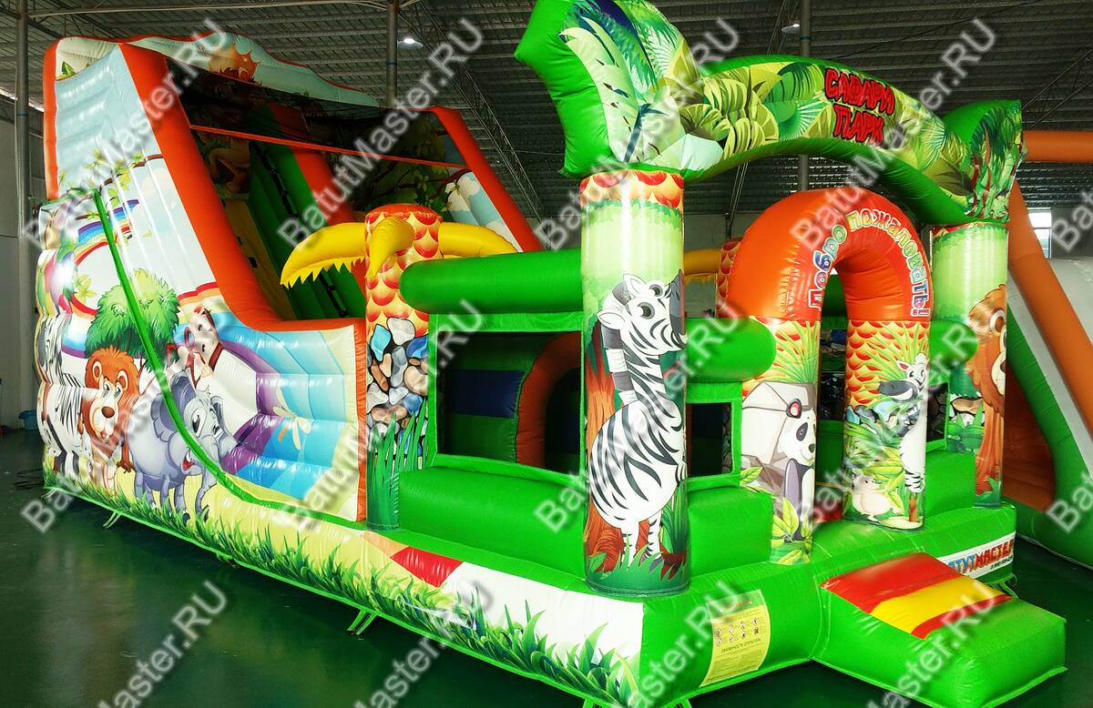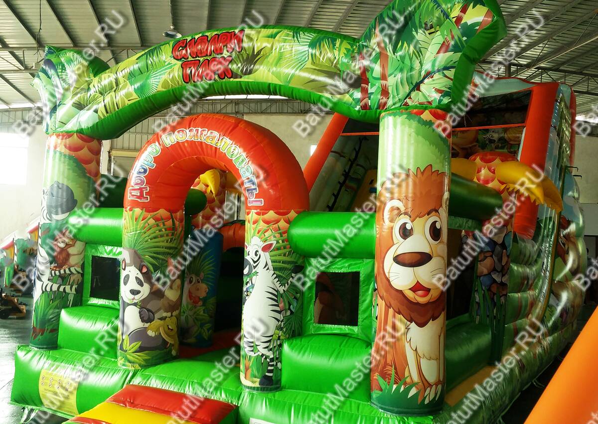 Играть, резвиться и прыгать дружной компанией дети смогут на батуте «Мир сафари». Функциональный, интересный и современный комплекс оснащен горкой, разнообразными надувными фигурами животных и большим прыжковым полем. По всему периметру он защищен надувными стенками с небольшими окошками из прочной сетки. Спускаясь с горки, дети приземляться на просторное прыжковое поле. Здесь можно отталкиваться от надувных стенок, подлетать вверх, кувыркаться и придумывать различные игры.