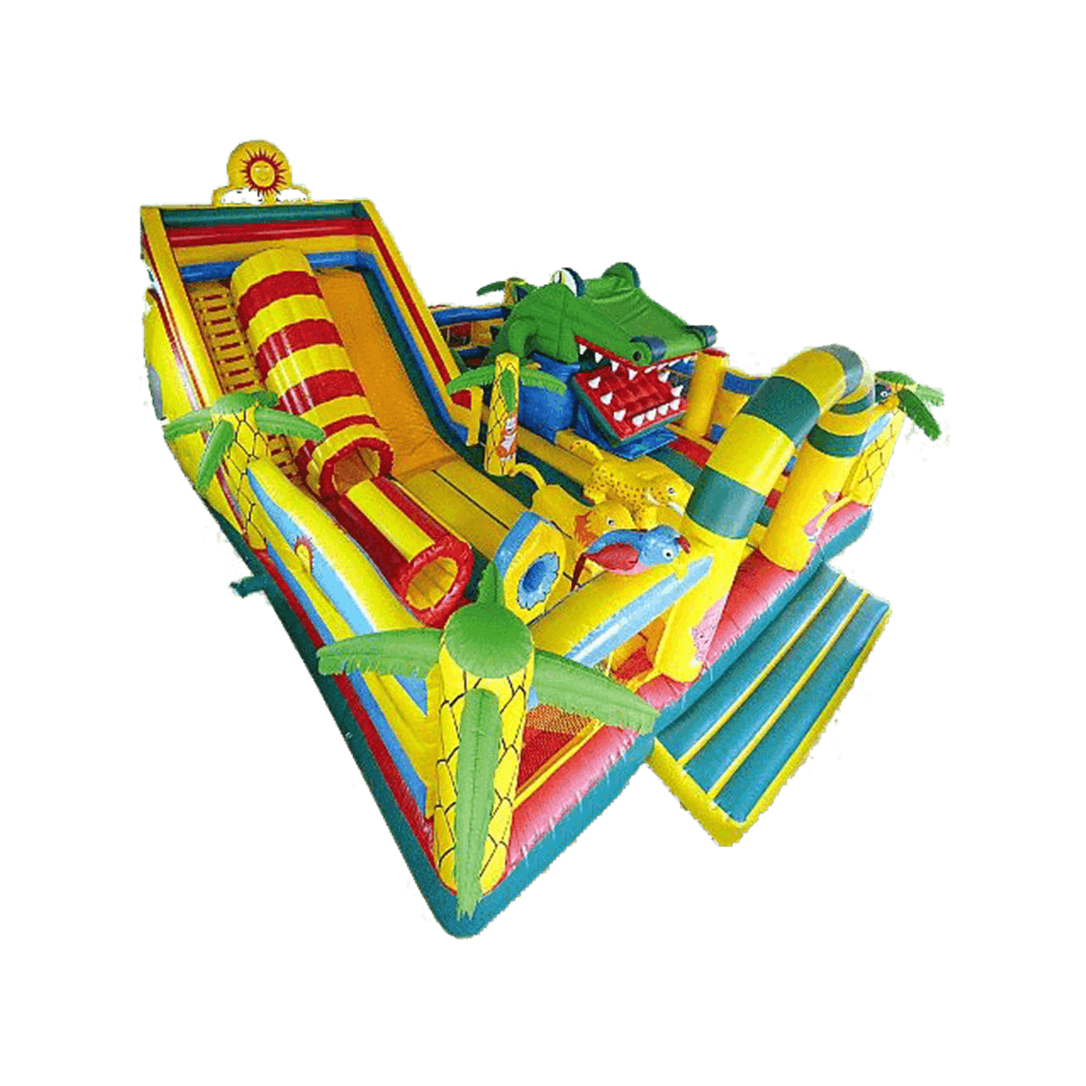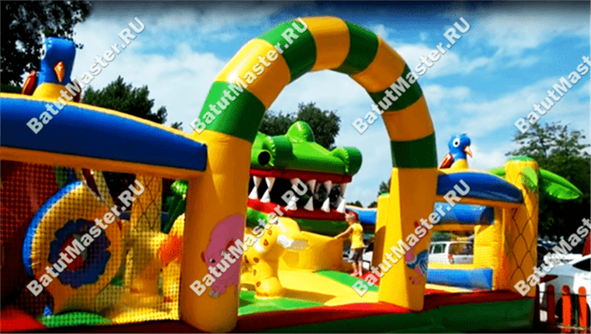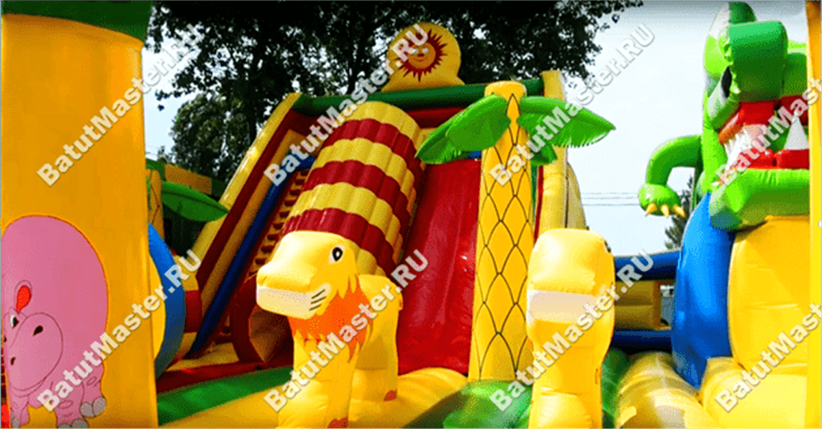 Именно этот надувной батут нельзя спутать ни с одним другим аттракционом из ПВХ. Его яркость и насыщенность красок впечатляет, а множество различных фигур позволяет посетителям обязательно найти именно свое увлечение. Все важные части коммерческого батута выполнены не из однотонного ПВХ, а из полосатого, и преимущественно основная часть – это желтый цвет, а второстепенная – красный или синий.