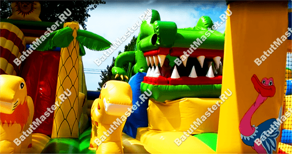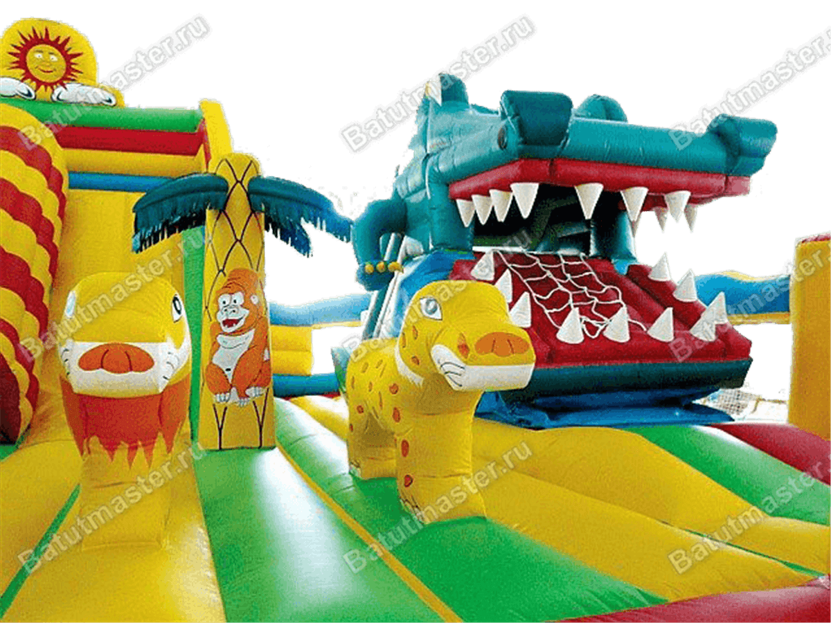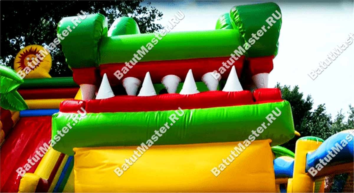 Визуально площадка разделена на 2 части: правая занята огромной горкой, в которой имеется не только простой спуск, но и в виде туннеля; левая часть яркого батута – это робот в виде огромной пасти крокодила. Для большей удобности в пасти хищного животного проложена веревочная сетка, за которую легко держаться и подниматься. Арка-вход выполнена тоже из полосок желтого и голубого ПВХ, а сразу за ней располагается пространство или площадка для прыжков, бега и игр. Из всего ограждения только фасадная сторона прозрачная, так как обтянута сеткой, остальные три – плотные и мягкий, изготовленные из ПВХ.