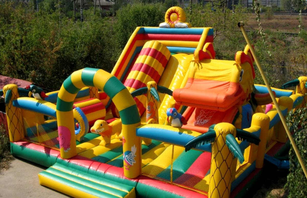 Надувной батут не имеет однотонной окраски, он будто соткан из разноцветных полос ПВХ (желтый, синий и красный). По всей территории можно найти достойное количество надувных птиц, а также улитку, тигра и пальмы в каждом углу. Отличная вместительность и максимальная проходимость поможет владельцу быстро отработать потраченные деньги и начать выстраивать собственный парк развлечений или обновлять имеющиеся модели.