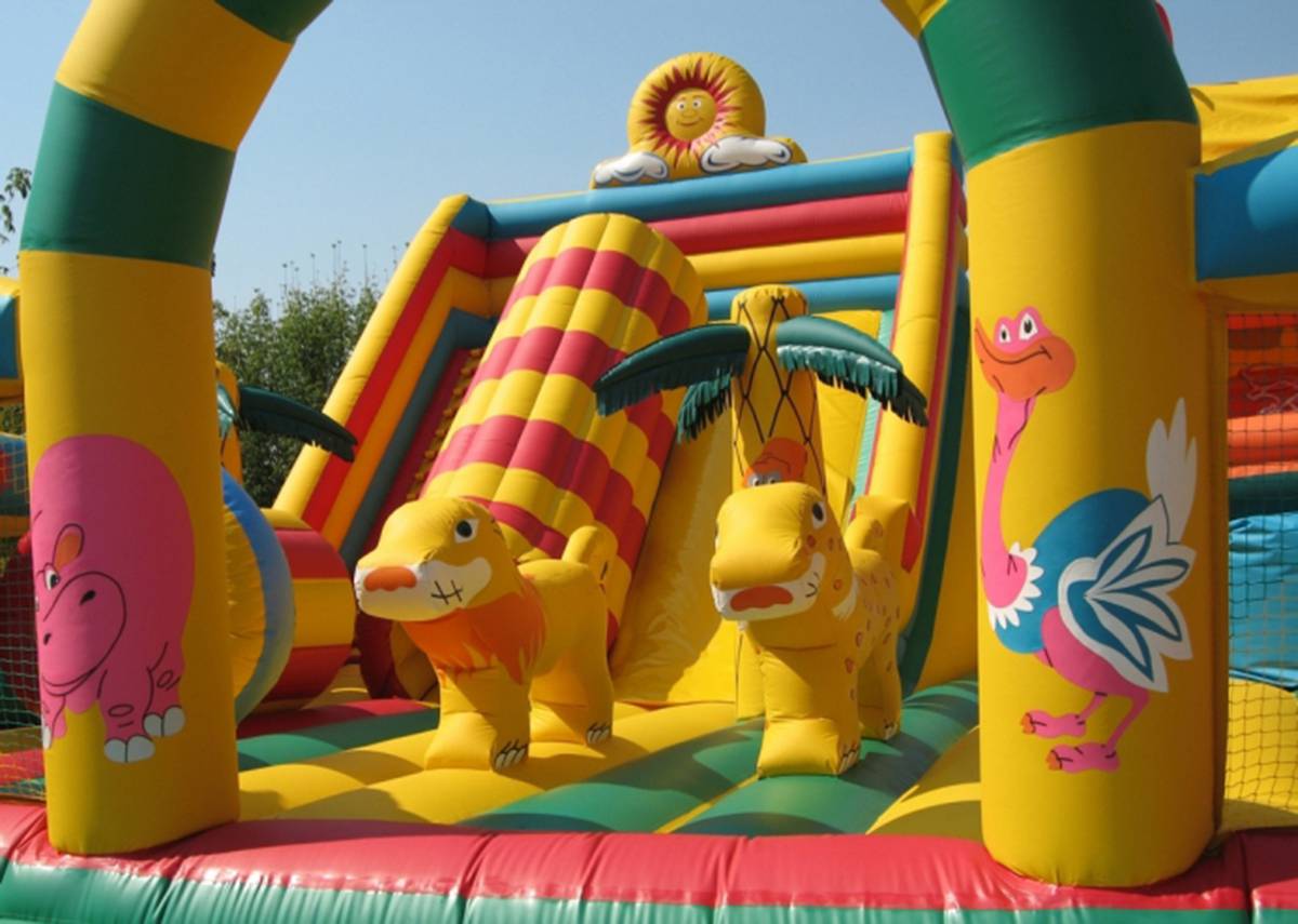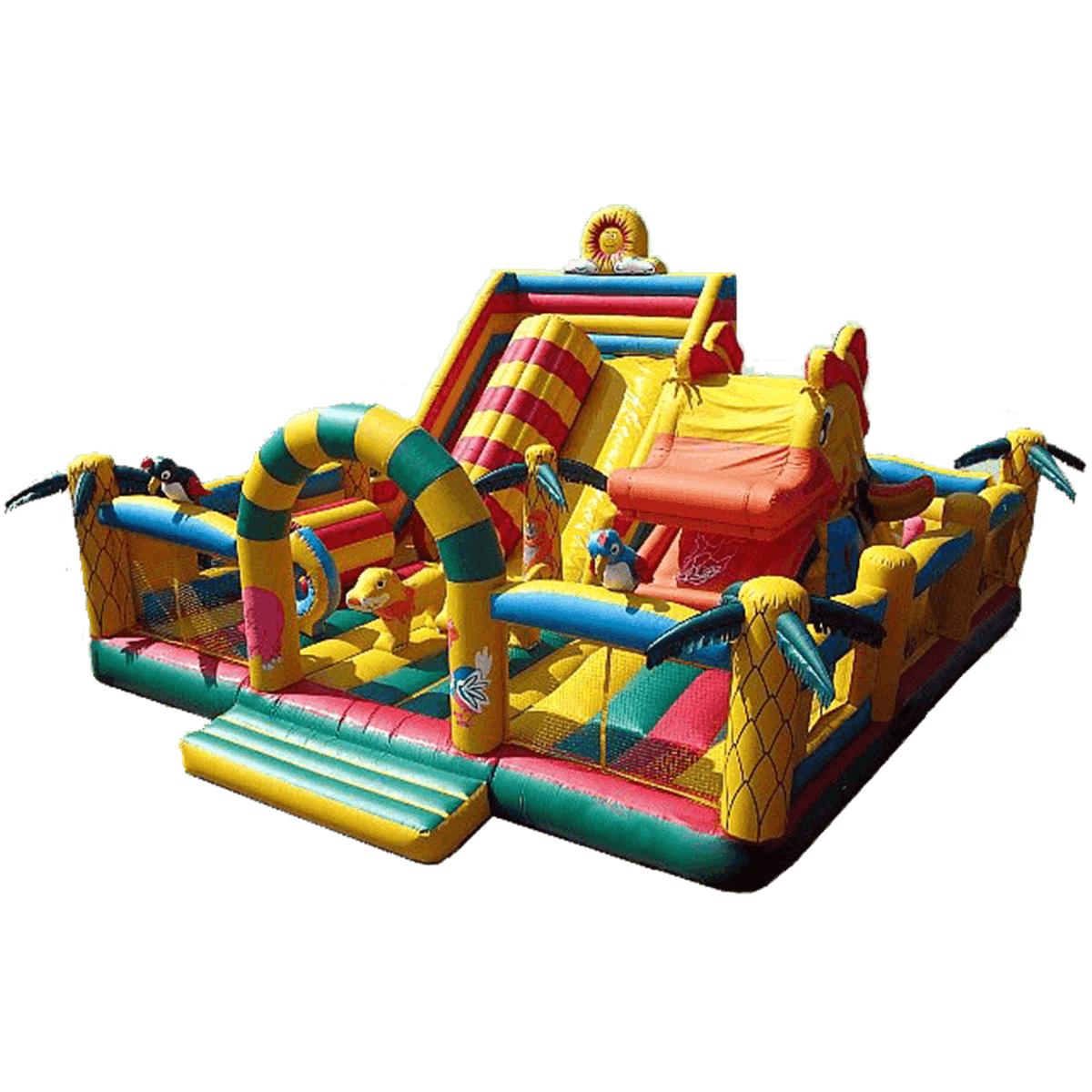 Большой тематичный комплекс с самыми интересными локациями непременно порадует мальчишек и девчонок! Надувной батут для невероятных приключений и незабываемых впечатлений ждет юных первооткрывателей. Он оснащен надувным кольцом, модулями в виде животных, пальмами, горкой и закрытым подъемом. Здесь интересно абсолютно все, но отдельно стоит отметить огромный надувной модуль в виде утки. Внутрь нее можно залазать, а потом спускаться с обратной стороны вниз. Понравится детям и большое поле для прыжков, где также можно играть и в другие активные игры. Каждый ребенок найдет себе занятие по душе и останется доволен. Веселиться можно здесь всей командой. По всему периметру батута имеется прочная сетка, таким образом родители смогут наблюдать за детьми. Коммерческий батут снаружи украшен пальмами, попугаями, здесь все напоминает сафари парк. Дети по достоинству оценят такой игровой батут, ведь здесь каждая деталь разработана для того, чтобы дети двигались и весело проводили время. Рассчитан для бизнеса. Выполнен из высококачественного ламинированного ПВХ. Комплекс не выгорает на солнце и не сжимается под действием низкой температуры. Простой и неприхотливый в уходе.
