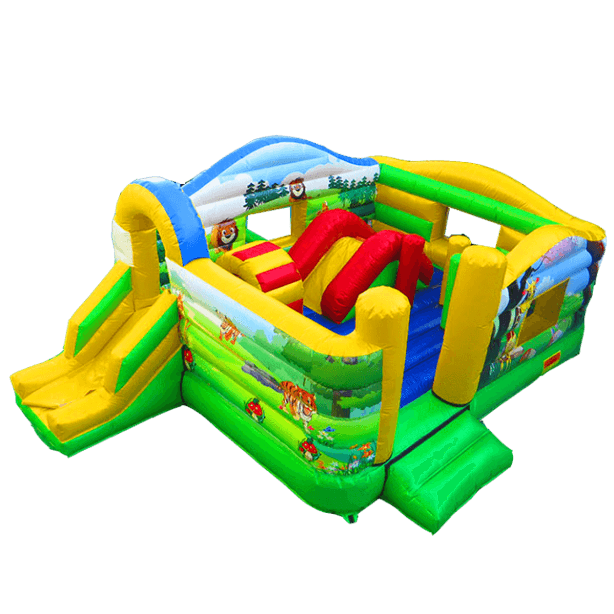 Надувной батут в виде яркой и пестрой мягкой комнаты из ПВХ собрал в себе самые летние цвета: желтый, зеленый, красный и синий. Конструкция открытая, но стены довольно высокие, в двух из них имеются прямоугольные оконные проемы, третья сторона оснащена надувной горкой, а четвертая помещает в себе вход. С внешней стороны яркий батут украшен изображениями дикой природы Африки, здесь можно увидеть тигров, львов, жирафов и других обитателей джунглей.