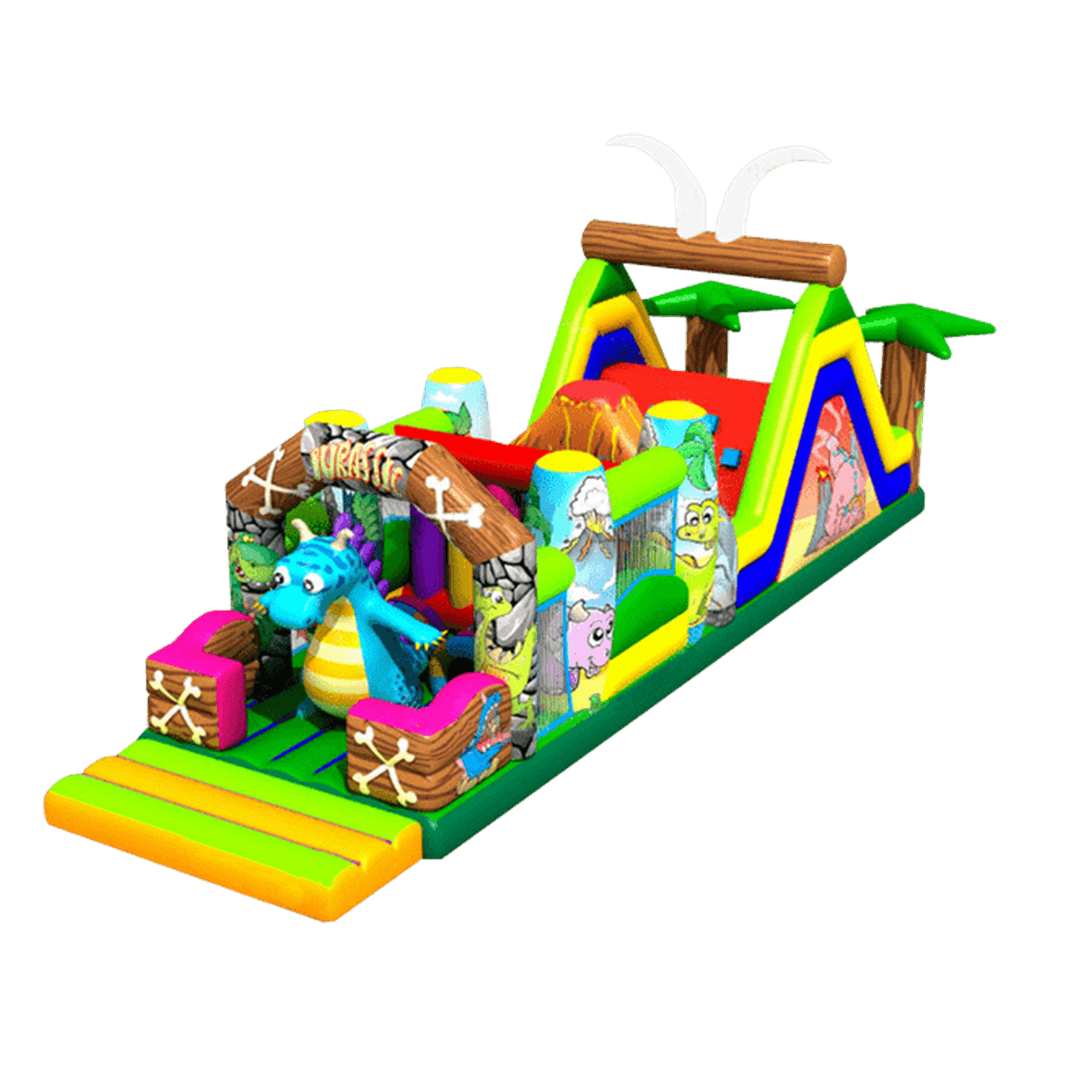 Коммерческий надувной батут для бизнеса «Поиграй с дракошей» представляет собой просторную площадку с полосой препятствий. Яркий и красочный коммерческий аттракцион пестрит фигурами доисторических животных, в частности динозаврами. В данном товаре может быть изменен цвет, изображения и размеры.