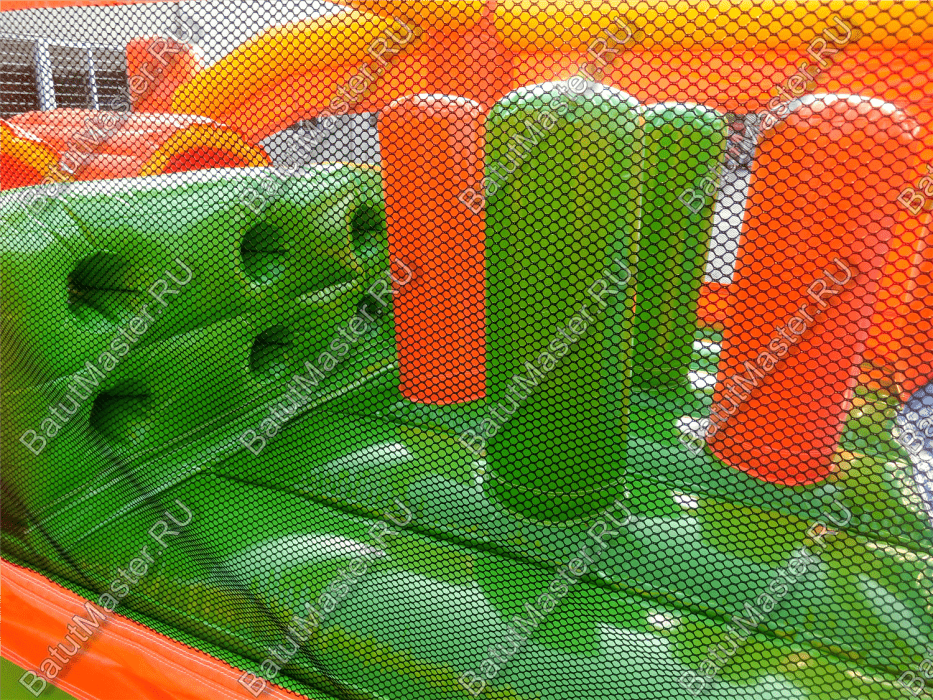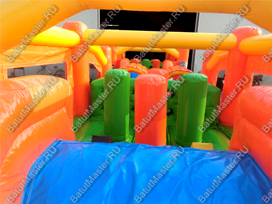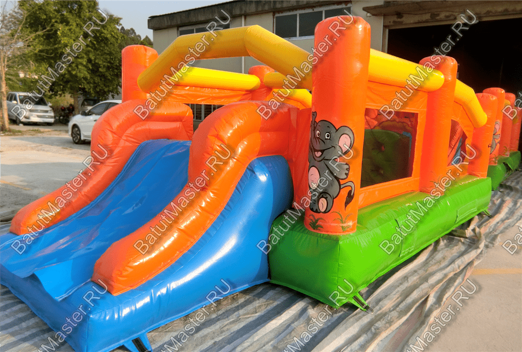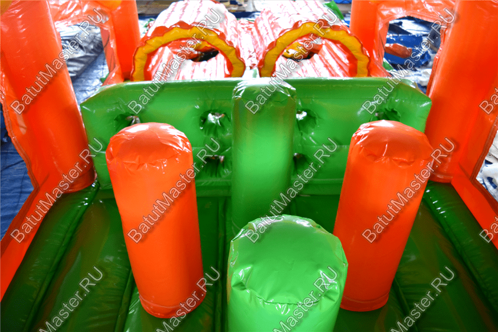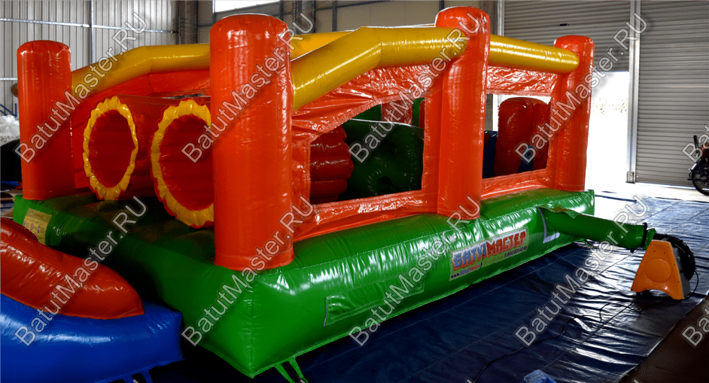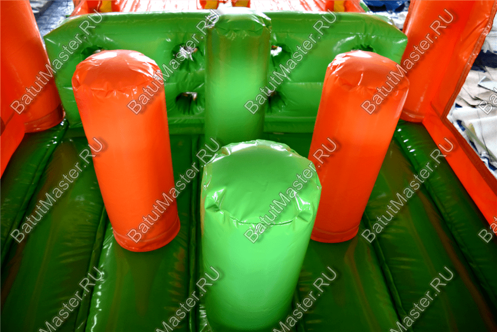 Надувные столбцы, напоминающие грушу, позволяют боксировать на них, что так любят делать мальчишки. Широкая горка располагает к тому, чтобы спуститься с ветерком всем вместе. Это арена для веселого времяпровождения.