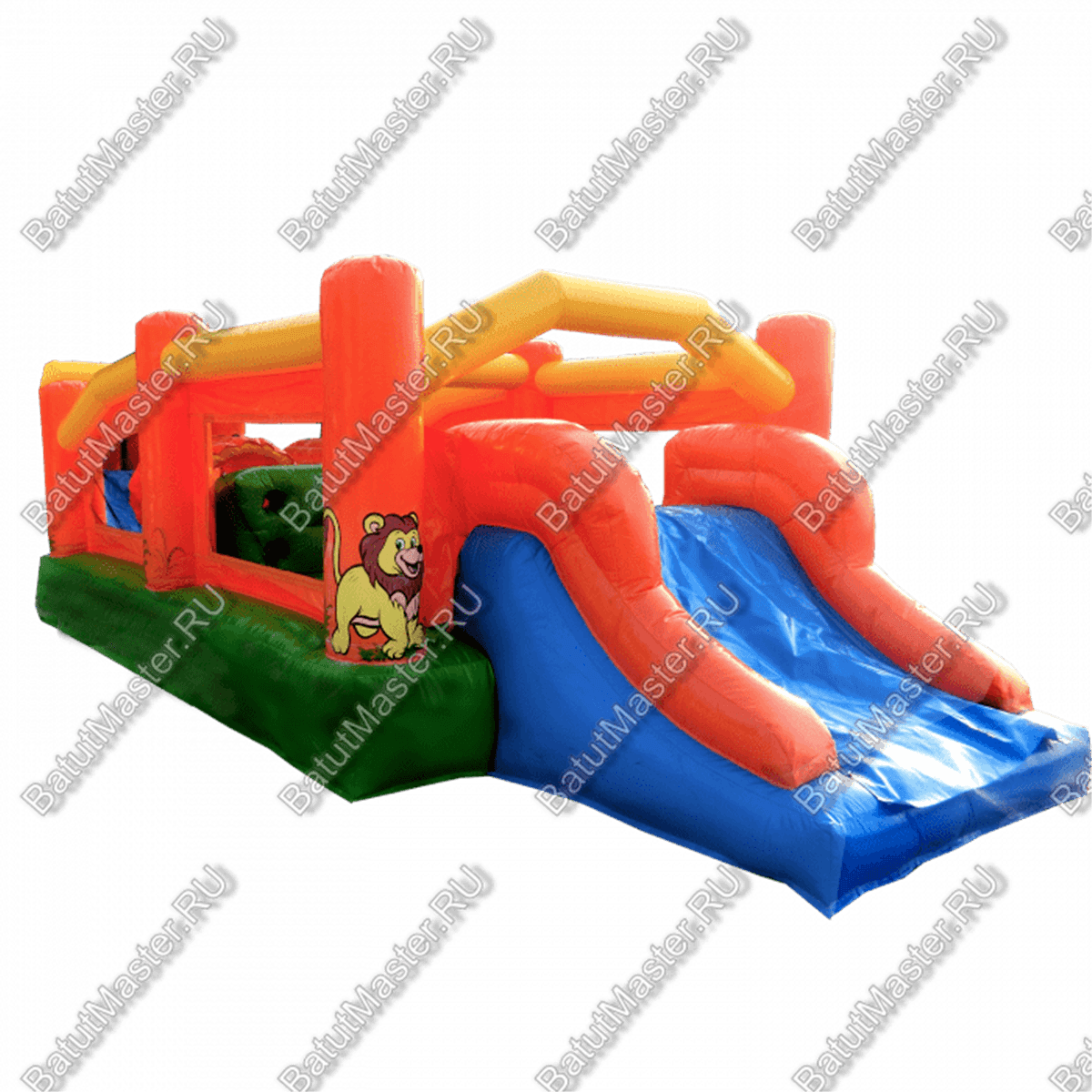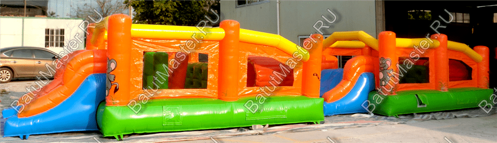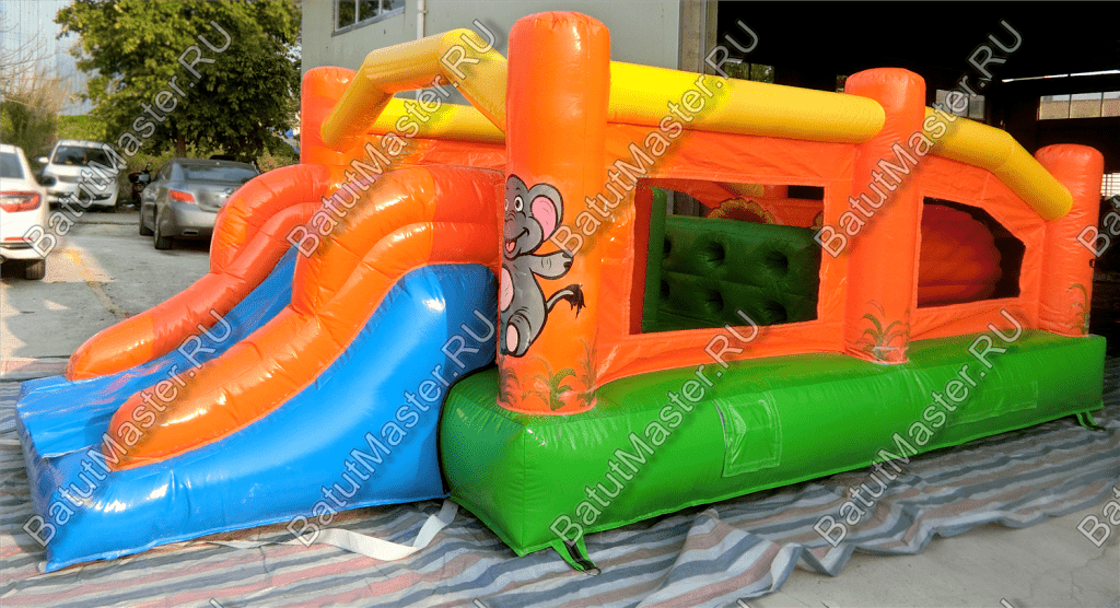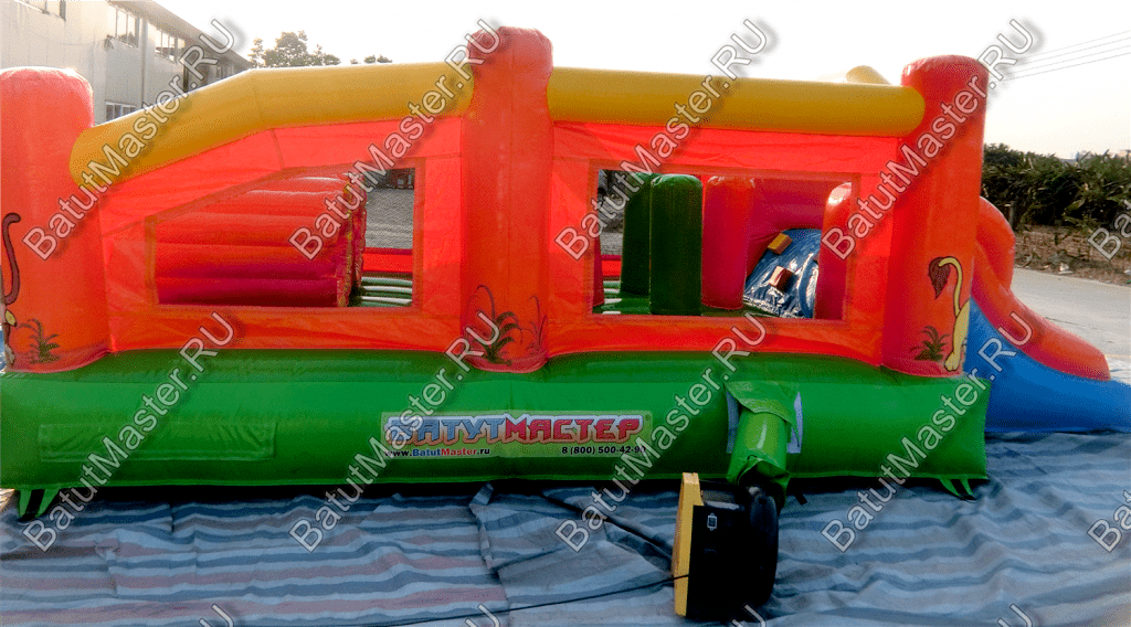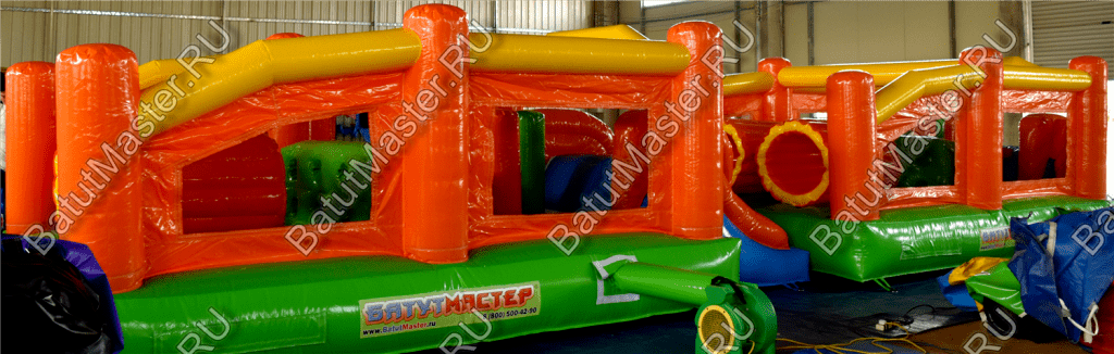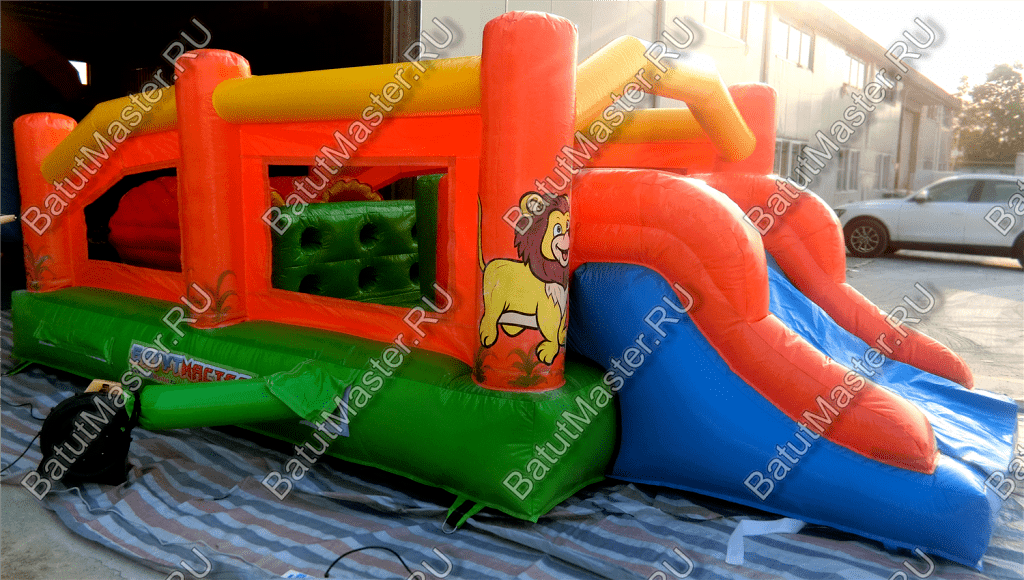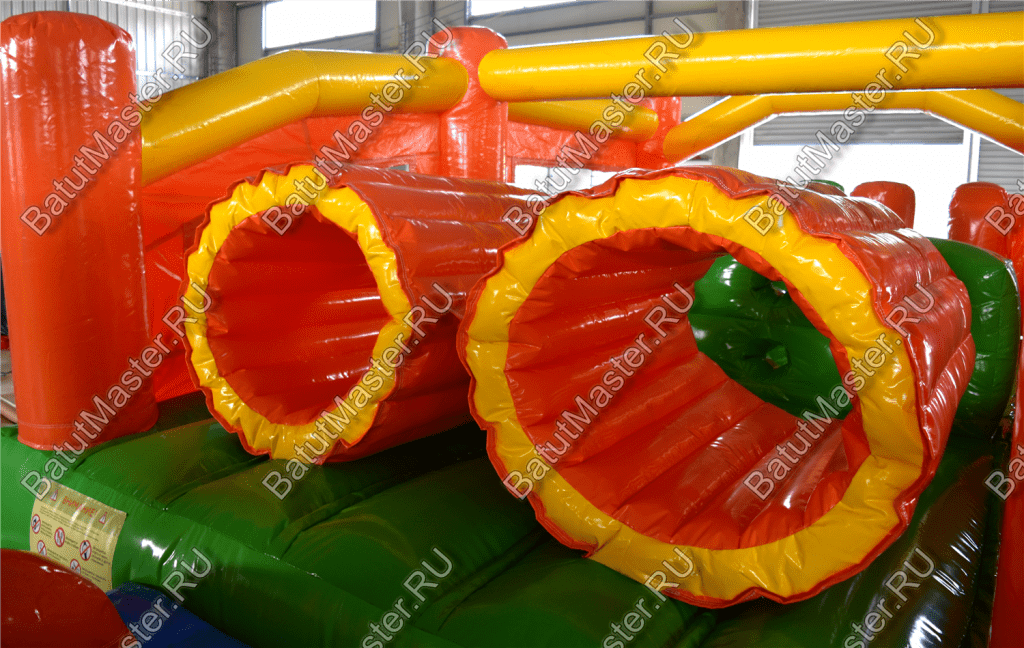 Надувные столбцы, напоминающие грушу, позволяют боксировать на них, что так любят делать мальчишки. Широкая горка располагает к тому, чтобы спуститься с ветерком всем вместе. Это арена для веселого времяпровождения.