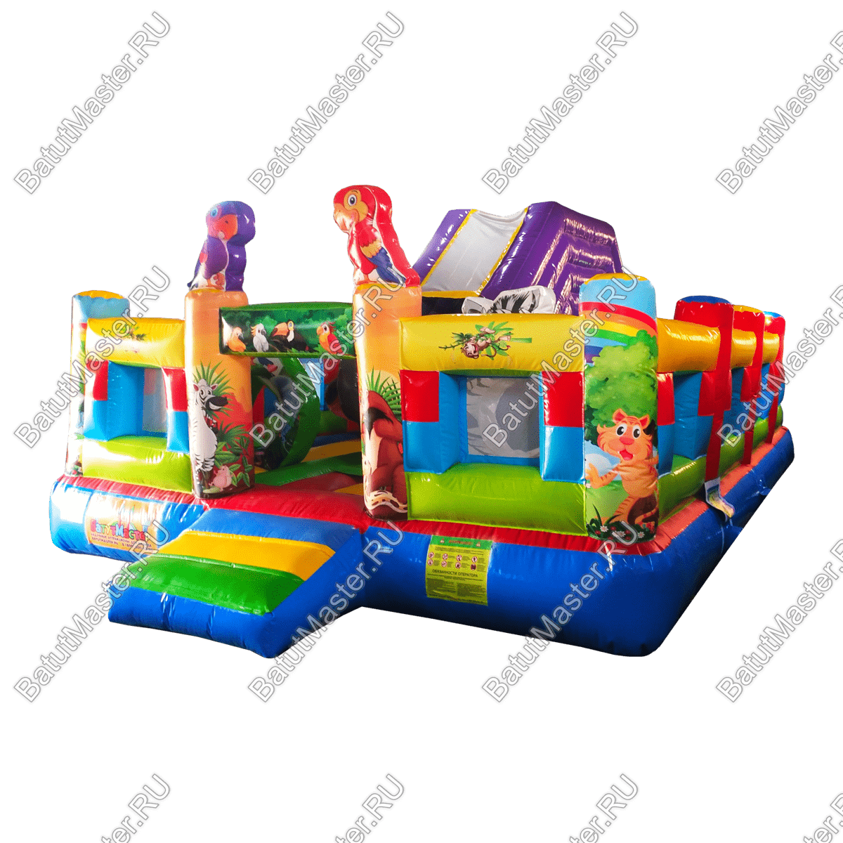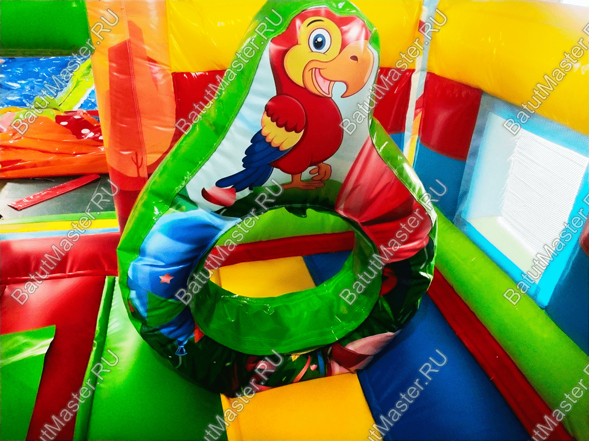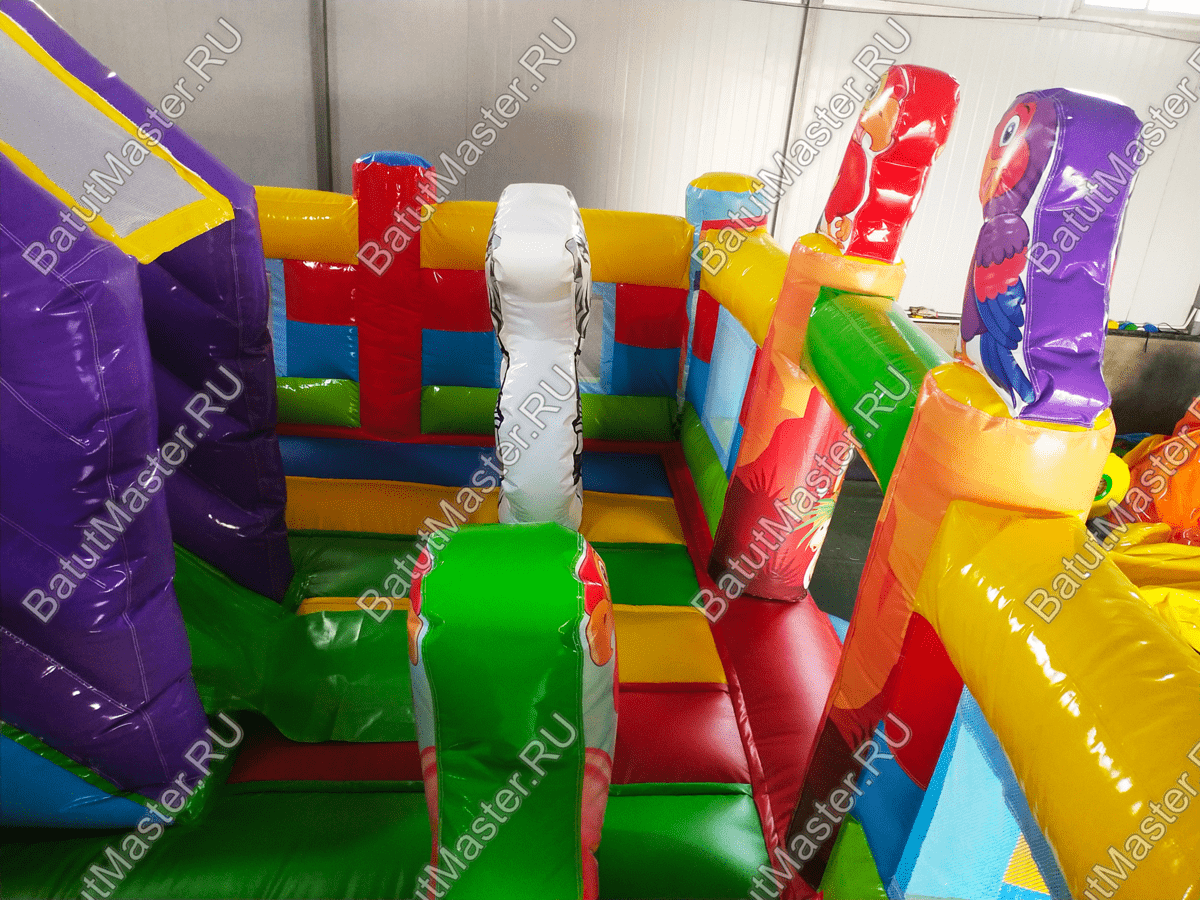 Трудно себе представить более яркого и пестрого надувного коммерческого батута, чем этот. Здесь каждый элемент и каждая колонна изготовлена из качественного усиленного ПВХ, поэтому в целом площадка смотрится максимально пестро и привлекает внимание даже издалека. Фасадная часть, состоящая из надувных высоких столбов, радует своих посетителей интересными изображениями африканских животных, а сверху над аркой-входом расположились 2 забавных попугайчика.