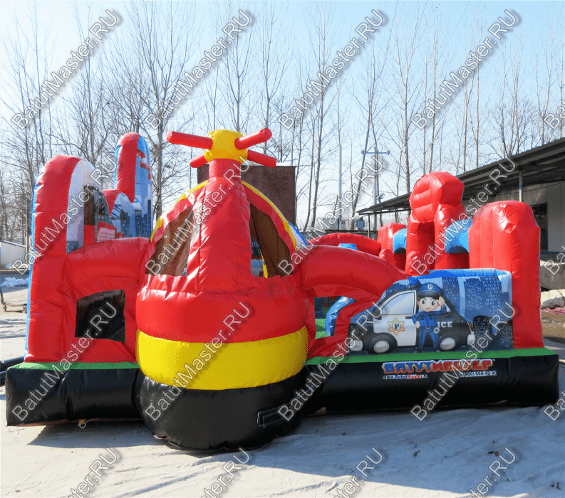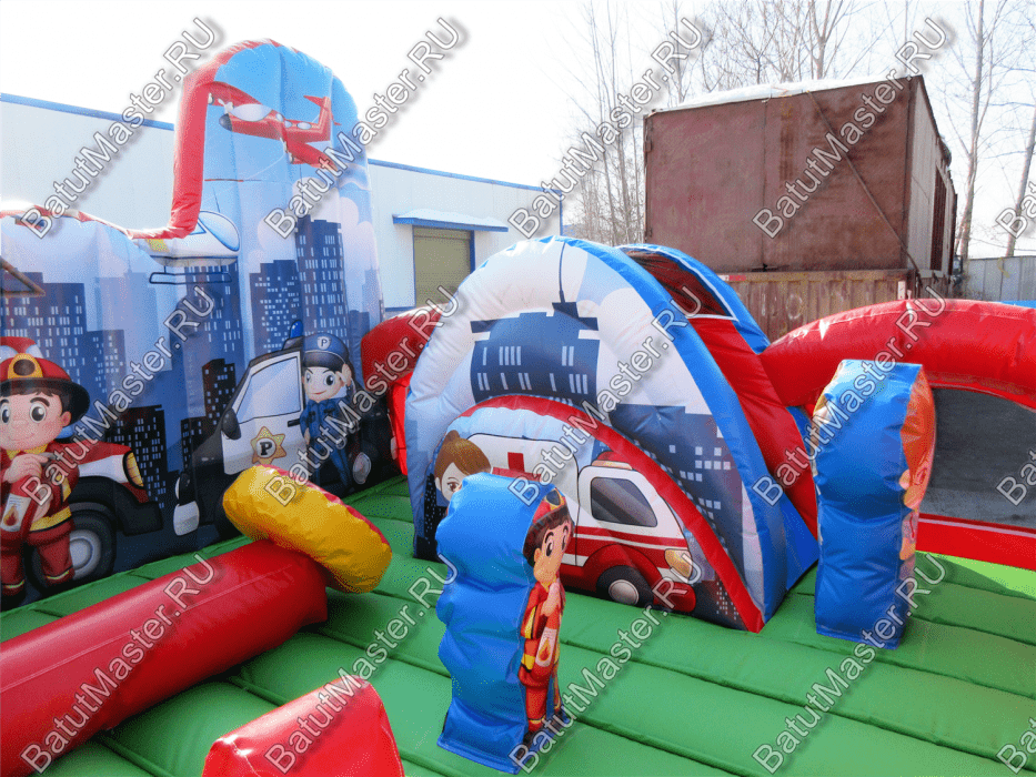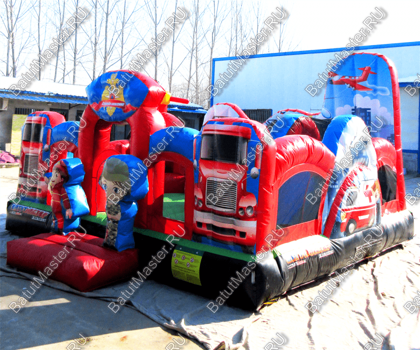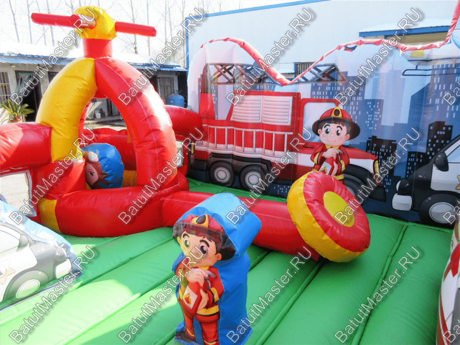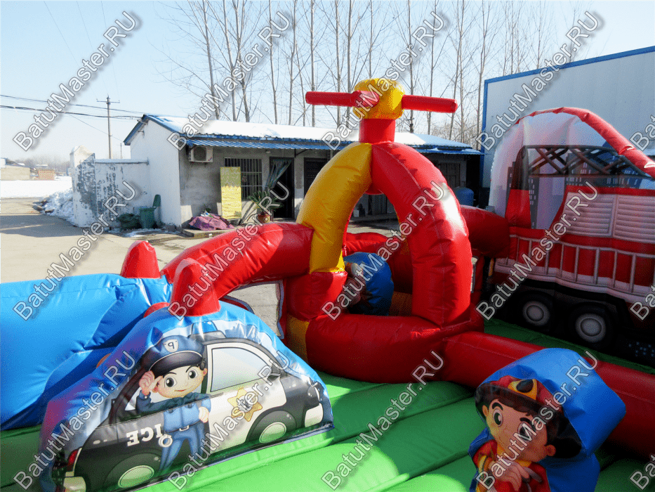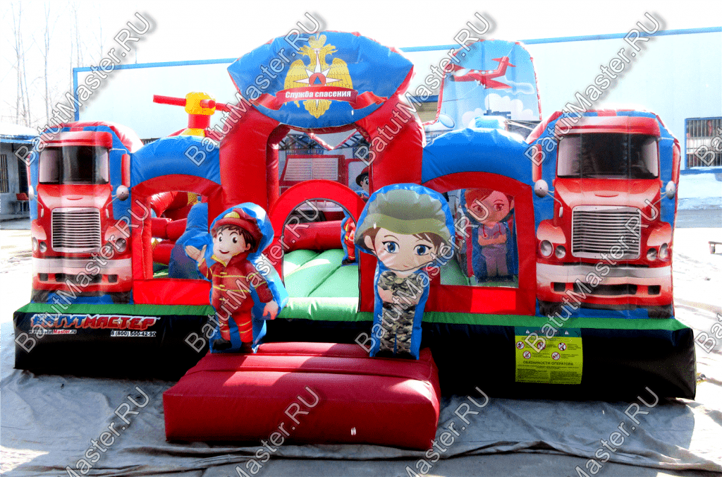 Машины, а особенно пожарные – вот что вызывает неподдельный интерес у любого мальчугана. Вся фасадная сторона говорит, что это целый автопарк интересных надувных автомобилей, где нашлось место даже надувному вертолету. Еще на самом входе – на подушке безопасности озорников встретят два небольших настоящих спасателя, открытые места этой стороны обтянуты сеткой, а боковые стены выполнены полностью из ПВХ.