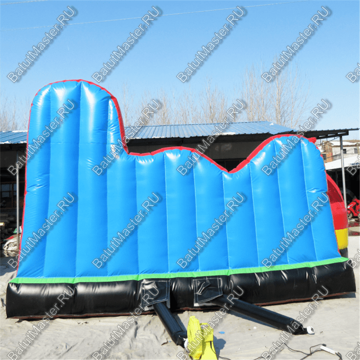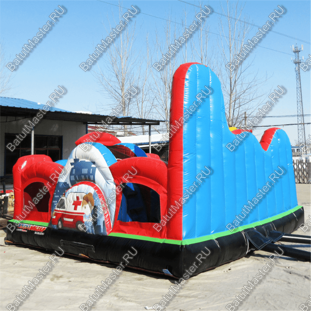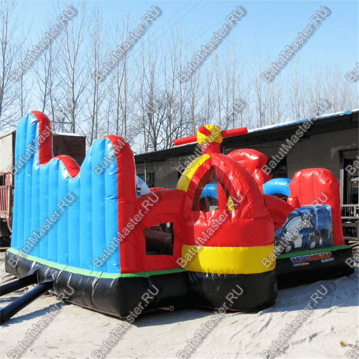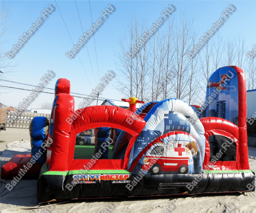 Машины, а особенно пожарные – вот что вызывает неподдельный интерес у любого мальчугана. Вся фасадная сторона говорит, что это целый автопарк интересных надувных автомобилей, где нашлось место даже надувному вертолету. Еще на самом входе – на подушке безопасности озорников встретят два небольших настоящих спасателя, открытые места этой стороны обтянуты сеткой, а боковые стены выполнены полностью из ПВХ.