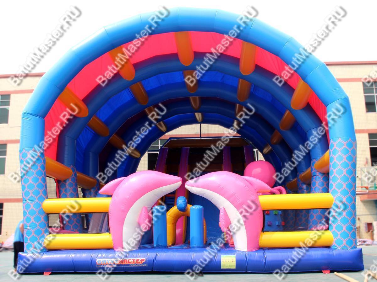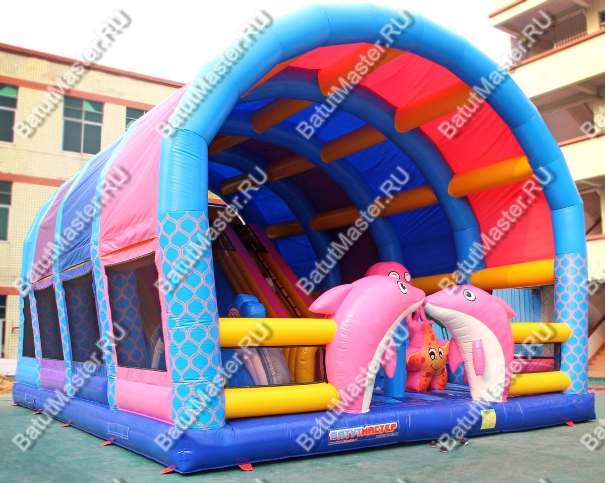 Фасад батута для бизнеса представляет собой вход в виде двух розовых дельфинов. Пройдя через них, дети попадают на территорию активных игр и развлечений на прыгательной подушке. В этой зоне установлено несколько игровых фигур в тематике Море, поэтому детям будет особенно интересно попрыгать на морской звезде, преодолеть скалодром с осьминогом или спрятаться внутри тоннеля с головой черепах. Но у самого окончания коммерческого аттракциона установлена горка, взобраться на которую помогают 2 лестницы (справа и слева от спуска). Стартовая площадка закрыта надувными стенами со всех трех сторон, а сверху дополнительно и сеткой.