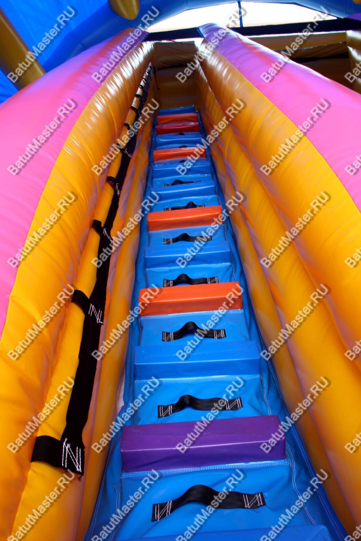 Задняя стенка батута - сплошная надувная стена из синего ПВХ, внизу оборудованная надувными компрессорами и клапанами для быстрого спуска воздуха.