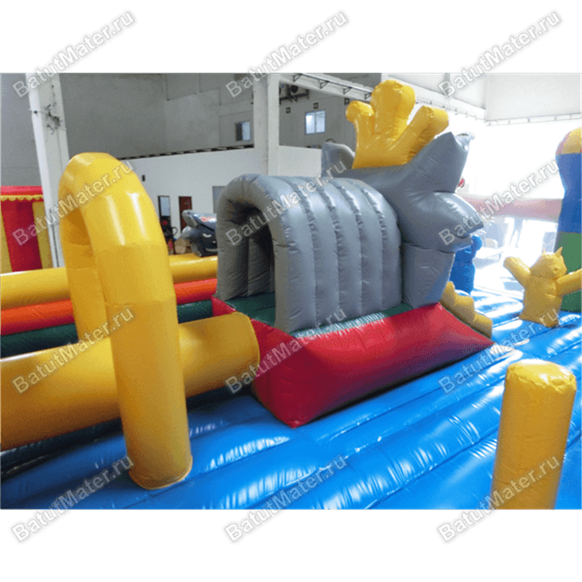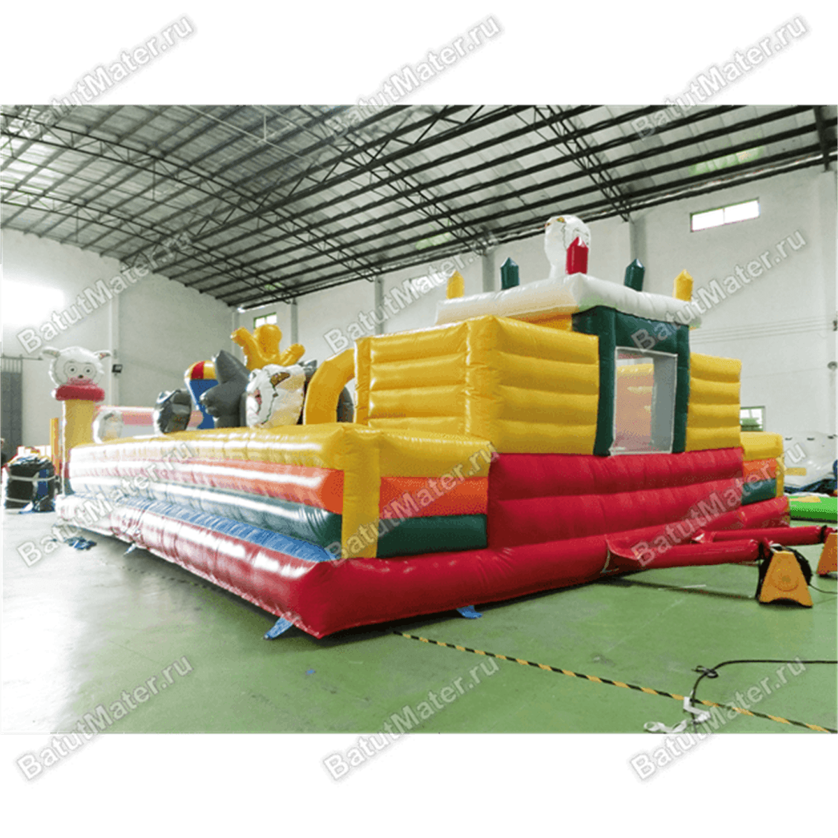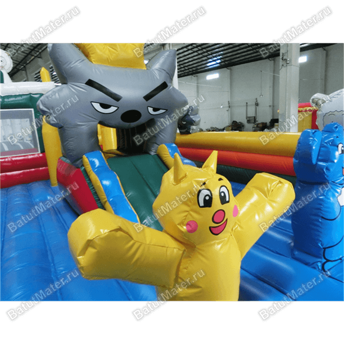 Яркий игровой батут создан по увлекательному дизайну, в котором можно встретить и разнообразных животных и самые разные игровые фигуры. Если передняя сторона выполнена из нейлоновой сетки и позволяет взрослым следить за происходящим внутри, то задняя и боковые стороны изготовлены в виде мягкого ограждения из ПВХ. Открытая сверху конструкция представлена просторным местом для прыжков и для бега, главным элементом среди всех фигур является серый волк в виде невысокой горки. Но здесь также есть красно-белый скалодром, желтые окружности. У задней стенке создан небольшой домик из красного и желтого материала с зеленой кабинкой по центру.