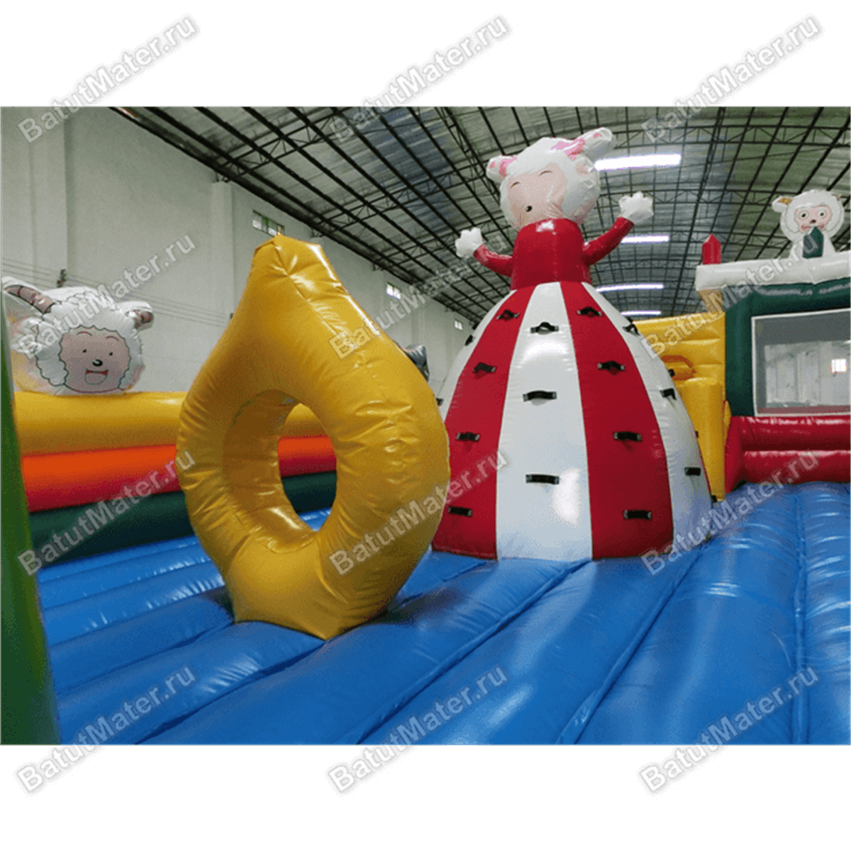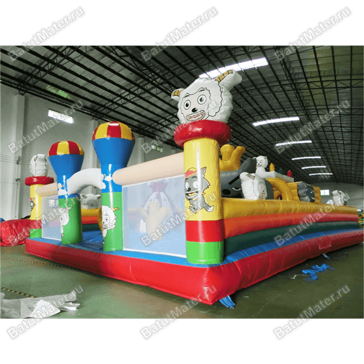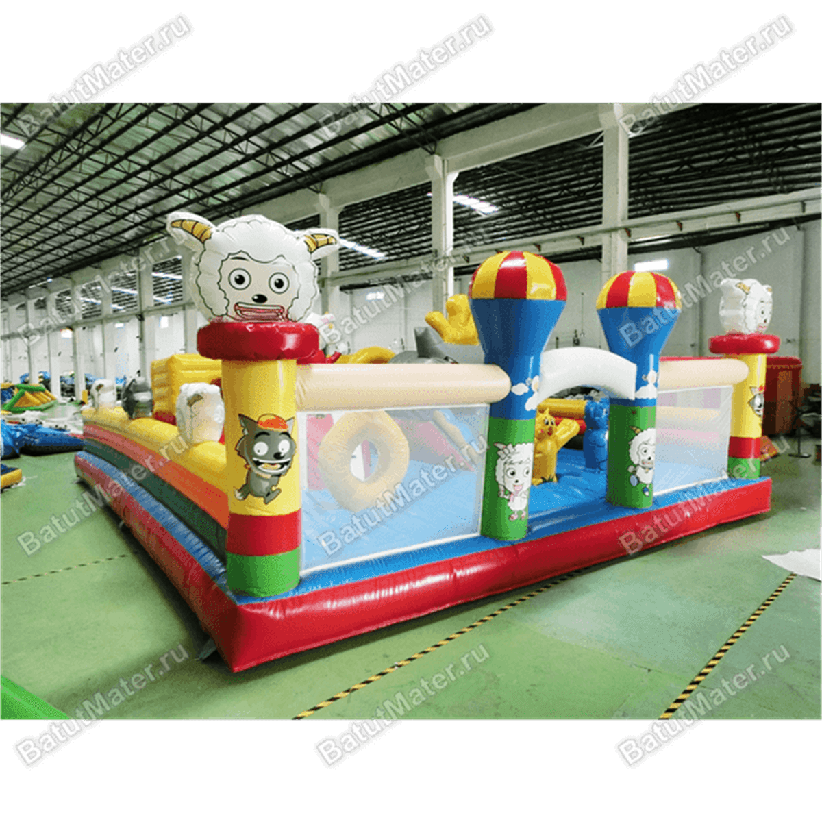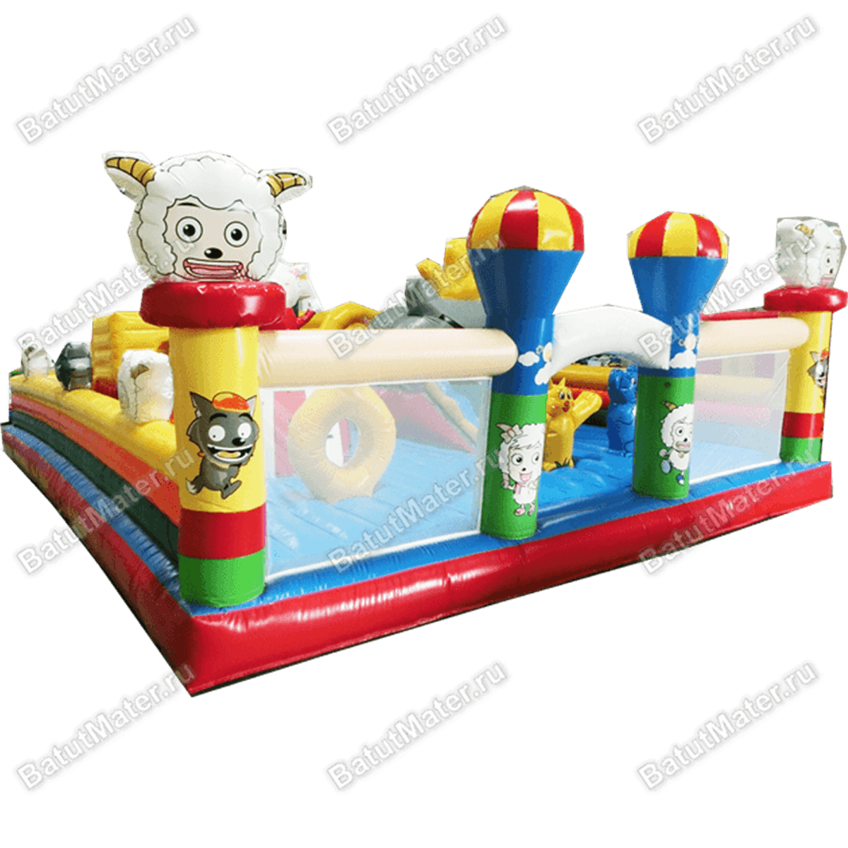Забавные надувные барашки здесь присутствуют повсюду: на каждом угловом столбе, внутри батута на домике и просто в виде игровых элементов. Почти каждая часть аттракциона украшена изображением какого-нибудь животного, а столбы в арке на входе вверху сделаны в виде небольших воздушных шаров.