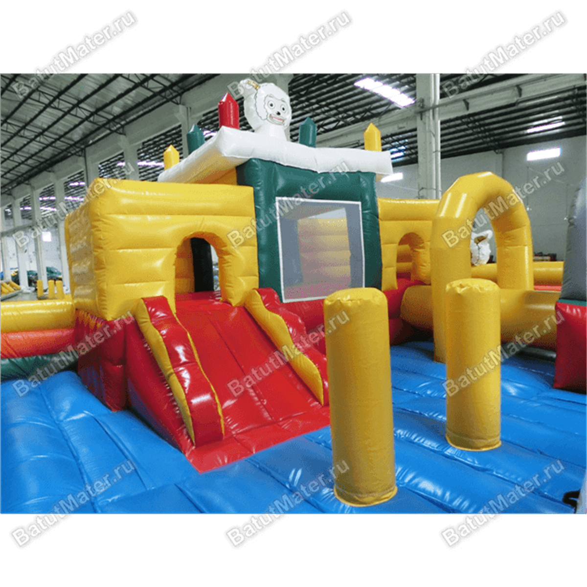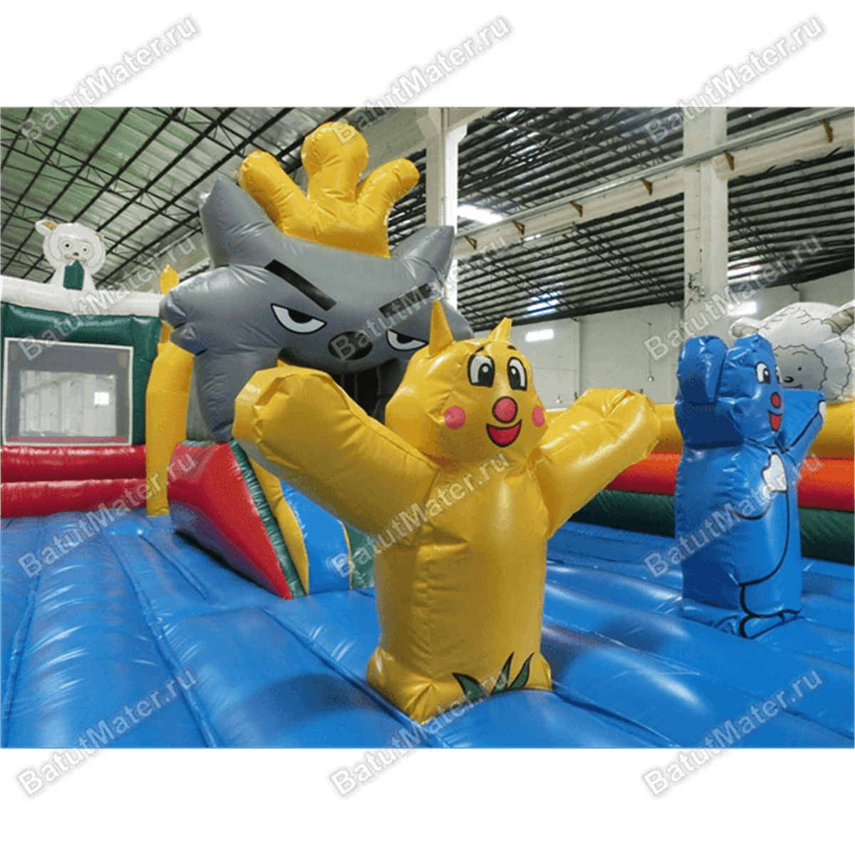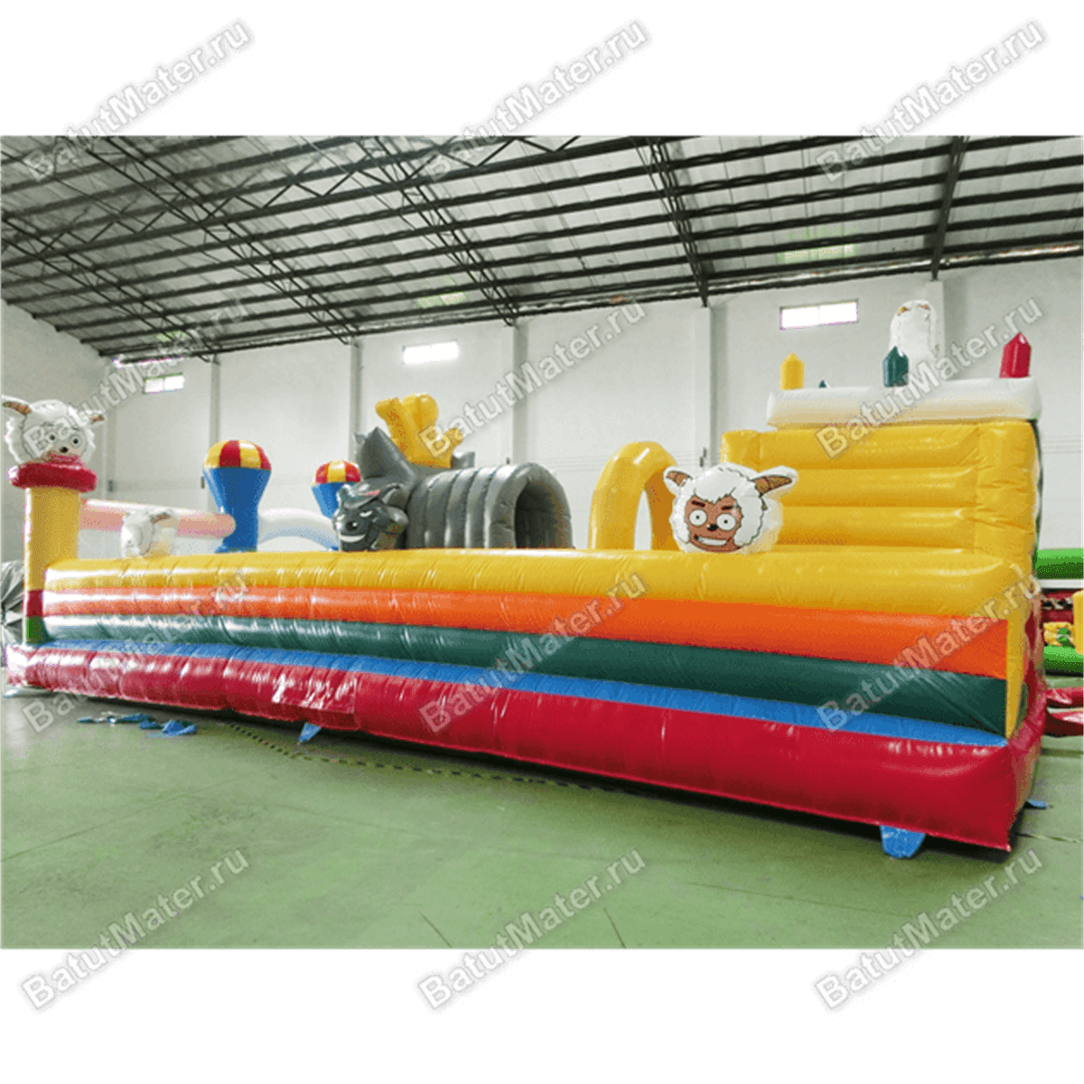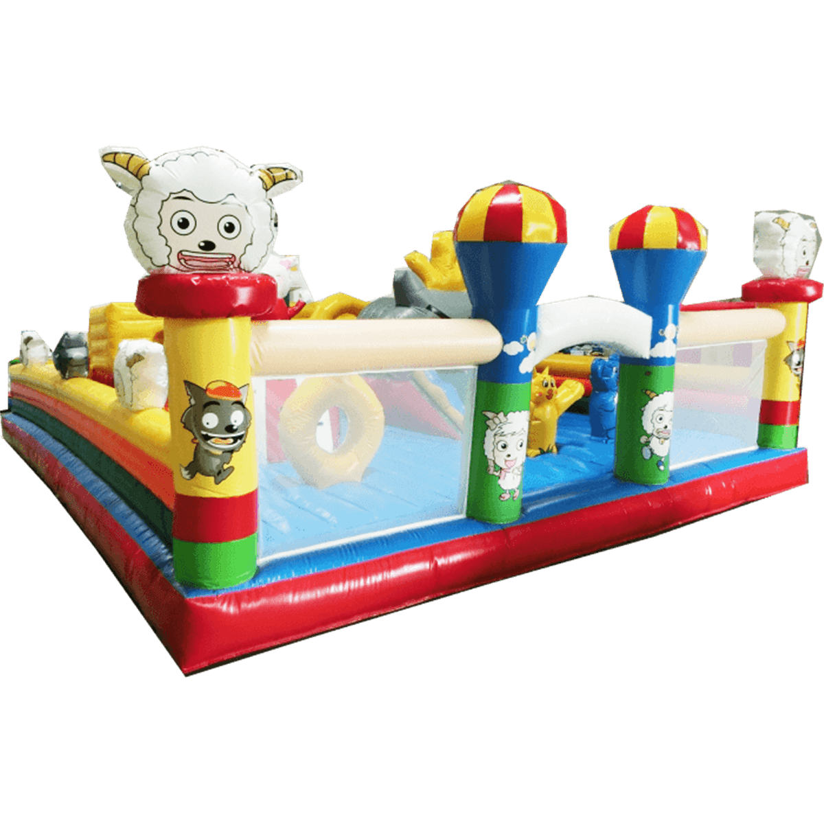 Забавные надувные барашки здесь присутствуют повсюду: на каждом угловом столбе, внутри батута на домике и просто в виде игровых элементов. Почти каждая часть аттракциона украшена изображением какого-нибудь животного, а столбы в арке на входе вверху сделаны в виде небольших воздушных шаров.