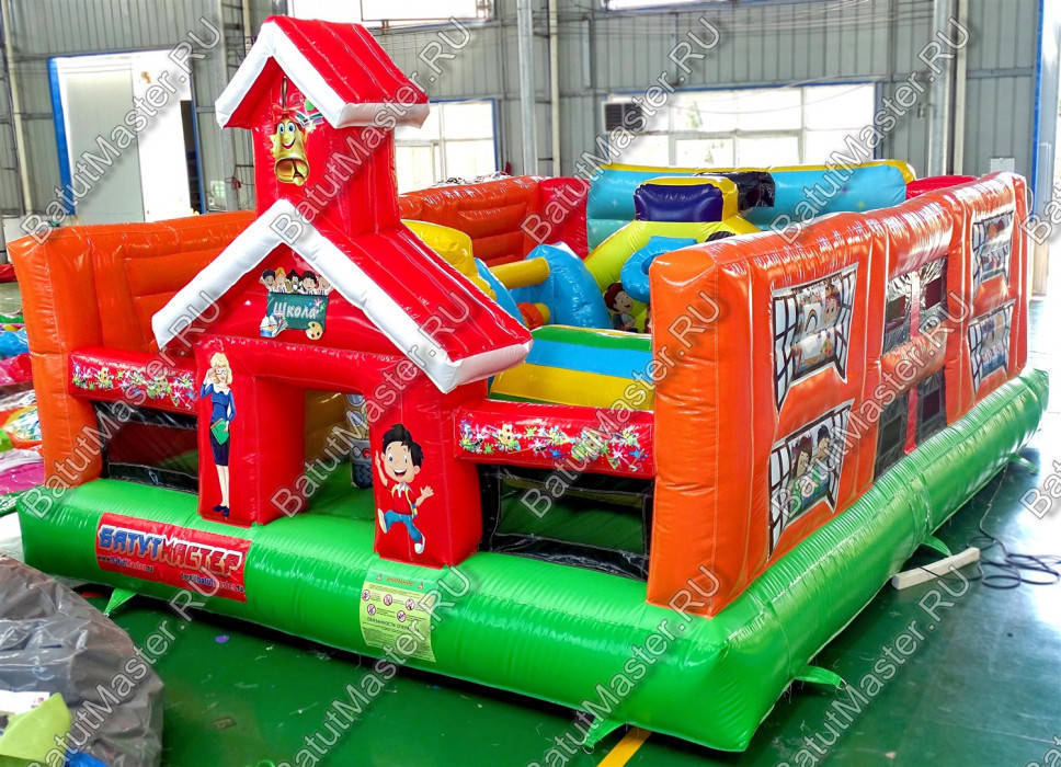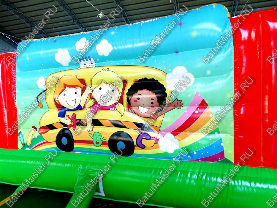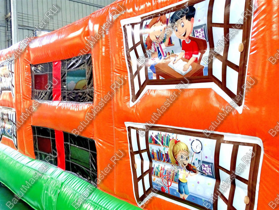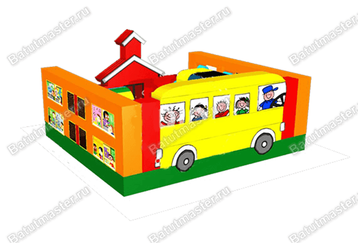 Почти целый дом, то есть школа, из разноцветных стен и огромного надувного автобуса – это и есть привлекательный батут квадратной формы с интересным дизайном. Фасадная стенка самого яркого красного цвета оснащена входом и двойным козырьком сверху, по обеим сторонам выполнены прямоугольные стены, обтянутые сеткой, имеются изображения колокольчика и учительницы со школьницей. Дальше открывается просторное место для прыжков и для бега с препятствиями, туннелем и игровыми фигурами в виде карандашей и счет.