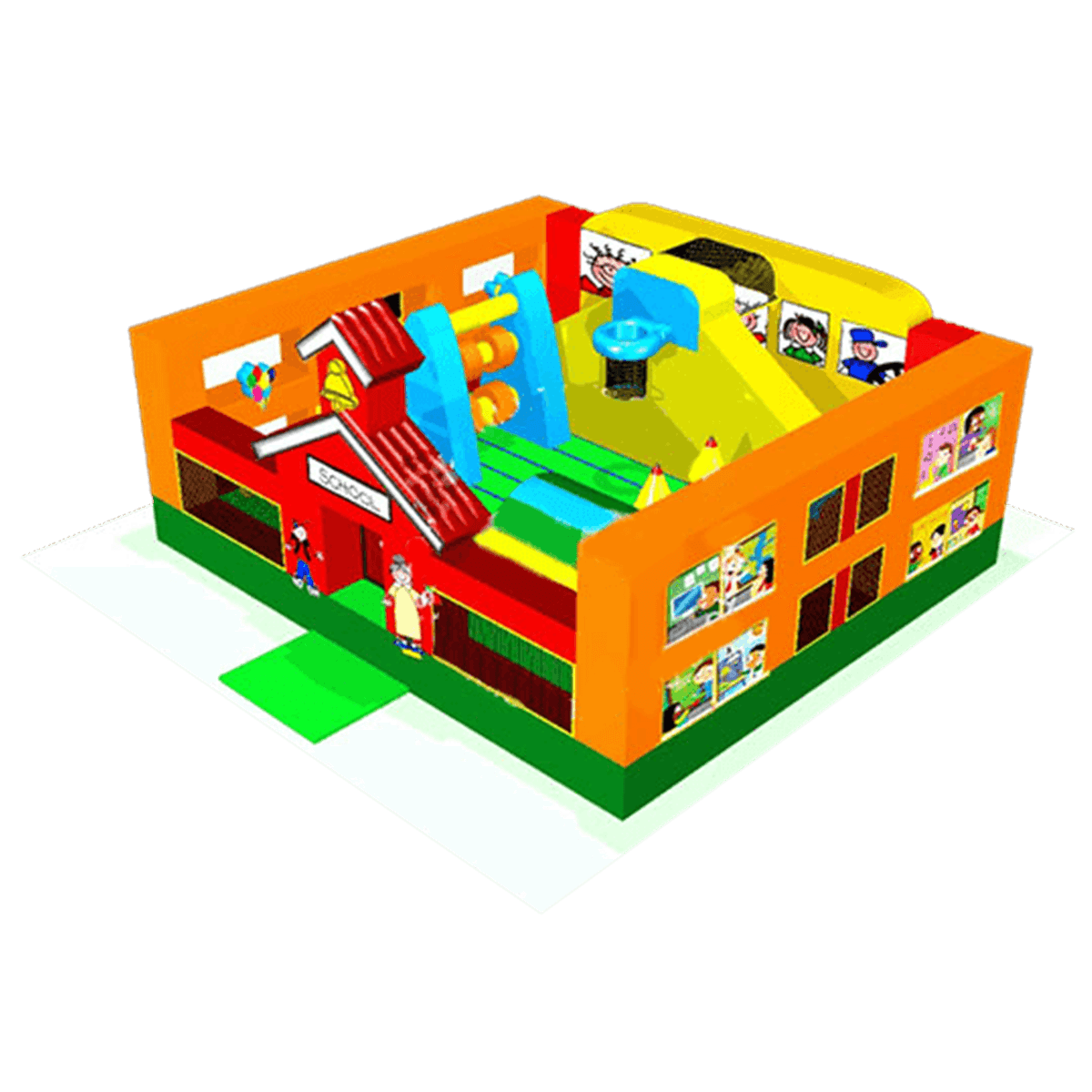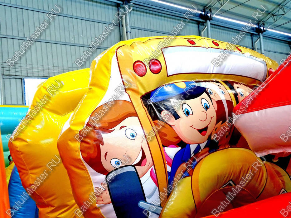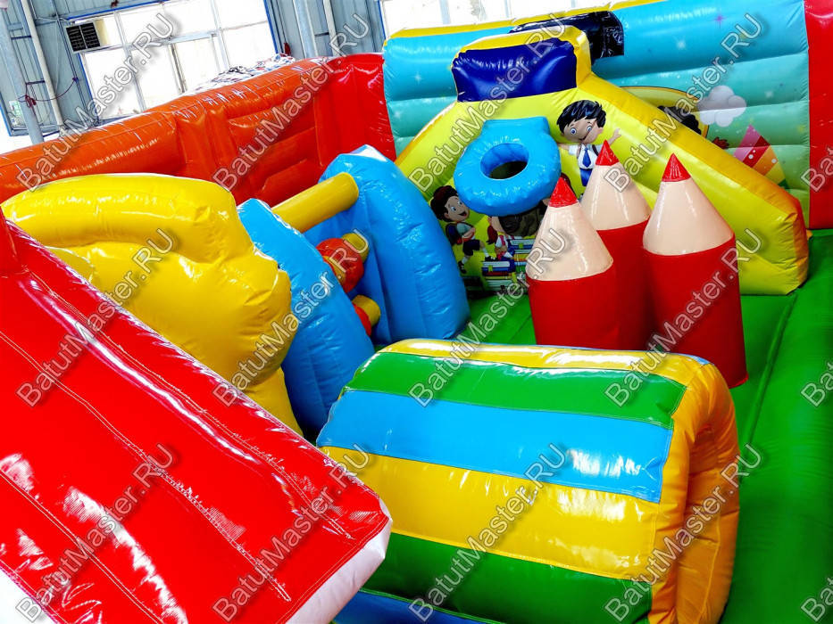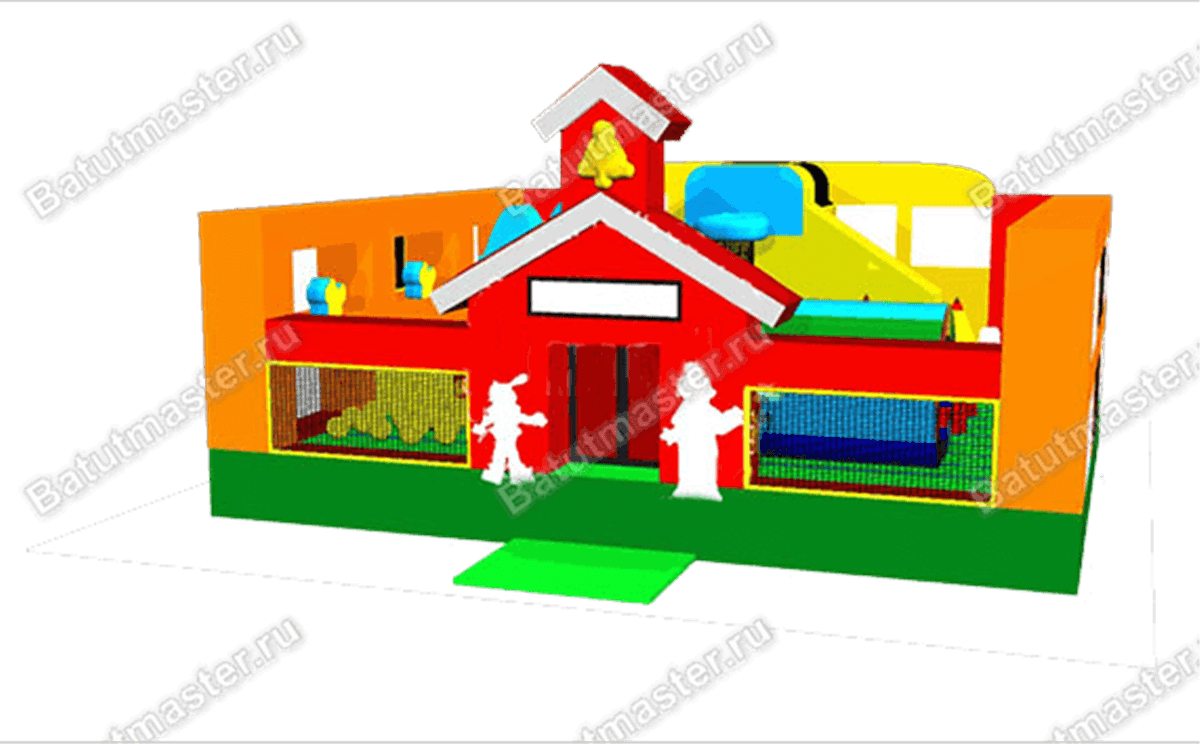 Почти целый дом, то есть школа, из разноцветных стен и огромного надувного автобуса – это и есть привлекательный батут квадратной формы с интересным дизайном. Фасадная стенка самого яркого красного цвета оснащена входом и двойным козырьком сверху, по обеим сторонам выполнены прямоугольные стены, обтянутые сеткой, имеются изображения колокольчика и учительницы со школьницей. Дальше открывается просторное место для прыжков и для бега с препятствиями, туннелем и игровыми фигурами в виде карандашей и счет.