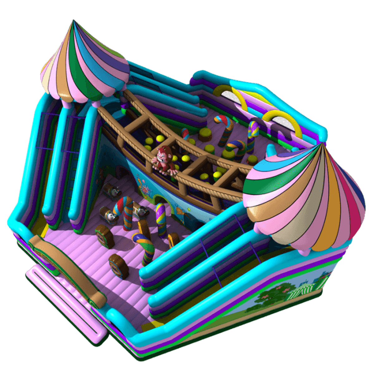 С обеих сторон установлены высокие горки с подъемами, а между ними надувной открытый переход, он позволяет добираться из одной стороны конструкции в другую, съезжать с какого угодно спуска. Всего коммерческий батут насчитывает в себе 4 горки и лестницы, нижняя платформа тоже довольно интересная. Она заставлен игровыми элементами, которые напоминают конфеты или другие сладости. Верхний туннель внизу превращается в небольшой «подземный переход», который и соединяет обе стороны аттракциона. Главной героиней конструкции является обезьянка, сидящая на самом верху туннеля.