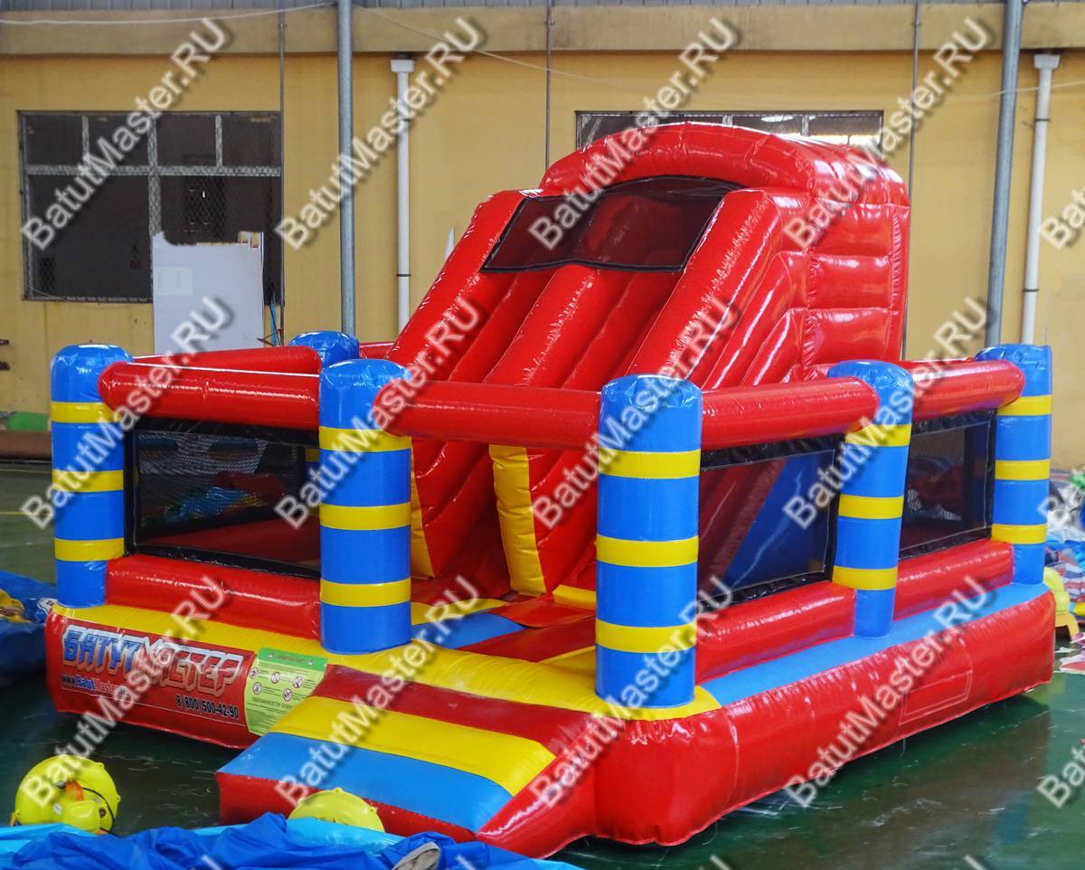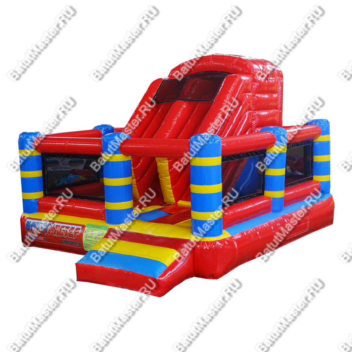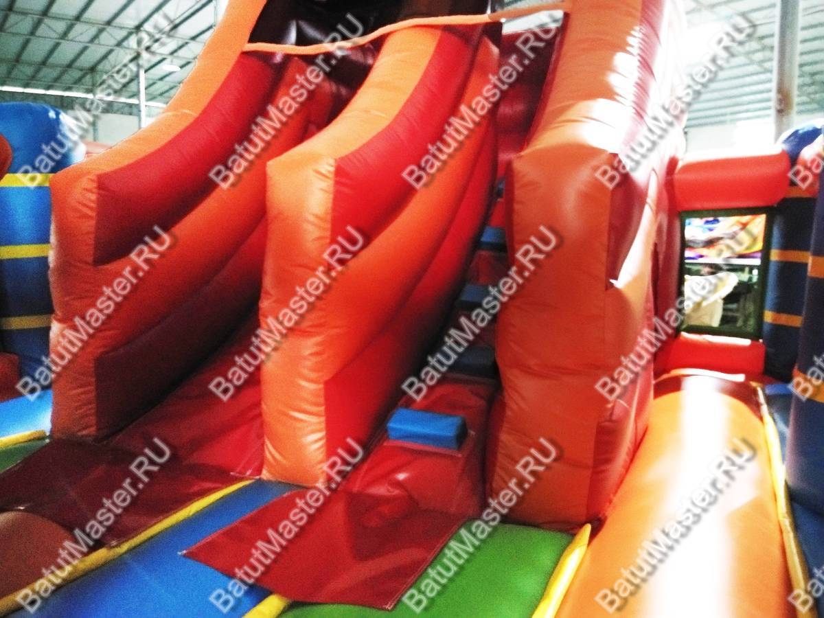 Детей внутри ожидает большая горка, на которую без труда можно забраться по рядом стоящим батутным лесенкам. Горка хорошо скользит, она мягкая и просторная. Окружена небольшими надувными стенками, чтобы во время катаний детки не смогли упасть с неё.