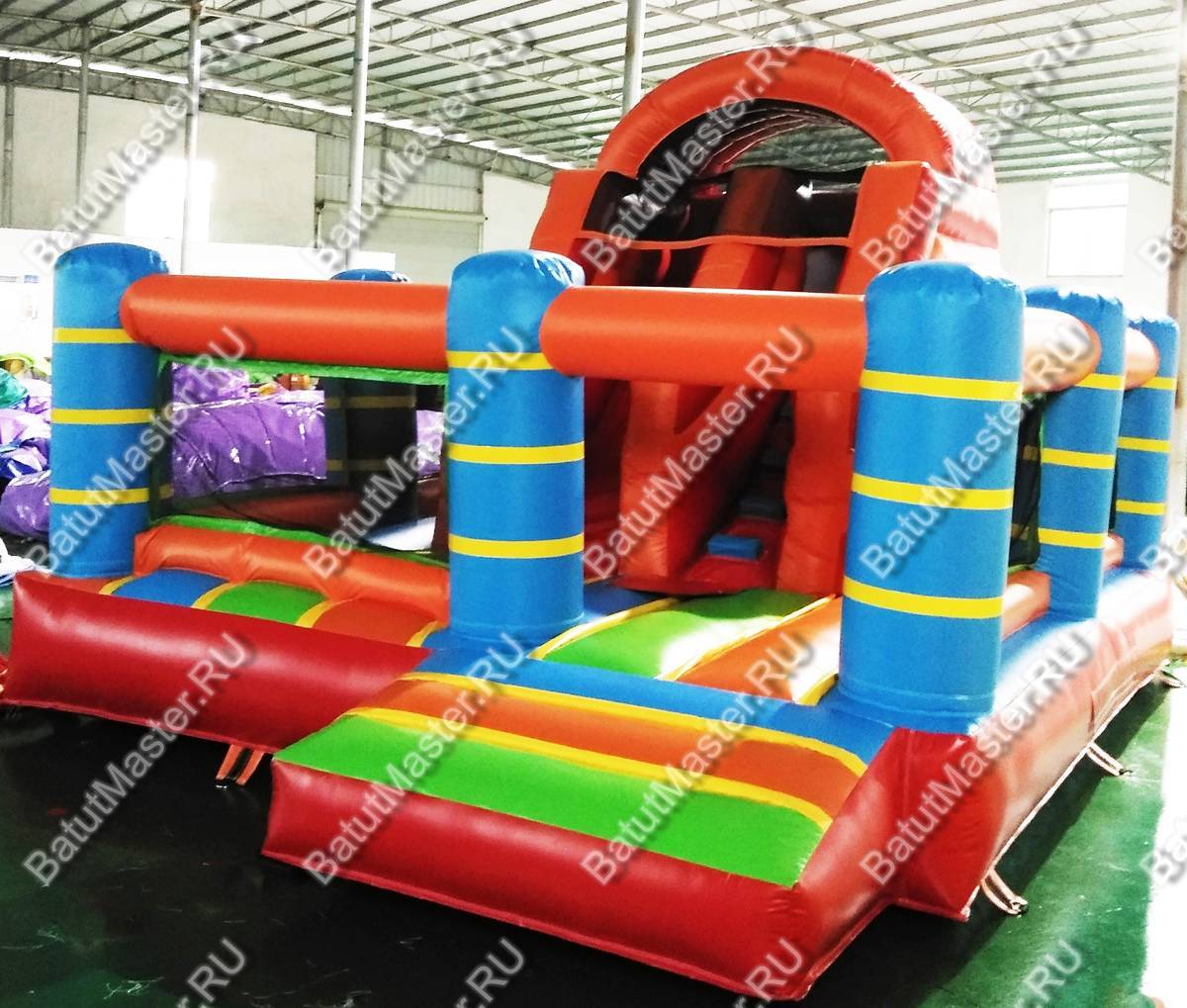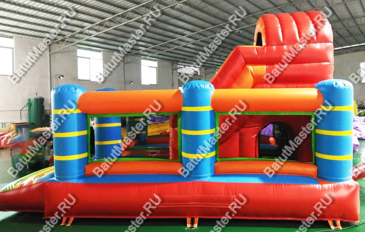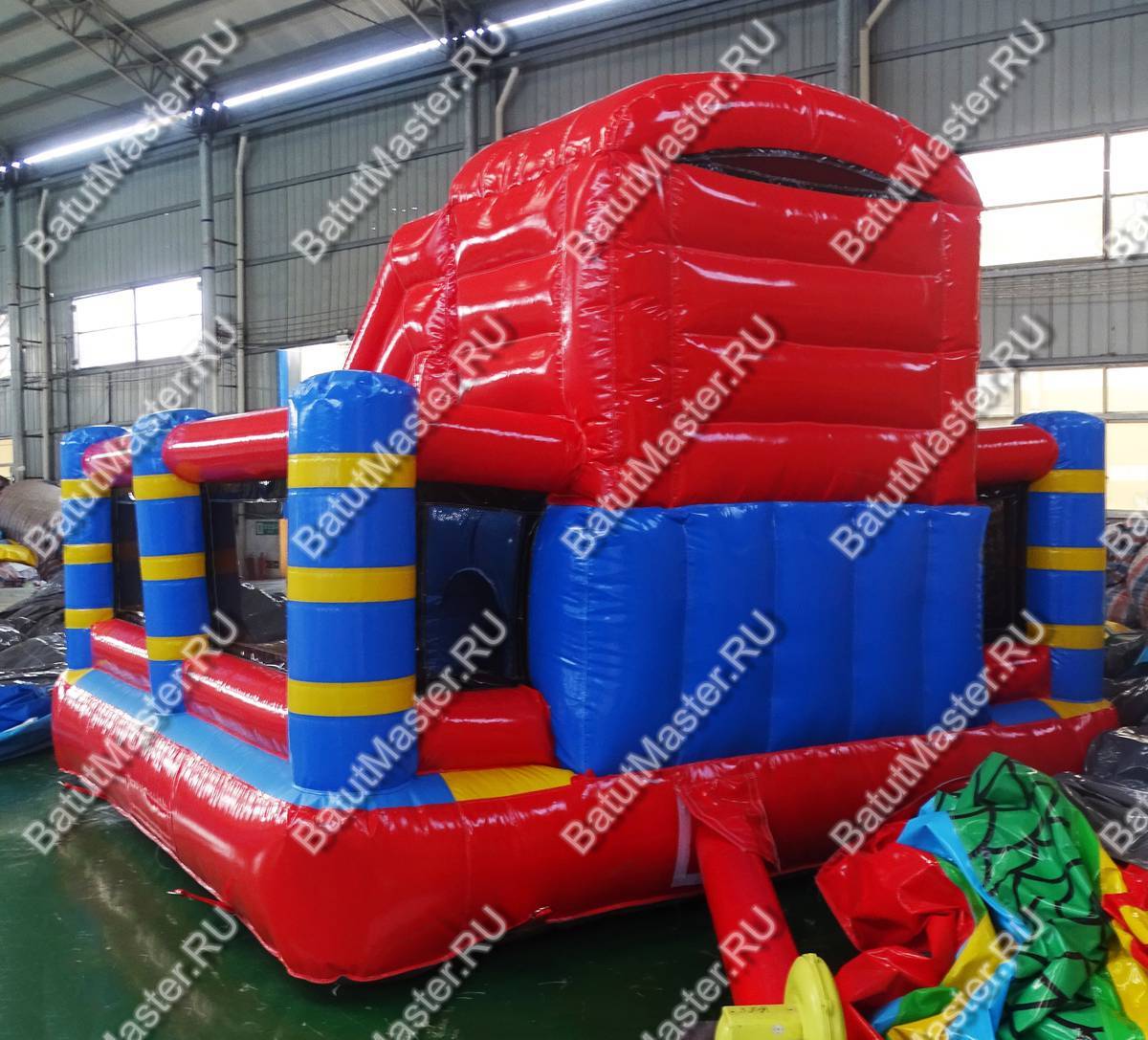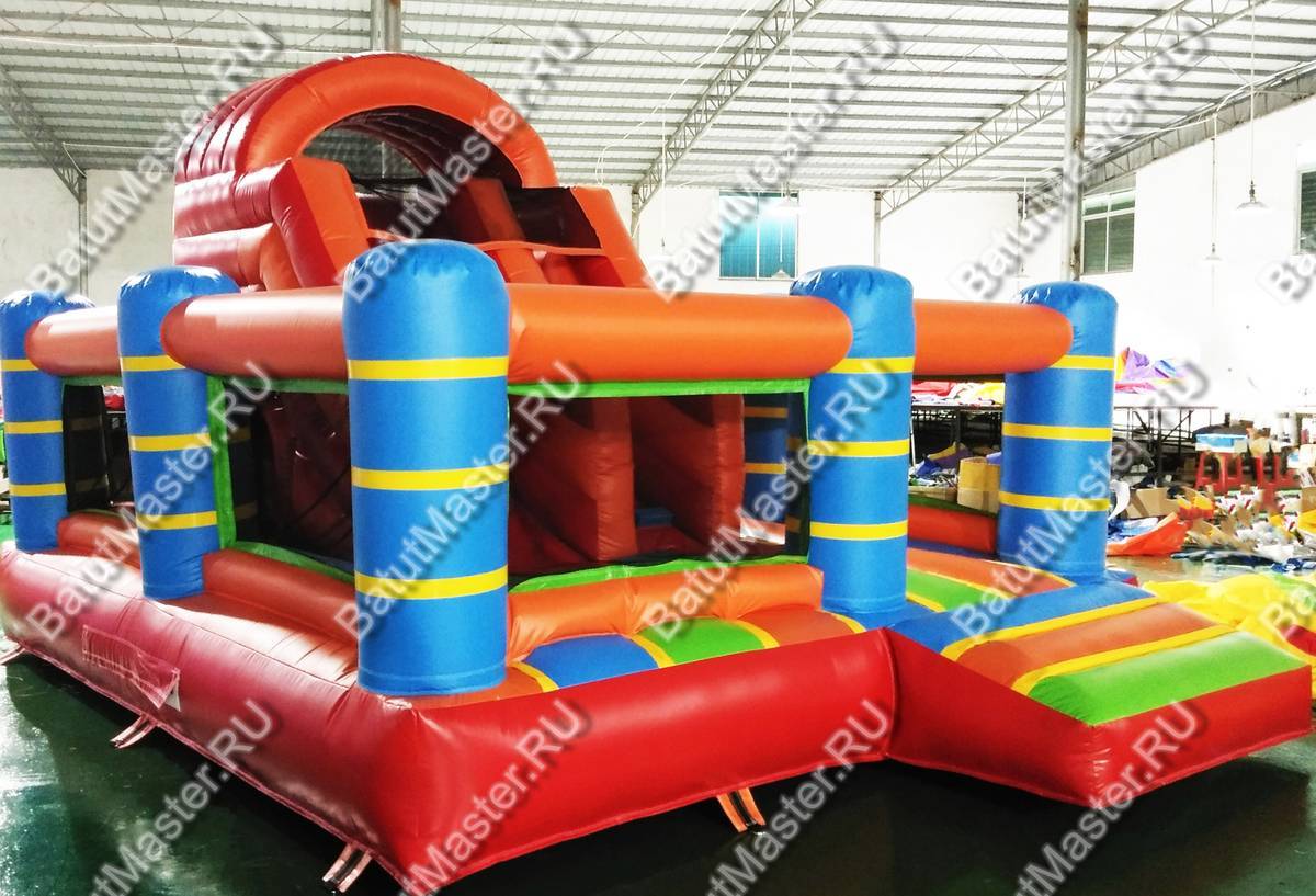Детей внутри ожидает большая горка, на которую без труда можно забраться по рядом стоящим батутным лесенкам. Горка хорошо скользит, она мягкая и просторная. Окружена небольшими надувными стенками, чтобы во время катаний детки не смогли упасть с неё.