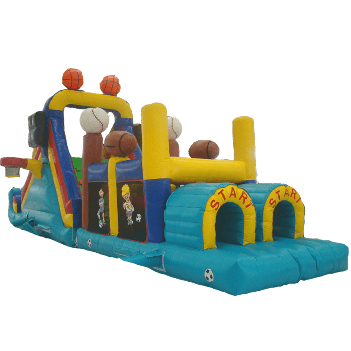 Боковые стороны игровой площадки изготовлены из черной сетки с изображениями юных спортсменов. После преодоления препятствий перед ребенком откроется стена-скалодром для поднятия наверх и спуска с горки. В целом, коммерческий батут сшит из синего и желтого материала ПВХ, поэтому он полностью совпадает с любой спортивной расцветкой. Сама конструкция отлично впишется в дизайн любого учебного учреждения и поможет самым неспособным достичь нужного физического результата. Как коммерческий батут – это лучший выбор для владельцев парков в любых направлениях.