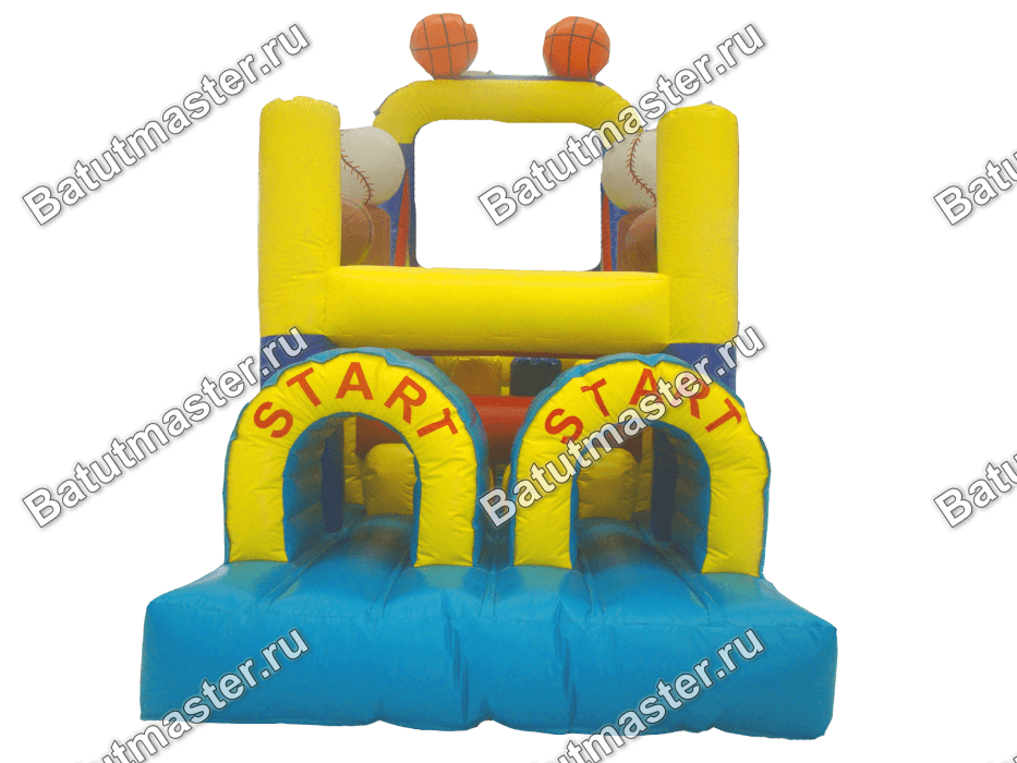 Огромная спортивная площадка собрала в себе мячи из самых разных видов спорта. К тому же, по бокам уличного батута установлены баскетбольные корзины. А начинается яркий батут с округлых арок желто-синего цвета, на которых призывно нанесены надписи «START». Дальше, пройдя сквозь такие тоннели, перед посетителем откроется целая площадка с препятствиями, с которой обязательно придется справиться, в противном случае вход к большой горке будет недоступен.