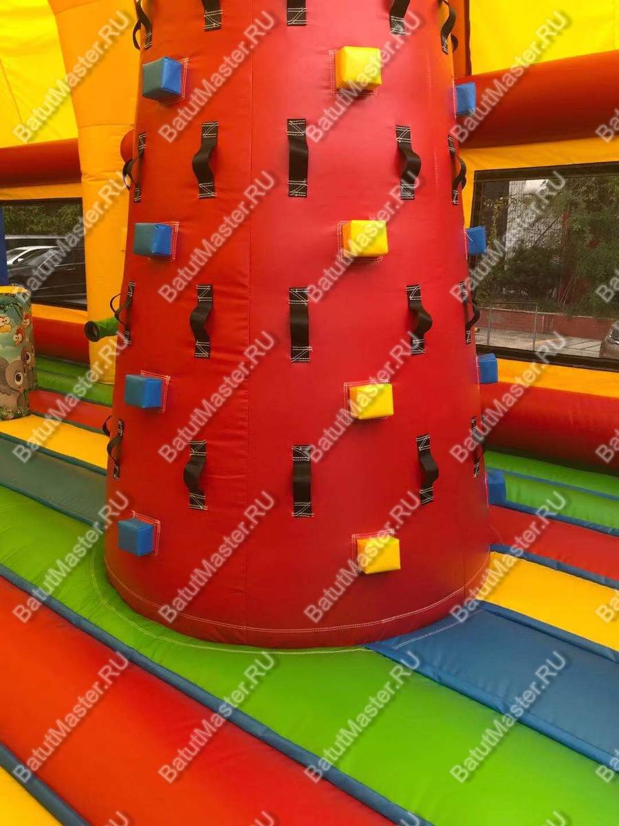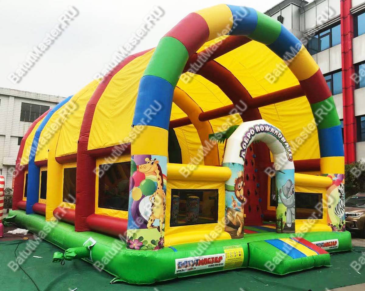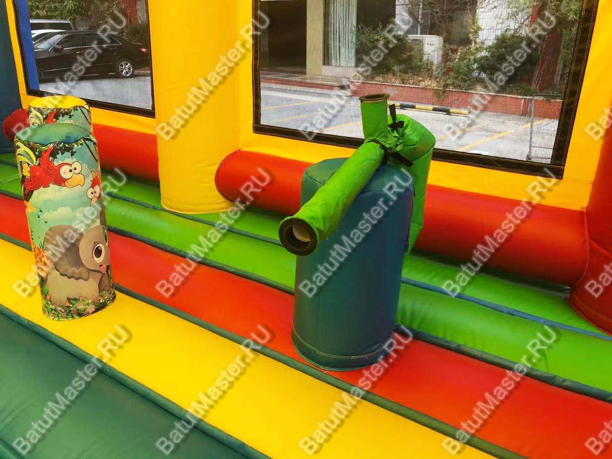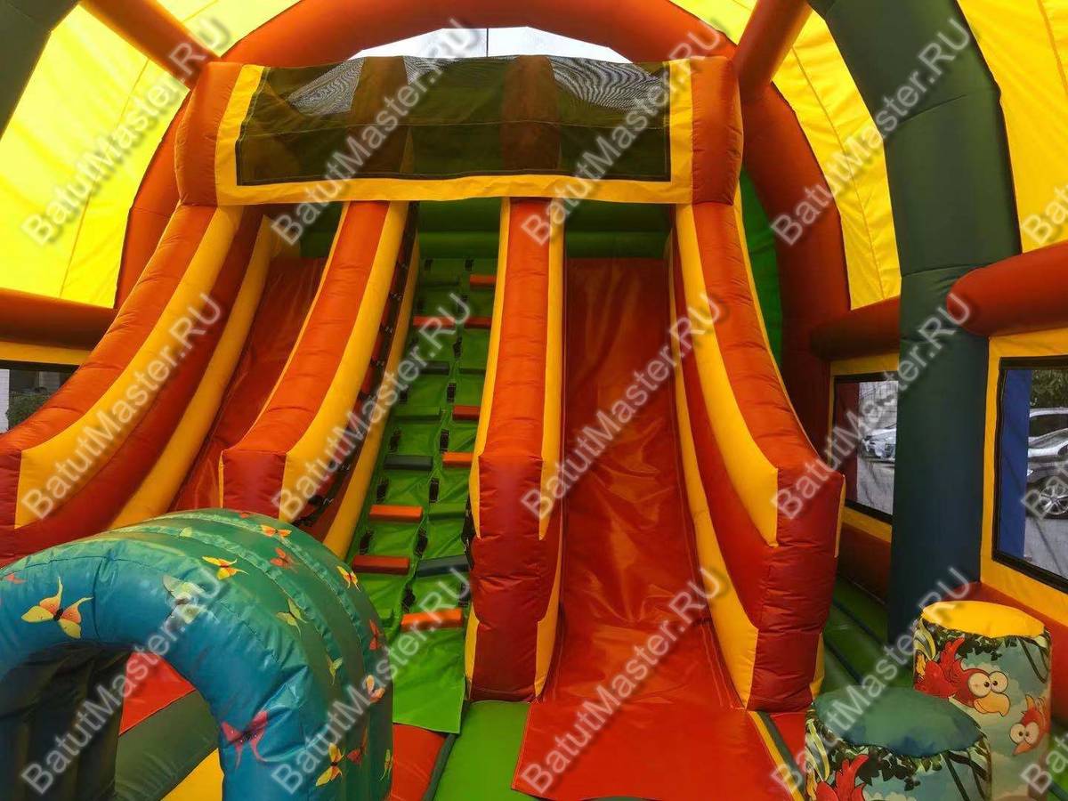 Спускаясь с горки, дети приземляться на просторное прыжковое поле. Здесь можно отталкиваться от надувных стенок, подлетать вверх, кувыркаться и придумывать различные игры. Стоит отметить, что у батута есть крыша, которая защитит детей от солнца и непогоды, а это значит, что его можно с легкостью устанавливать на открытом воздухе. Для того, чтобы забраться наверх, им необходимо будет преодолеть удобные ступеньки, по которым следует двигаться на четвереньках, и при этом приложить не мало усилий. Коммерческий надувной батут выполнен из особо прочного ПВХ. Такой материал не боится солнечных лучей и минусовой температуры. Это отличный вариант для бизнеса.