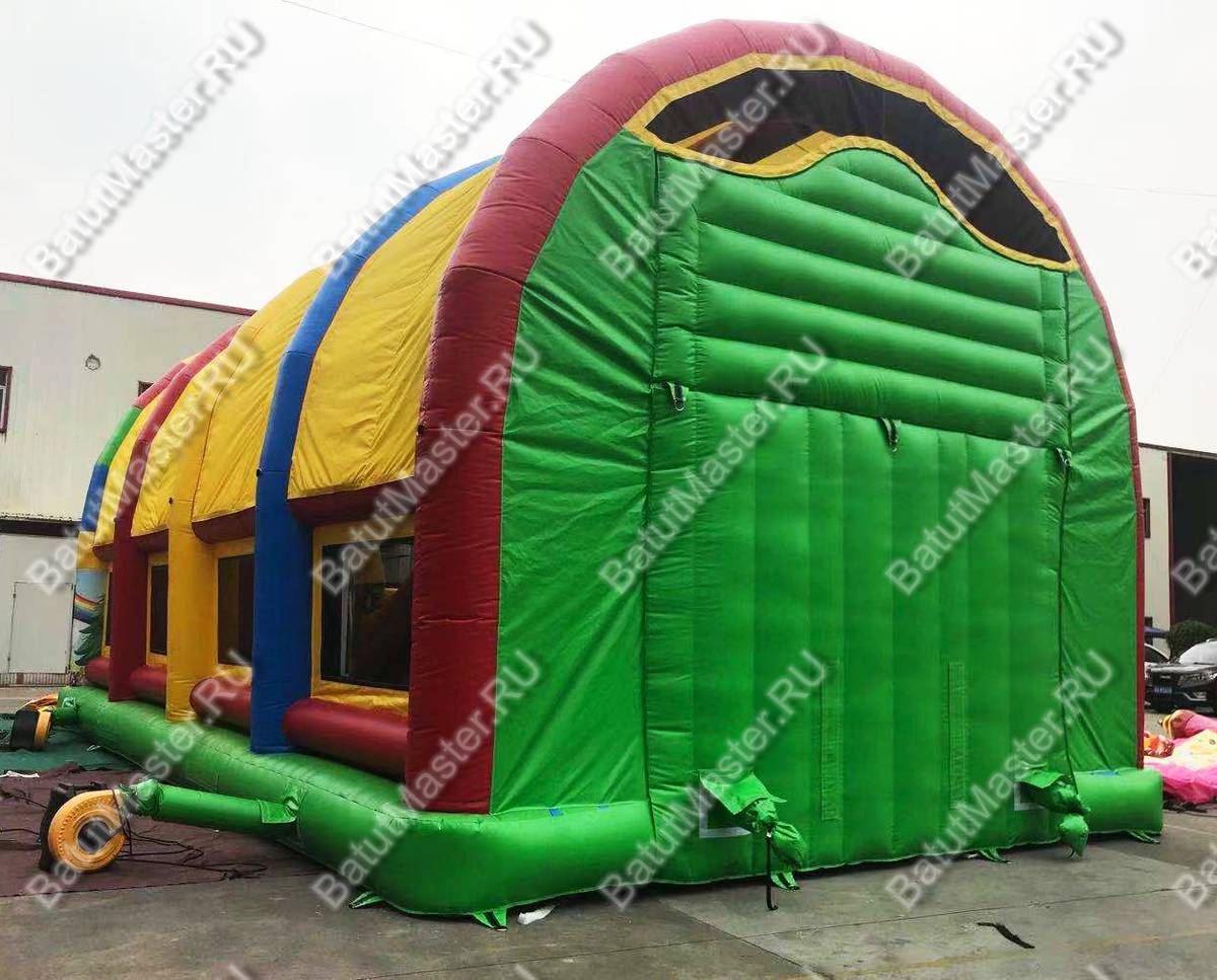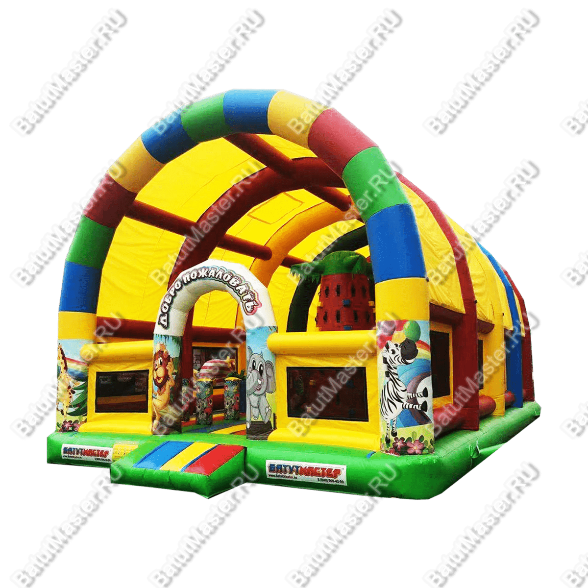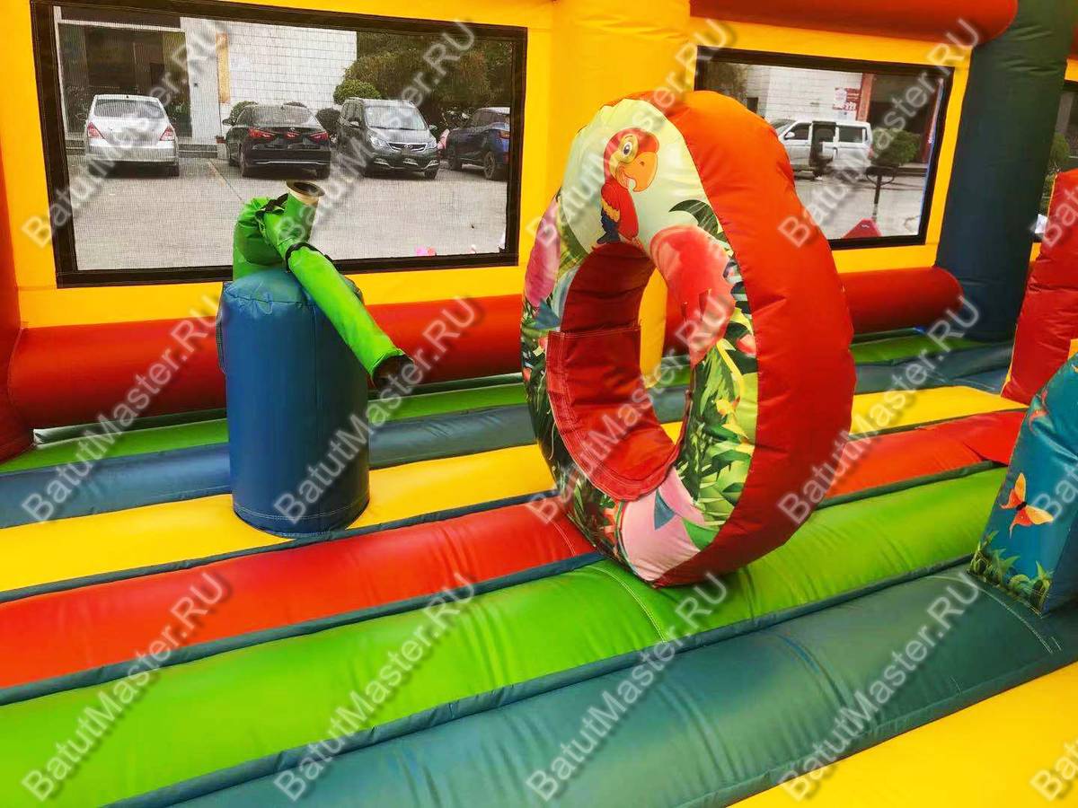 Спускаясь с горки, дети приземляться на просторное прыжковое поле. Здесь можно отталкиваться от надувных стенок, подлетать вверх, кувыркаться и придумывать различные игры. Стоит отметить, что у батута есть крыша, которая защитит детей от солнца и непогоды, а это значит, что его можно с легкостью устанавливать на открытом воздухе. Для того, чтобы забраться наверх, им необходимо будет преодолеть удобные ступеньки, по которым следует двигаться на четвереньках, и при этом приложить не мало усилий. Коммерческий надувной батут выполнен из особо прочного ПВХ. Такой материал не боится солнечных лучей и минусовой температуры. Это отличный вариант для бизнеса.