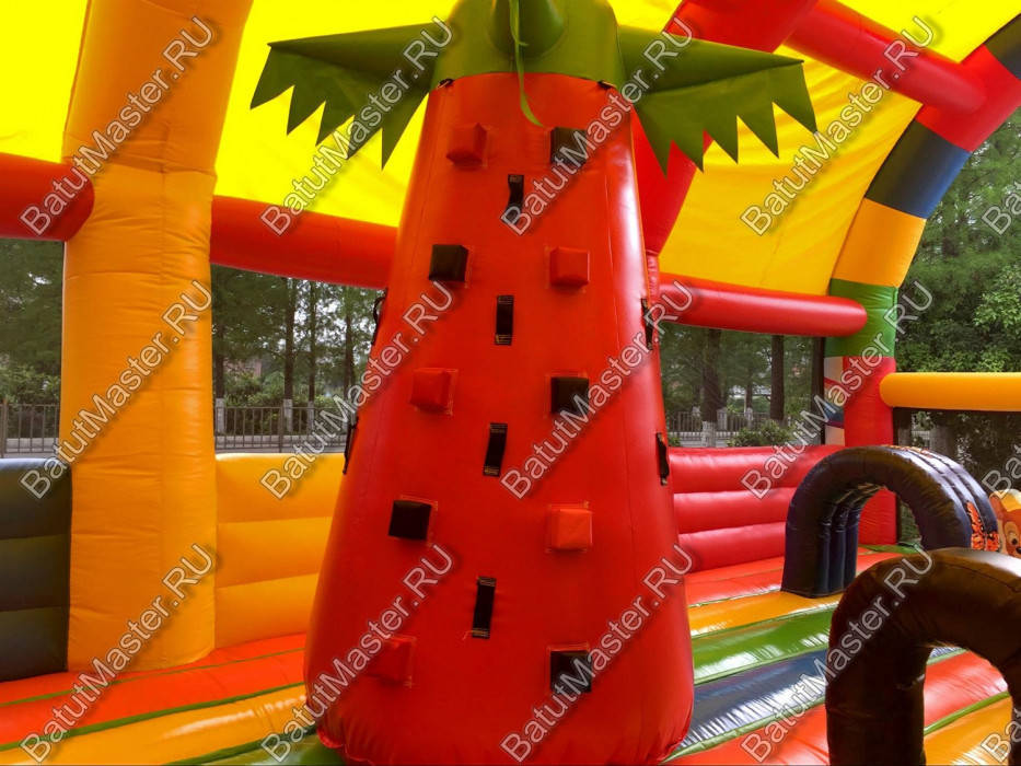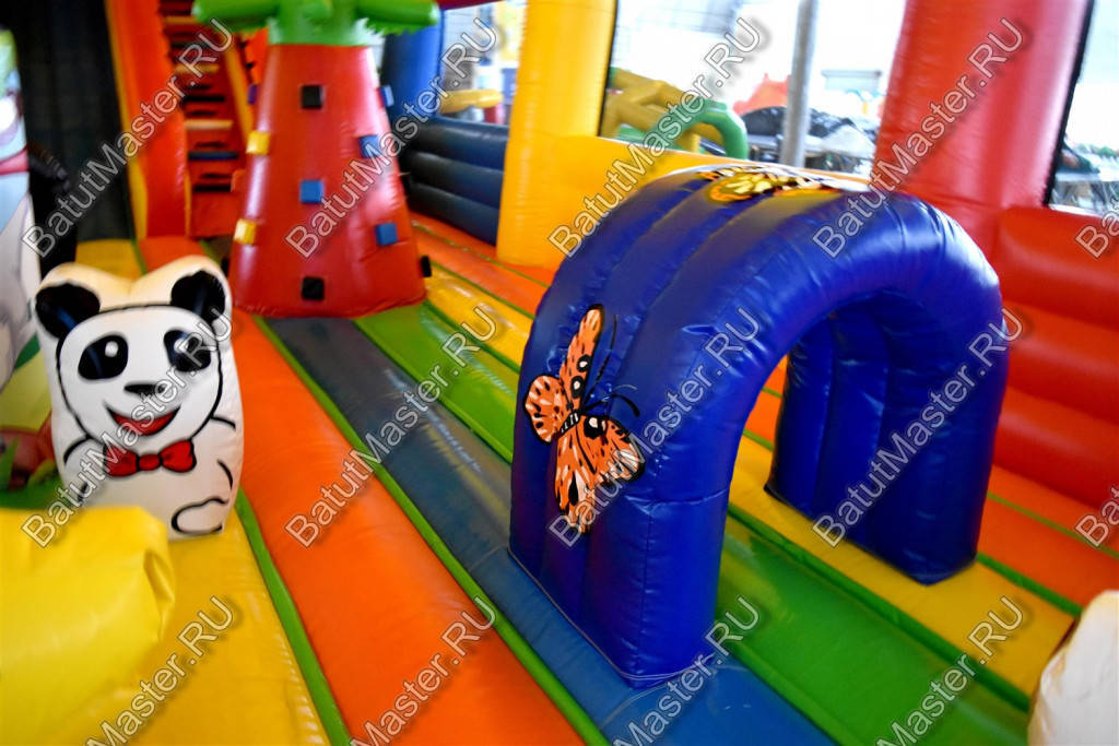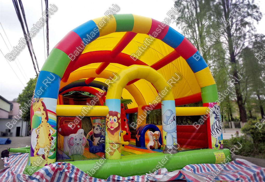 Коммерческий батут «Страна Сафария» - это целый комплекс развлечений для детей любого возраста. Ещё до того, как ребёнок окажется внутри, он будет приятно удивлён его красочным внешним видом. Этот большой батут изобилует яркими приятными цветами, привлекающими внимание детишек. Не обошлось и без весёлых животных, которые встречаются тут повсюду. Красочные зебры, слоны, львы, мартышки и прочие обитатели саванны выполнены в виде изображений или надувных фигур.