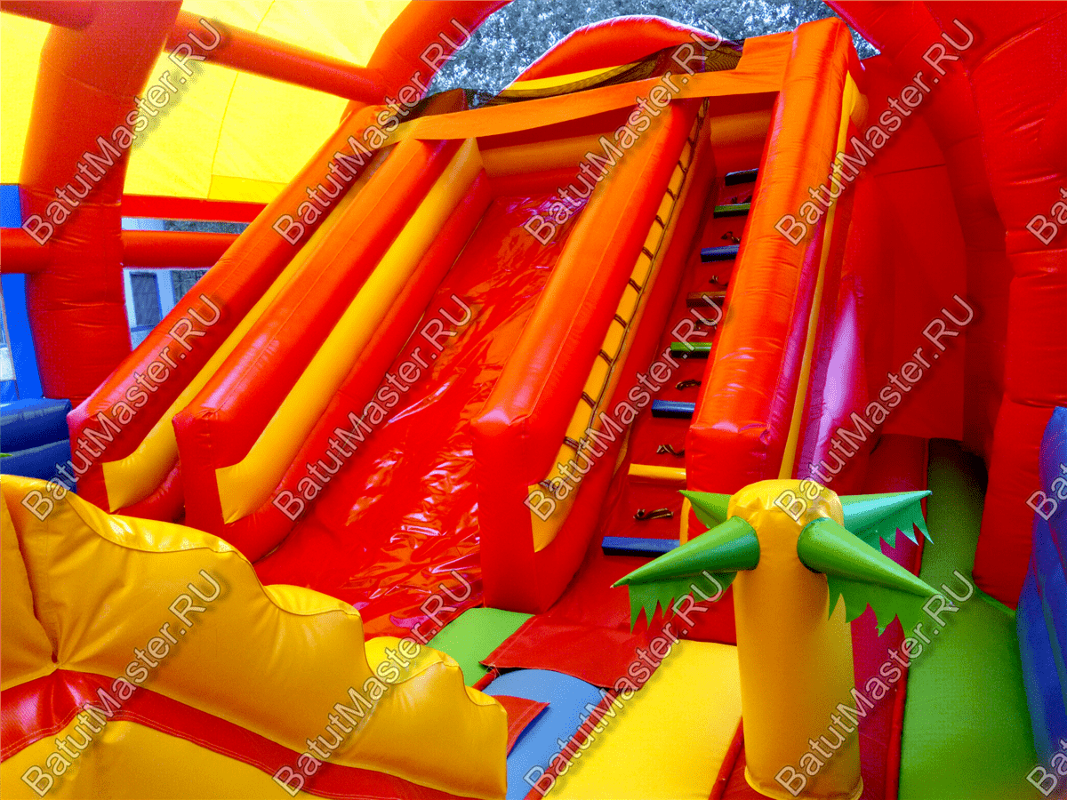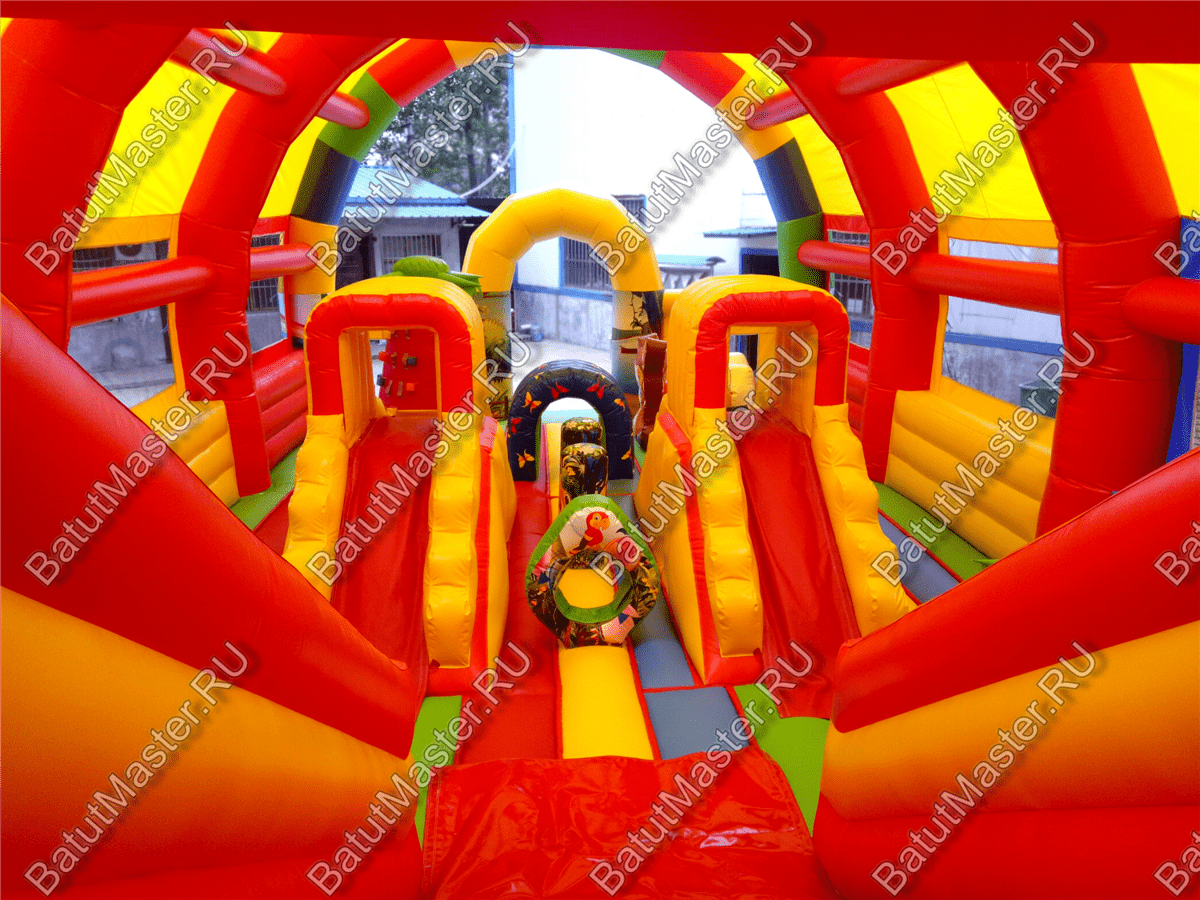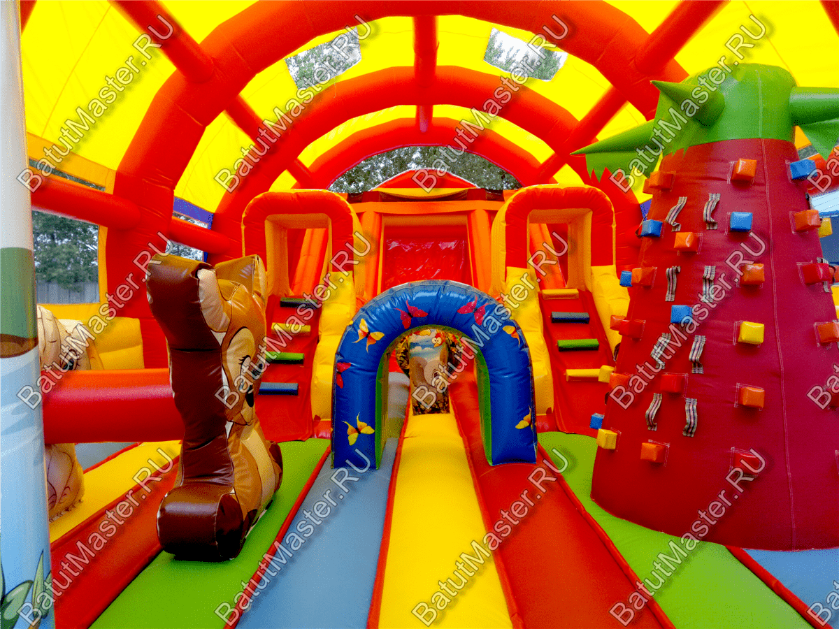 Внутри есть полно развлечений, которые поднимут ребёнку настроение на весь день. Например, они могут просто попрыгать на надувном батуте или же побегать, ведь именно для этого предназначаются батуты. Места внутри предостаточно, и ребята не будут чувствовать тесноты. Также они могут прокатиться с большой горки, что возвышается прямо по центру. Забраться на неё достаточно просто: нужно ухватиться за специальные петли и по надувным ступенькам ползти вверх. А дальше их ожидает весёлый и захватывающий спуск вниз по горке.