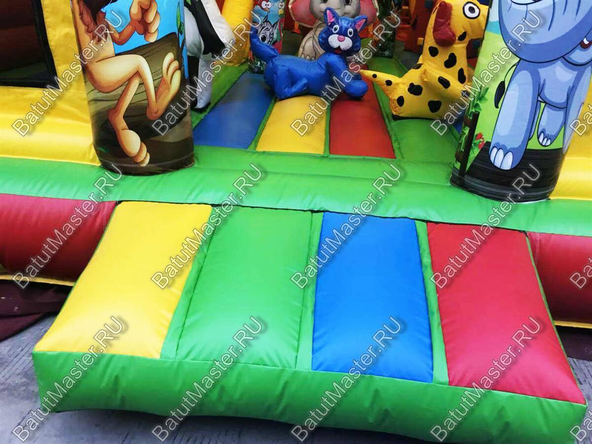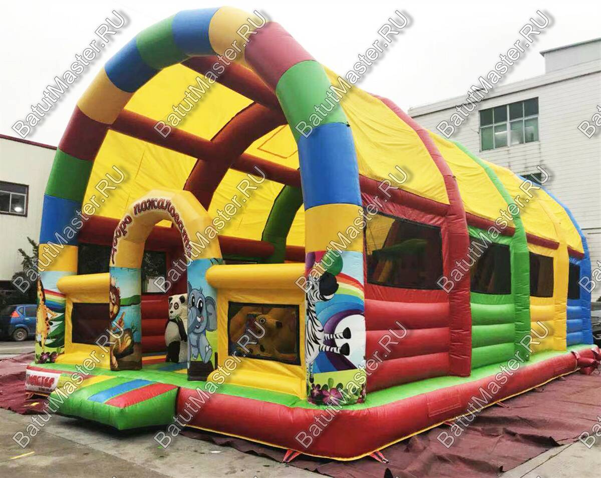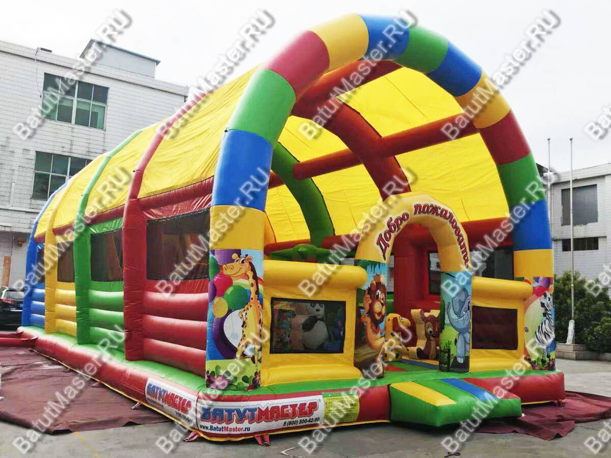 Аттракцион выполнен вместе с крышей, что очень хорошо для бизнеса, потому что батут можно будет разместить не только в помещении, но и на улице.