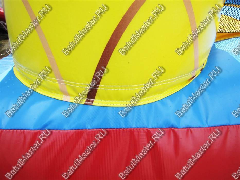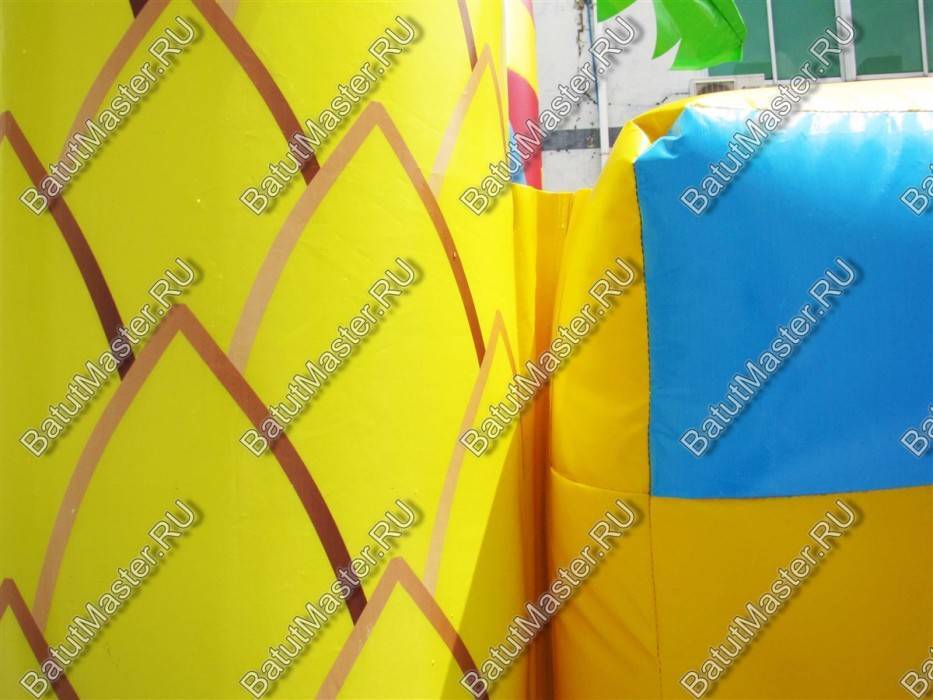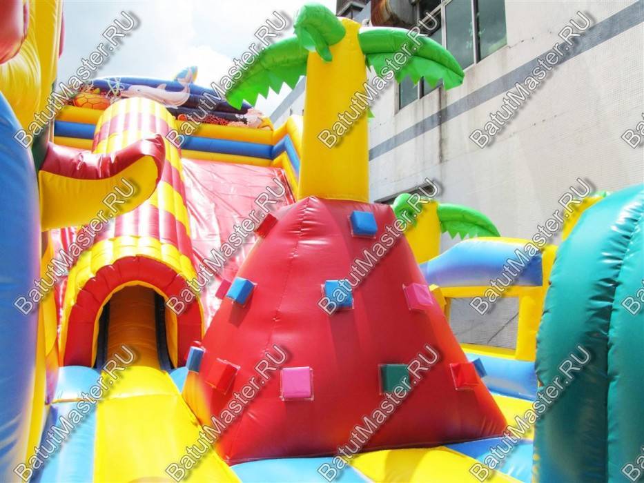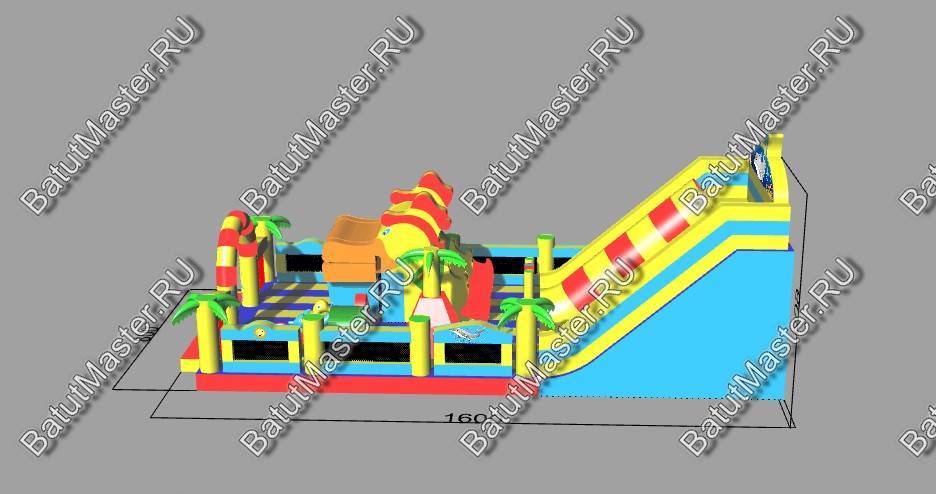 Это не просто яркий батут, но и одновременно мир растительности, и подводный мир самых жарких широт нашей планеты. Уже на входе посетителей будут встречать декоративные фигуры в виде пальм и дельфинов, а дальше начнется просторное место для прыжков и для бега. С левой стороны установлена большая голова утки с робот-пастью, по остальной территории размещаются другие разнообразные игровые фигуры. Почти в самом центре возвышается огромная пальма с оранжевым конусообразным корпусом-скалой и с разноцветными фиксаторами по нему.