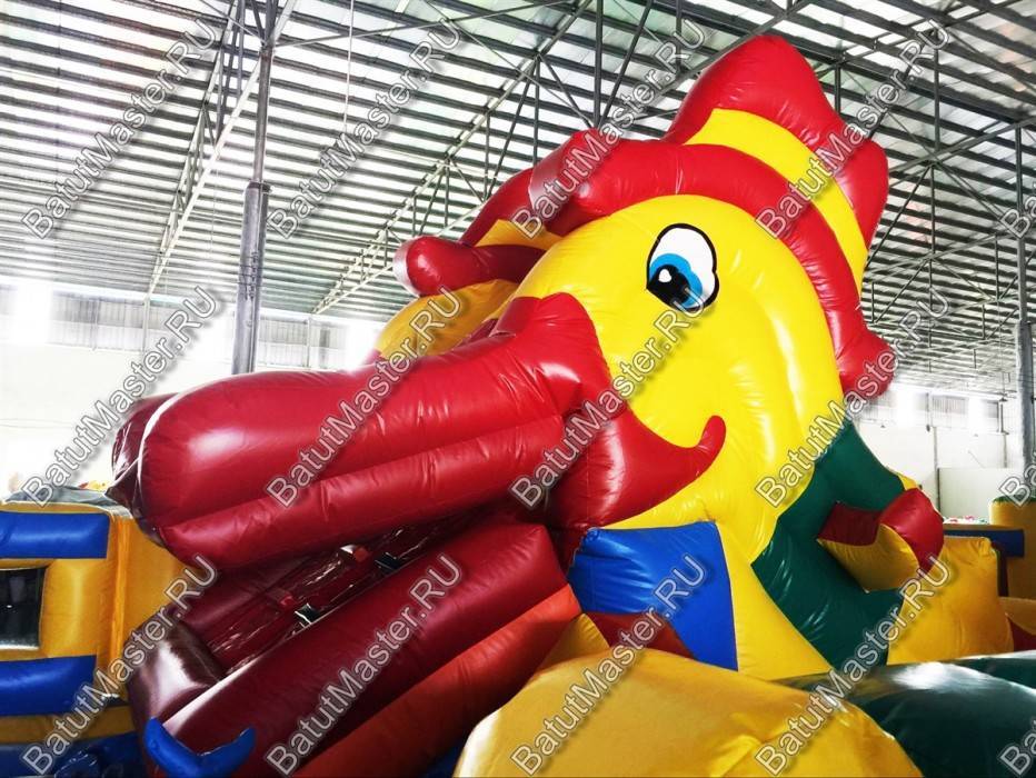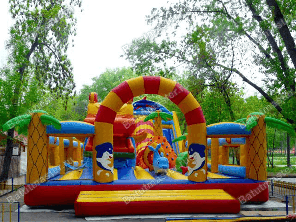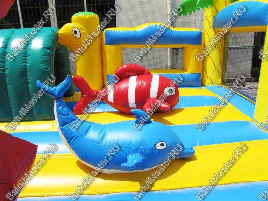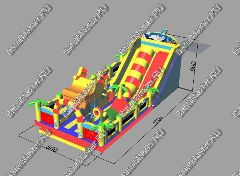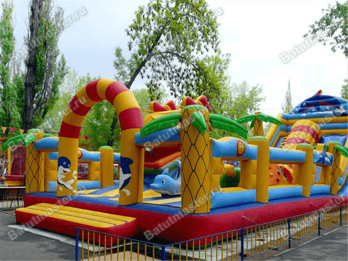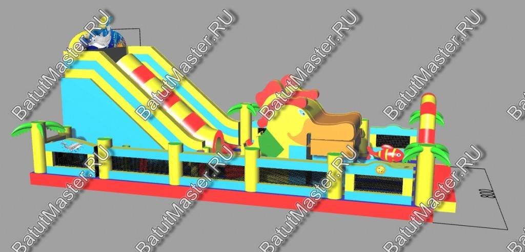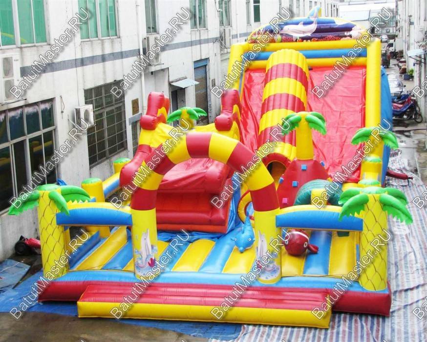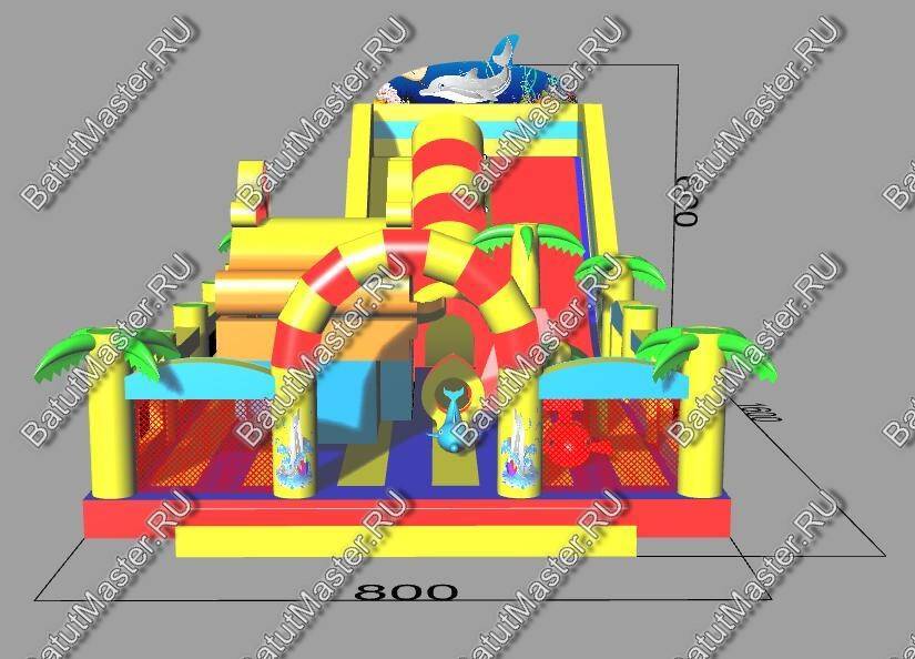 Пройдя все увлекательные препятствия, ребенок подойдет к самой главной конструкции – горке, которая находится у задней стенки и по всей длине оборудована желто-красным тоннелем. Слева от него можно взобраться по лестнице, а справа – спуститься вниз. На самой верхней площадке установлена подушка с изображением дельфина в прыжке. Аттракцион считается одним из самых популярных по своему дизайну, поэтому владельцы могут вполне рассчитывать на прогнозируемый доход.
