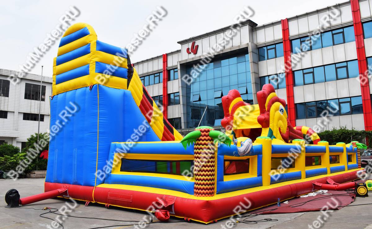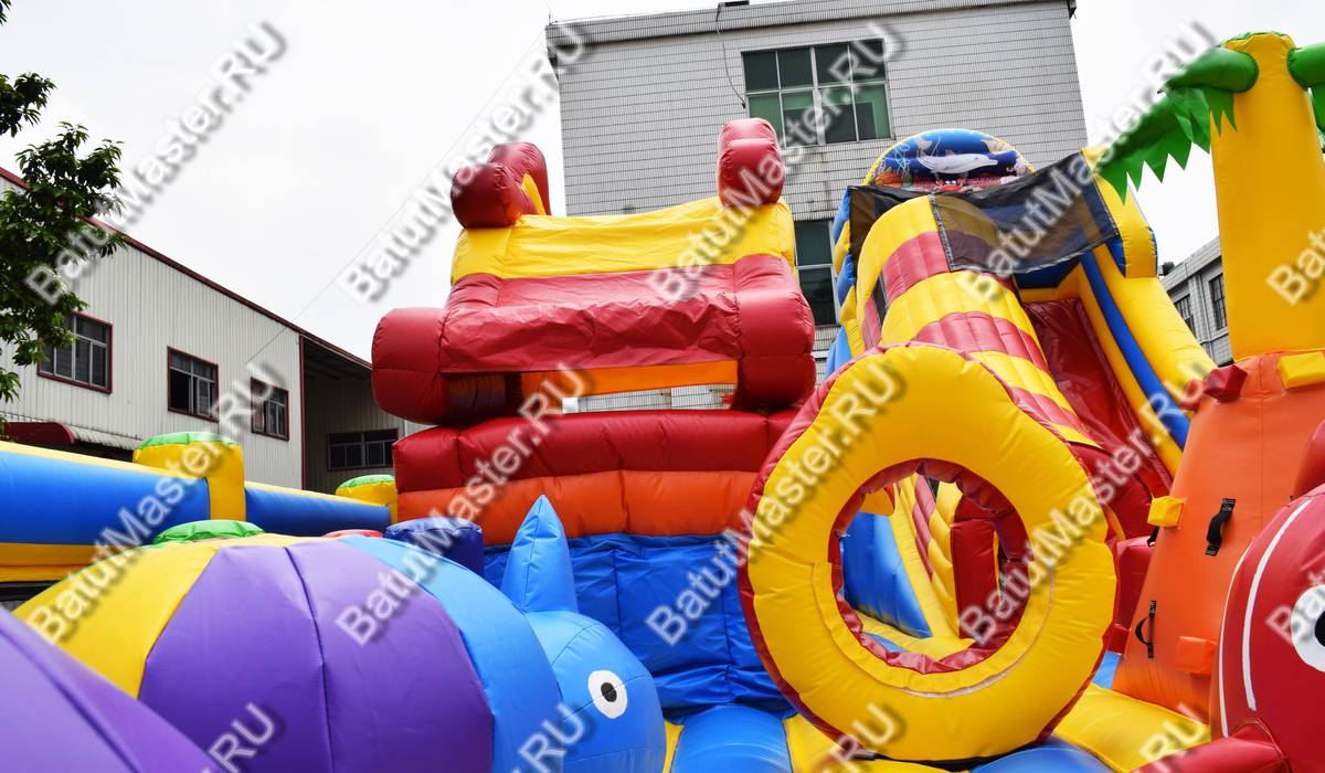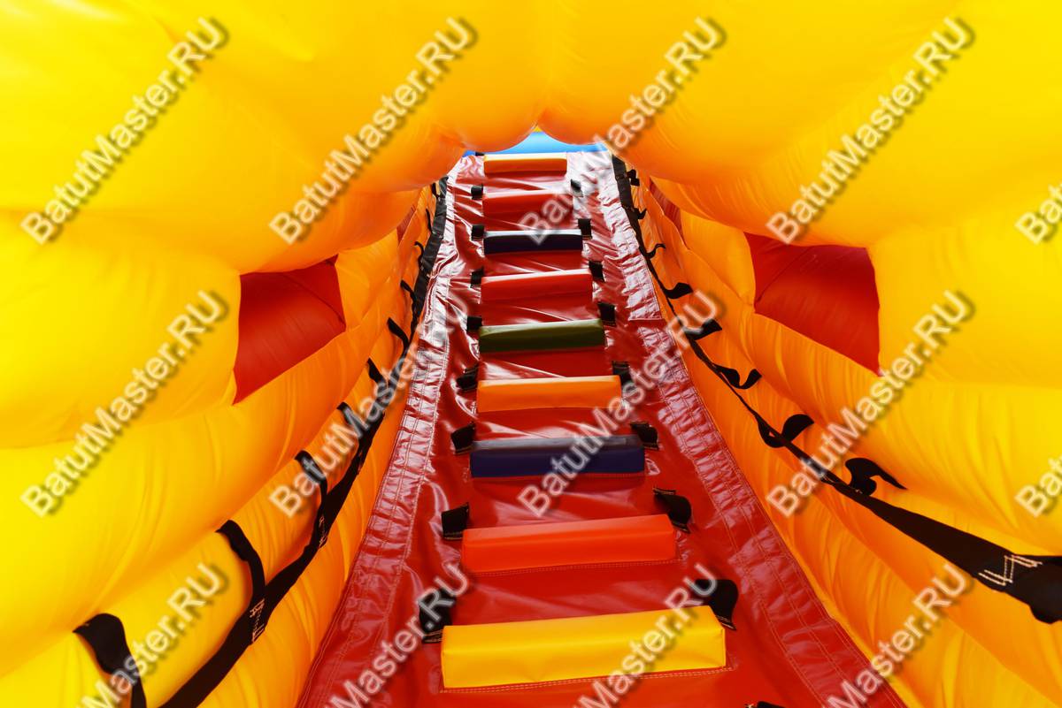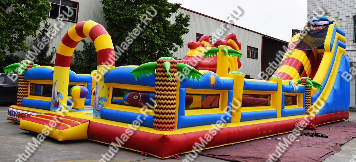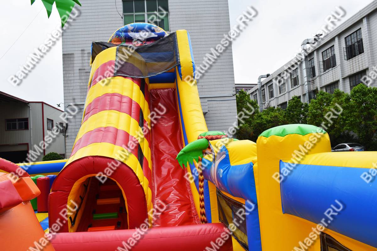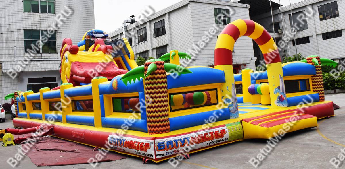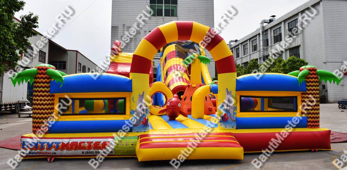 Пройдя все увлекательные препятствия, ребенок подойдет к самой главной конструкции – горке, которая находится у задней стенки и по всей длине оборудована желто-красным тоннелем. Слева от него можно взобраться по лестнице, а справа – спуститься вниз. На самой верхней площадке установлена подушка с изображением дельфина в прыжке. Аттракцион считается одним из самых популярных по своему дизайну, поэтому владельцы могут вполне рассчитывать на прогнозируемый доход.