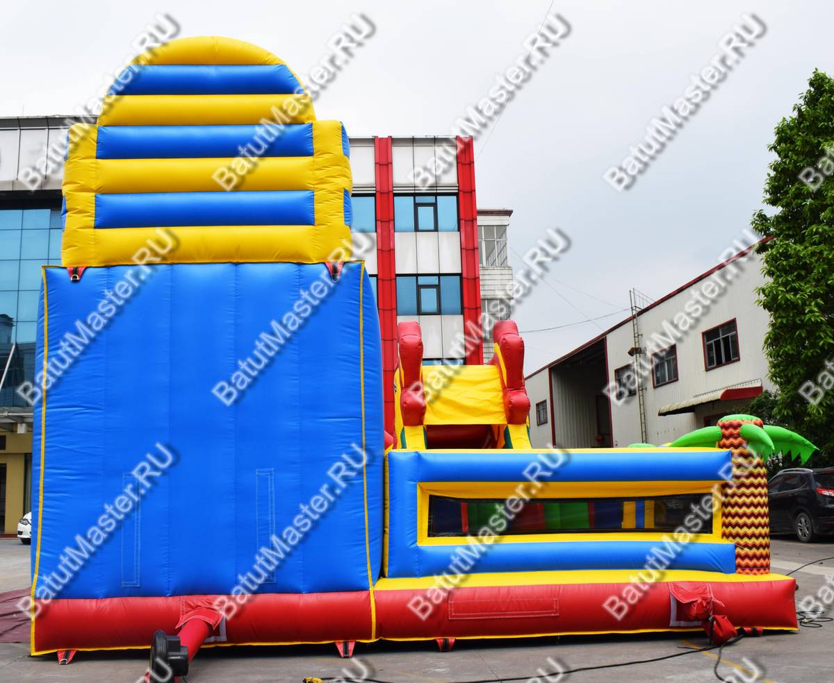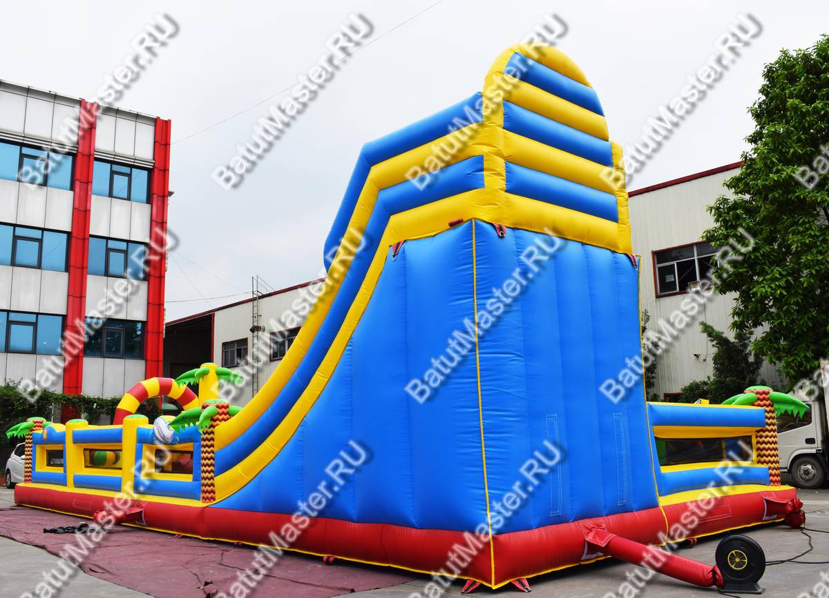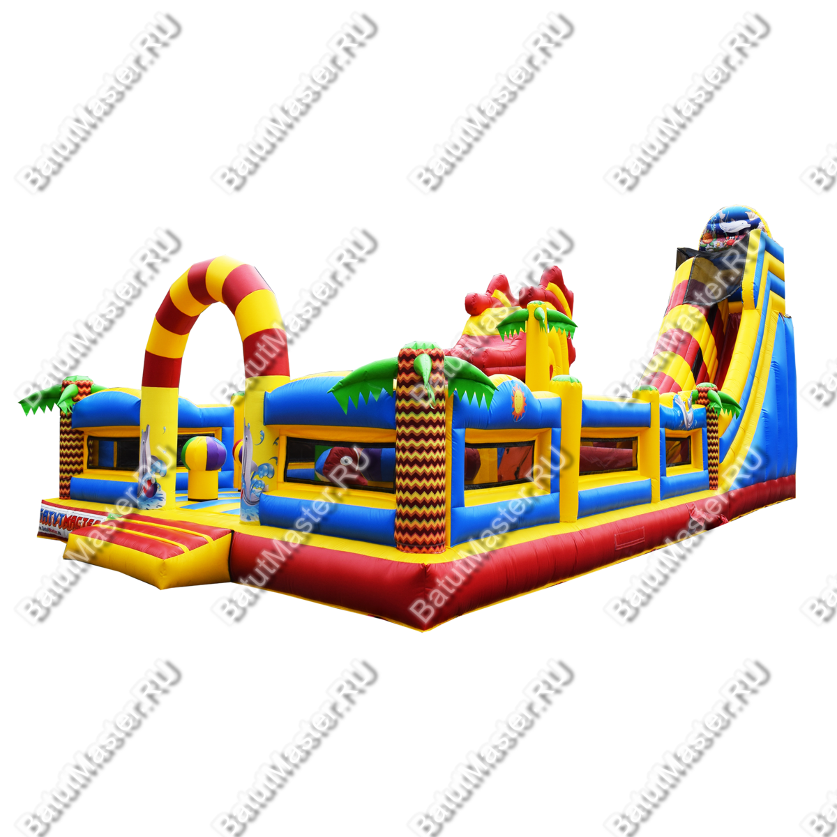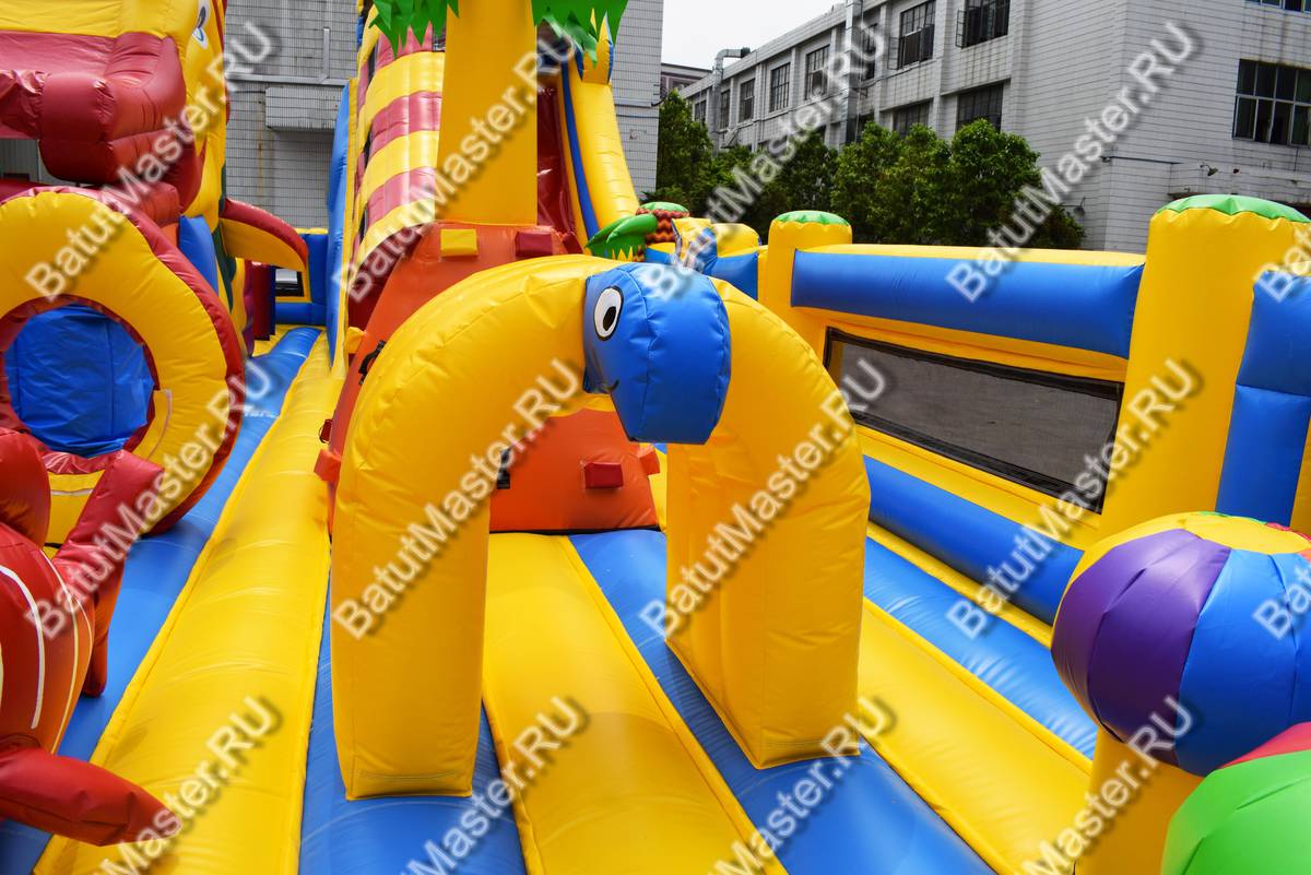 Это не просто яркий батут, но и одновременно мир растительности, и подводный мир самых жарких широт нашей планеты. Уже на входе посетителей будут встречать декоративные фигуры в виде пальм и дельфинов, а дальше начнется просторное место для прыжков и для бега. С левой стороны установлена большая голова утки с робот-пастью, по остальной территории размещаются другие разнообразные игровые фигуры. Почти в самом центре возвышается огромная пальма с оранжевым конусообразным корпусом-скалой и с разноцветными фиксаторами по нему.