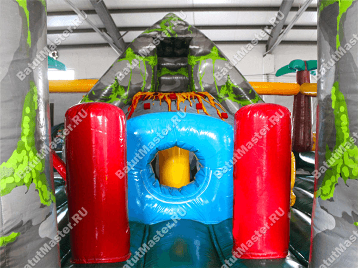 Огромная открытая площадка или просторное место для прыжков и для бега, обнесенное со всех сторон высокими пальмами в виде столбов-опор. Основные конструкции в центре яркого батута напоминают настоящие скалы, поросшие зеленью, в которых живут не только птицы, но и динозавры. Еще в самом начале перед входом установлены фигуры в виде окровавленных огромных клыков, которые обязательно будут привлекать ребятню.