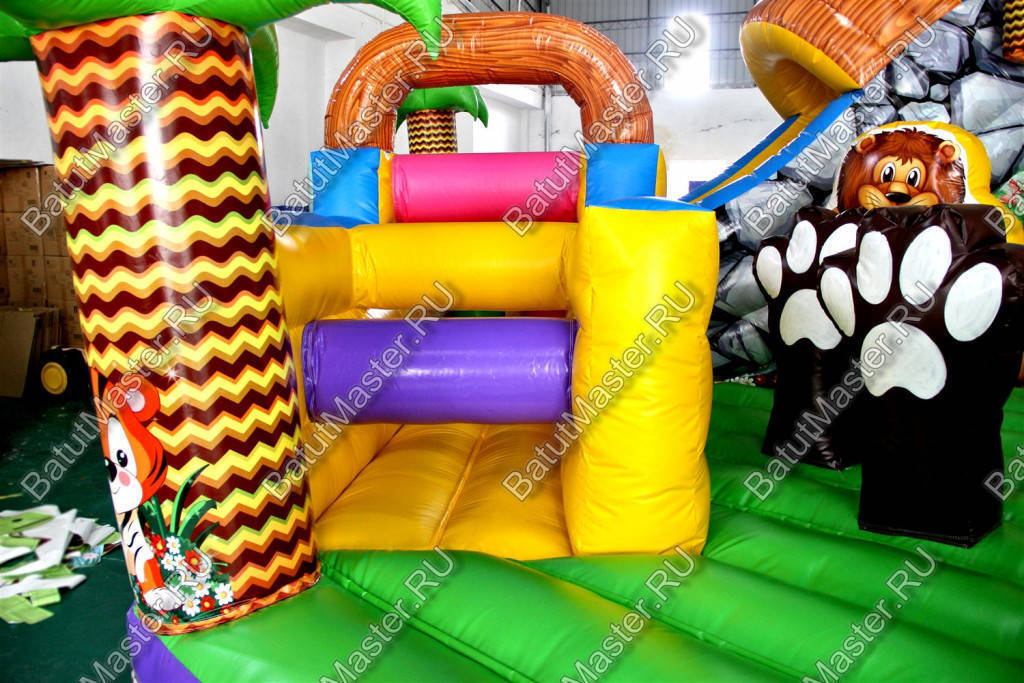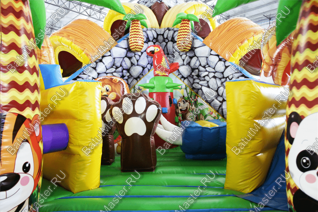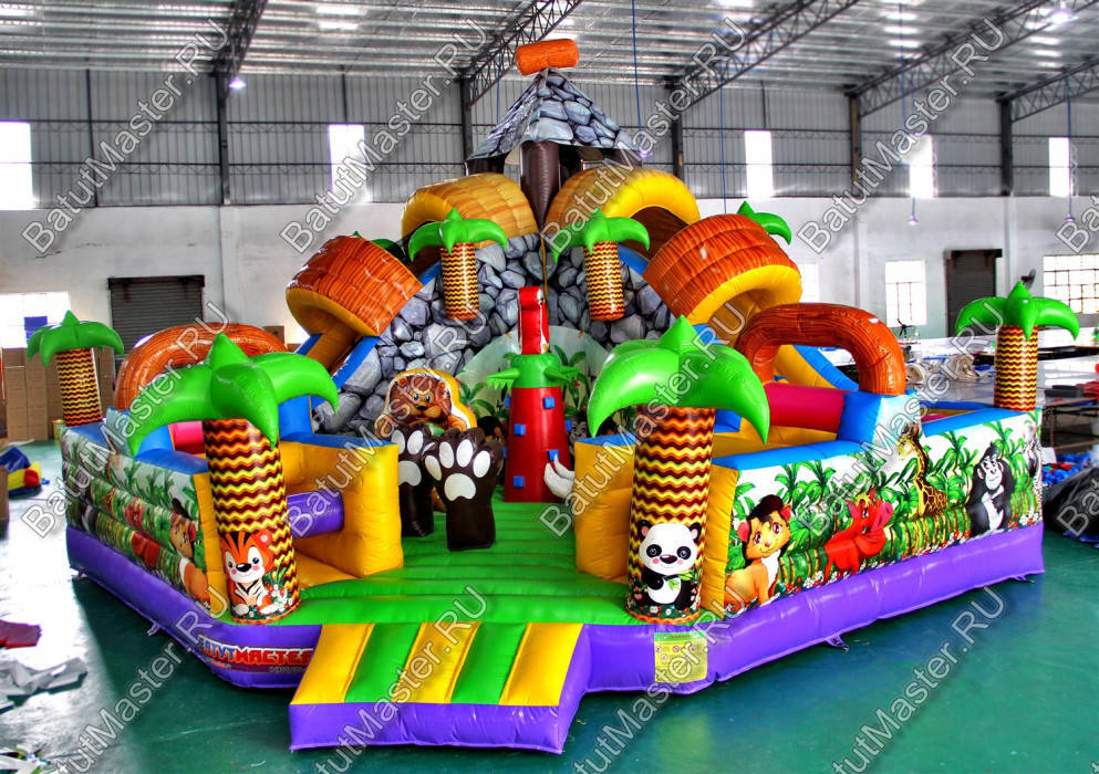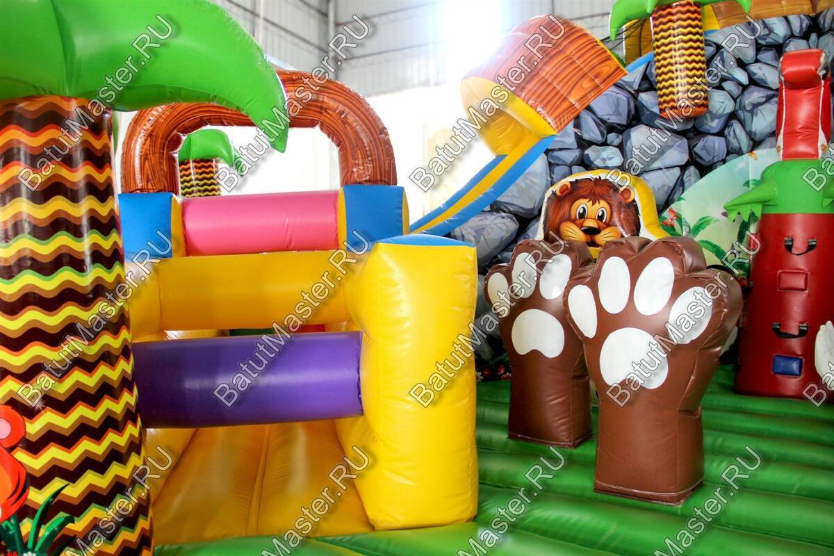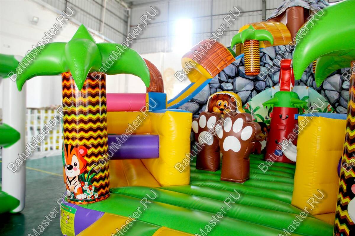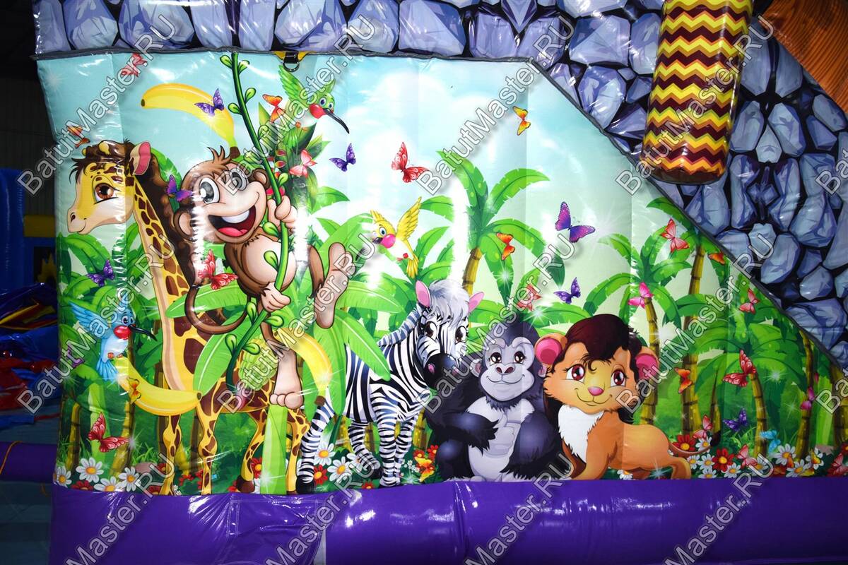 Уникальный, интересный игровой комплекс «В гостях у зебры» привлечет внимание детей разной возрастной категории. Это не просто надувной батут, это целая арена для невероятных приключений, где дети получат незабываемые эмоции. ¶Здесь огромное количество разнообразных модулей, каждый из которых притягивает взгляд и призывает к веселью. Детям интересно будет забраться на горизонтальные перекладины, а также покорить скалодром, побегать вокруг лапок панды или спуститься с горки, которых на веселой арене несколько. Все яркое и притягивает взгляд.¶Украшением батут являются большие надувные пальмы, животные тропиков, а также рисунки в виде полянки.