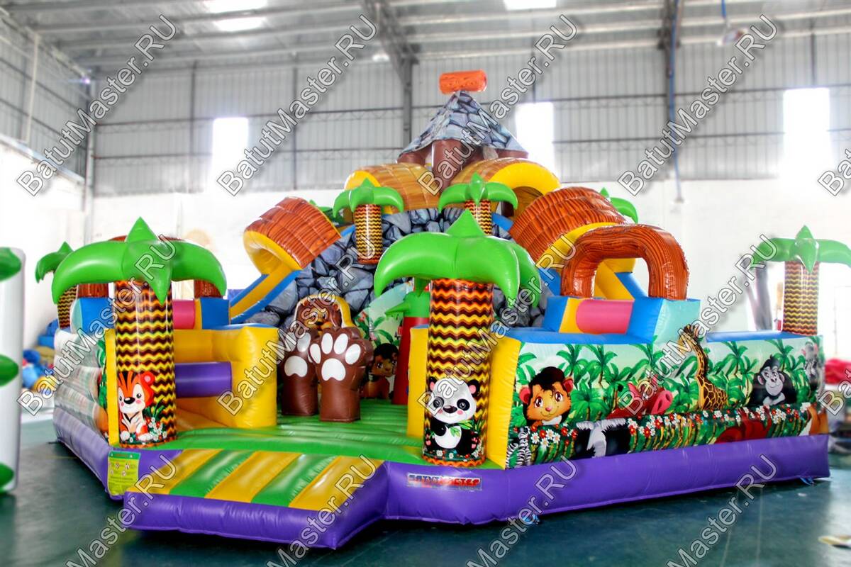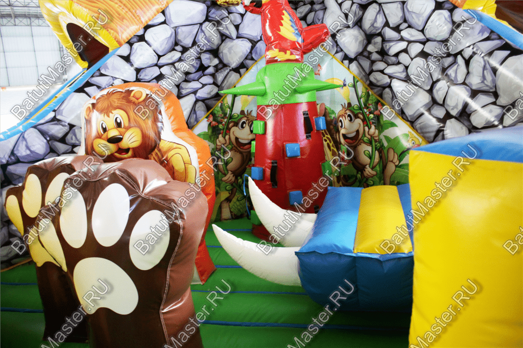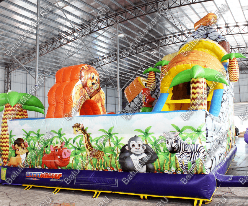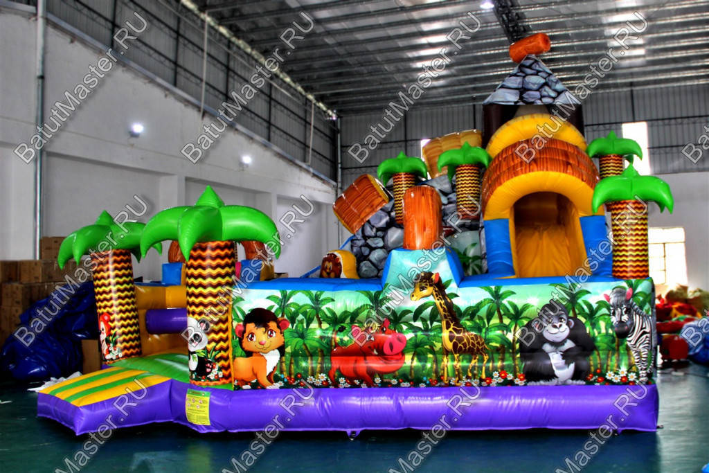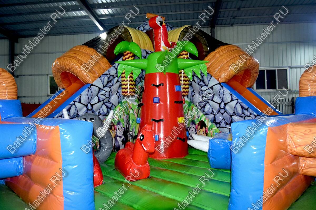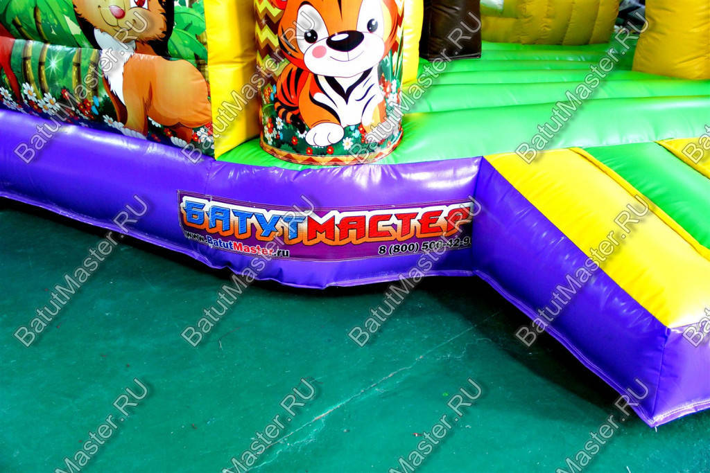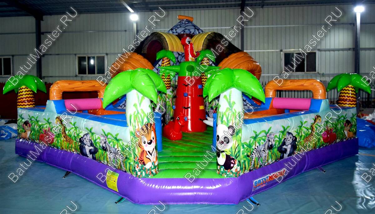 Уникальный, интересный игровой комплекс «В гостях у зебры» привлечет внимание детей разной возрастной категории. Это не просто надувной батут, это целая арена для невероятных приключений, где дети получат незабываемые эмоции. ¶Здесь огромное количество разнообразных модулей, каждый из которых притягивает взгляд и призывает к веселью. Детям интересно будет забраться на горизонтальные перекладины, а также покорить скалодром, побегать вокруг лапок панды или спуститься с горки, которых на веселой арене несколько. Все яркое и притягивает взгляд.¶Украшением батут являются большие надувные пальмы, животные тропиков, а также рисунки в виде полянки.