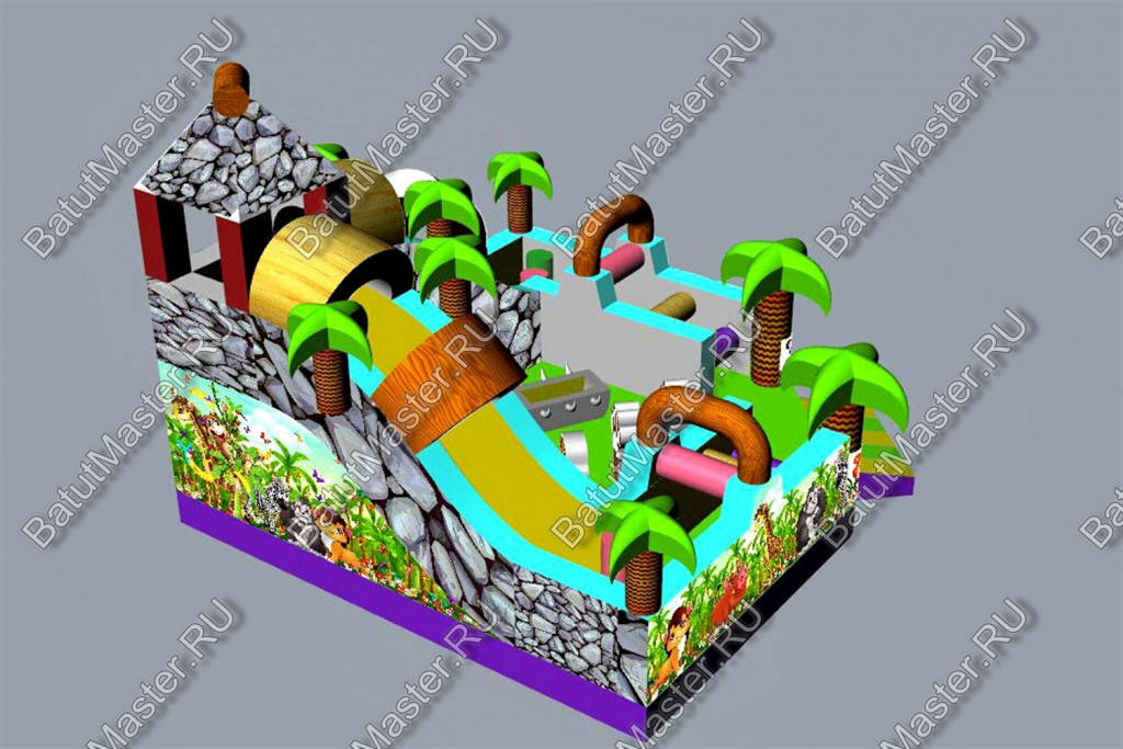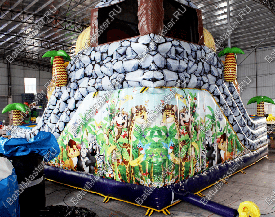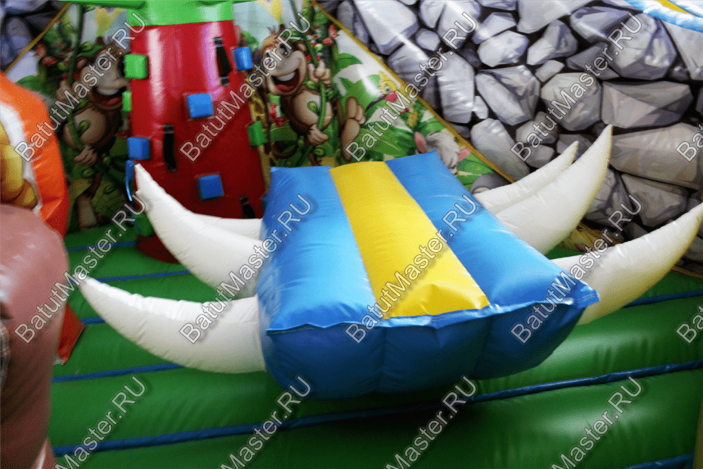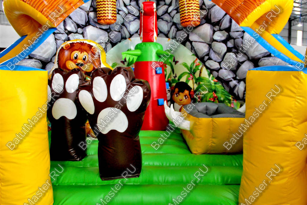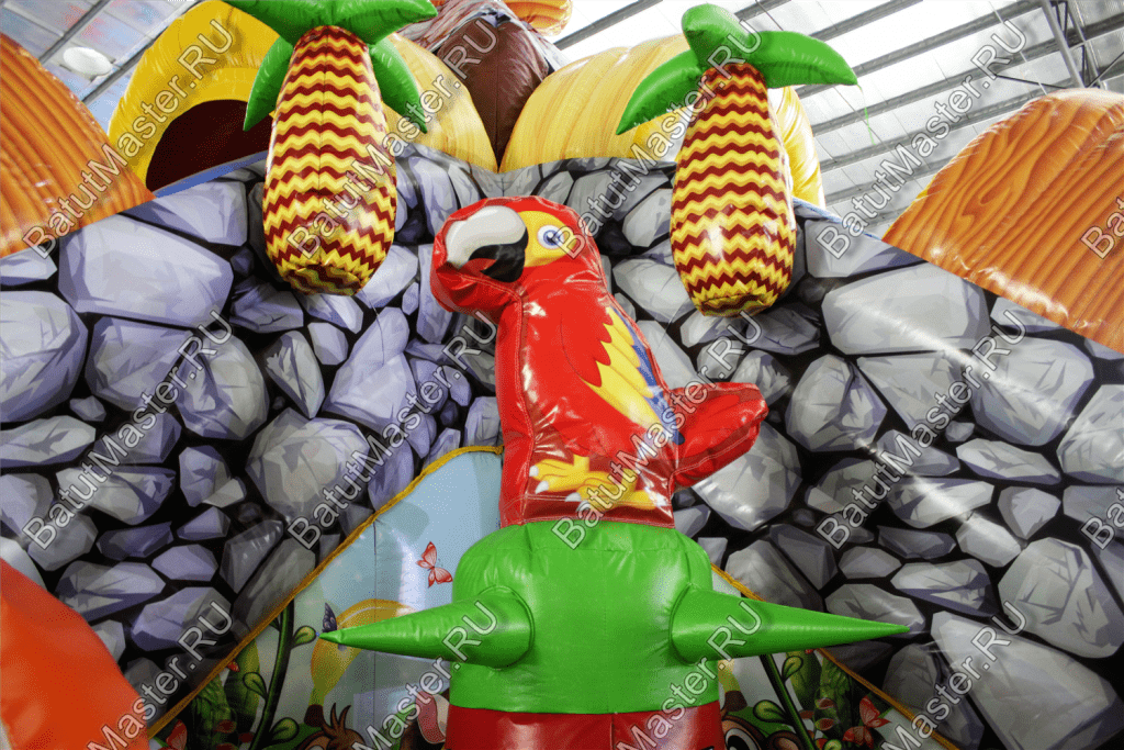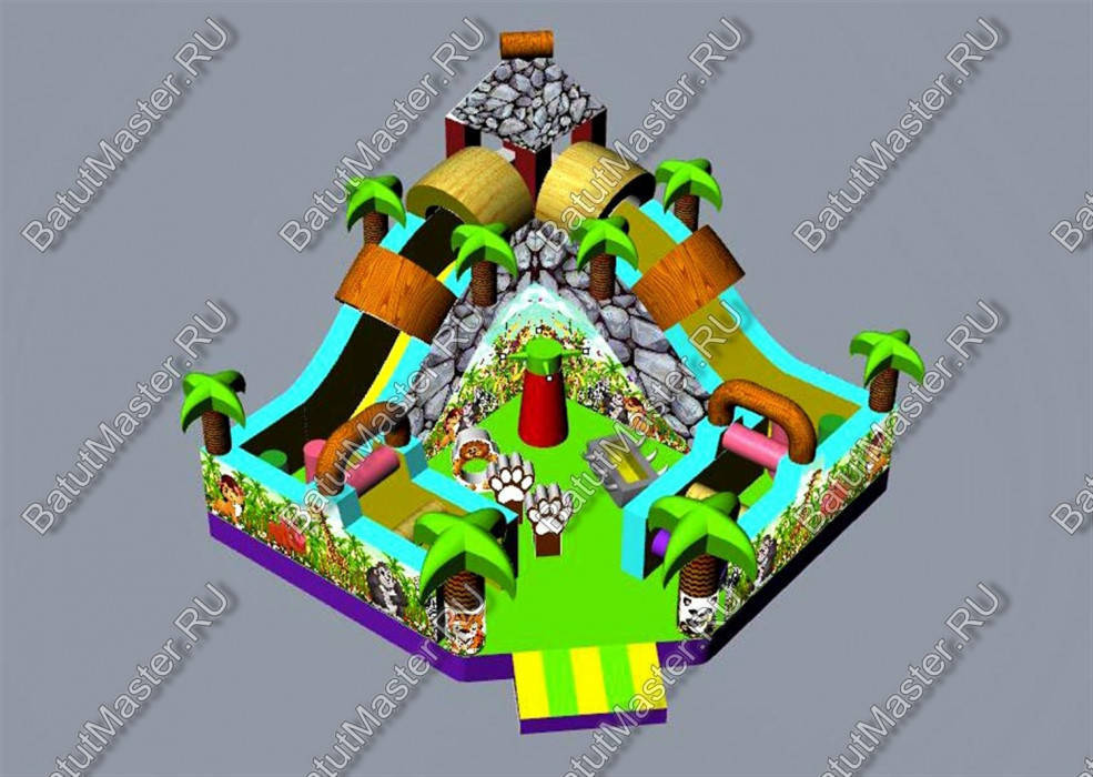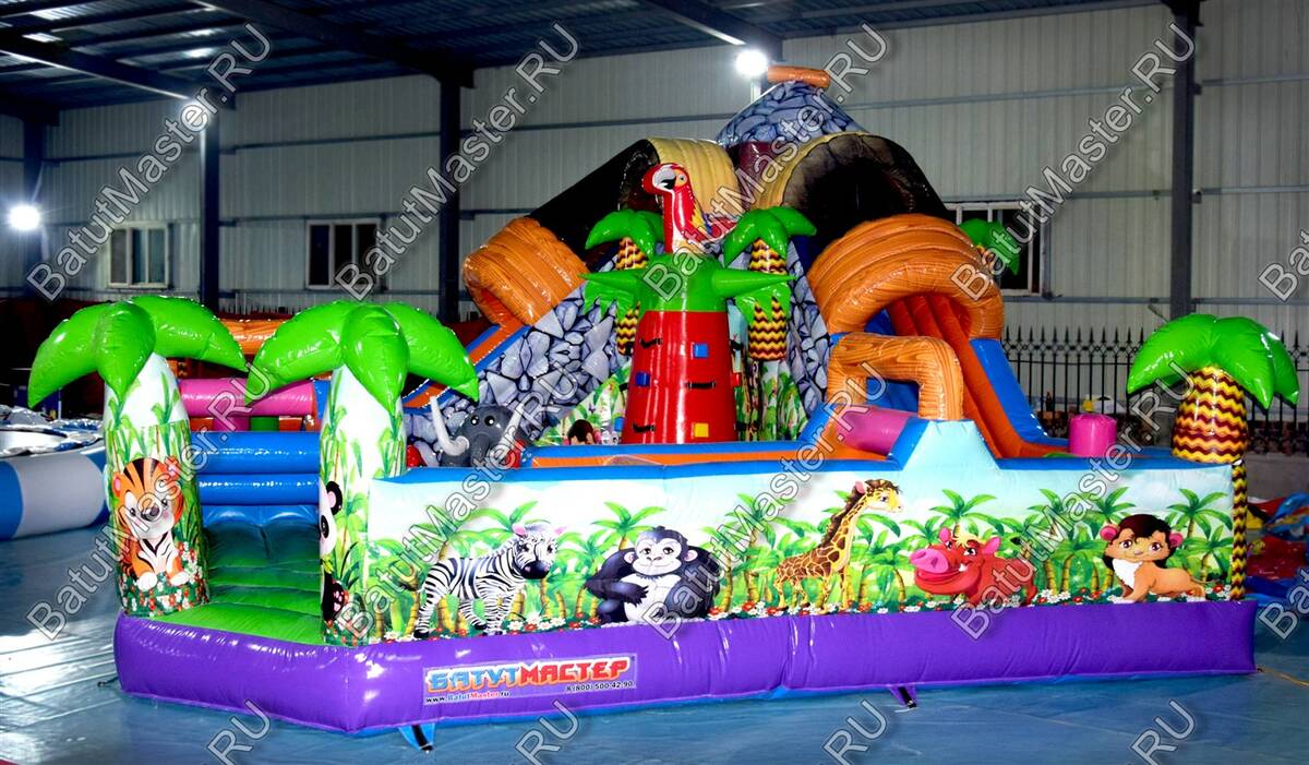 Уникальный, интересный игровой комплекс «В гостях у зебры» привлечет внимание детей разной возрастной категории. Это не просто надувной батут, это целая арена для невероятных приключений, где дети получат незабываемые эмоции. ¶Здесь огромное количество разнообразных модулей, каждый из которых притягивает взгляд и призывает к веселью. Детям интересно будет забраться на горизонтальные перекладины, а также покорить скалодром, побегать вокруг лапок панды или спуститься с горки, которых на веселой арене несколько. Все яркое и притягивает взгляд.¶Украшением батут являются большие надувные пальмы, животные тропиков, а также рисунки в виде полянки.