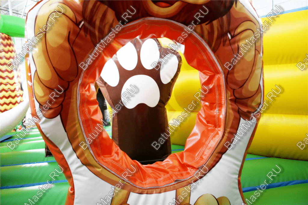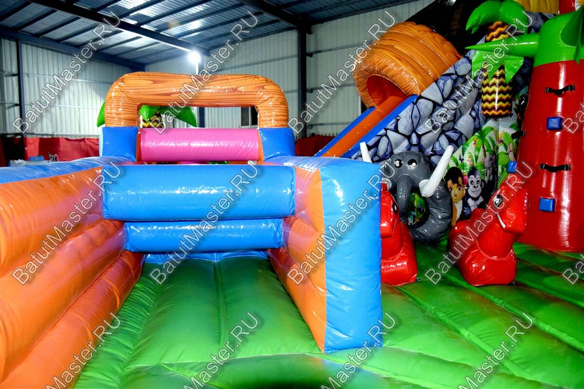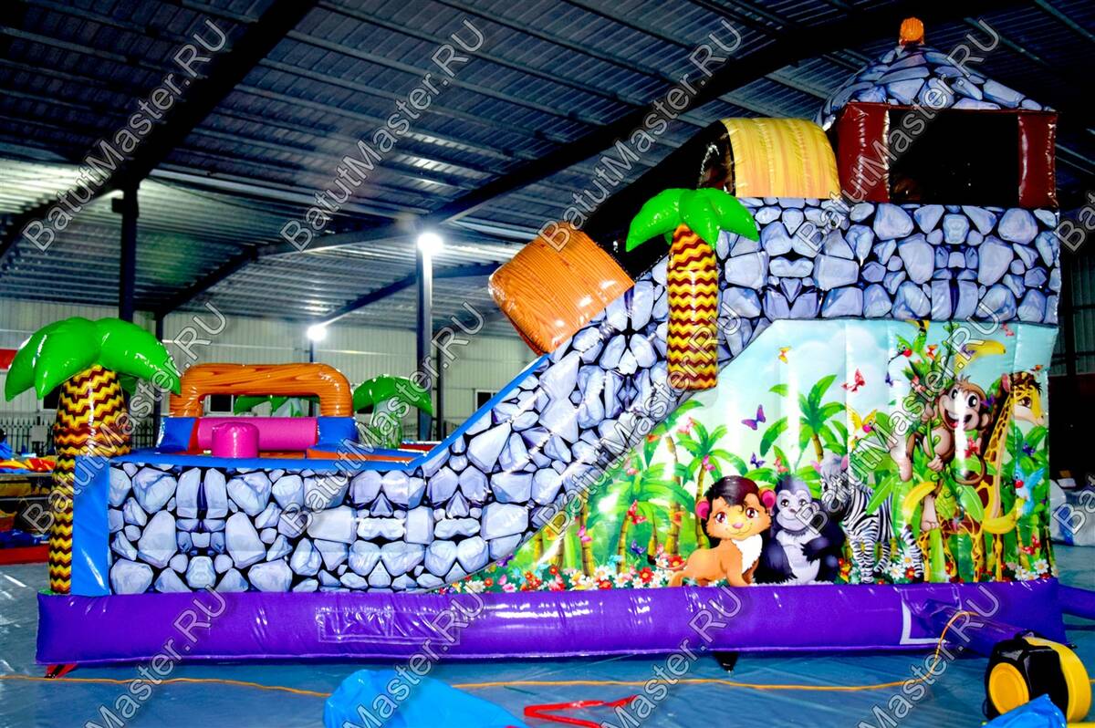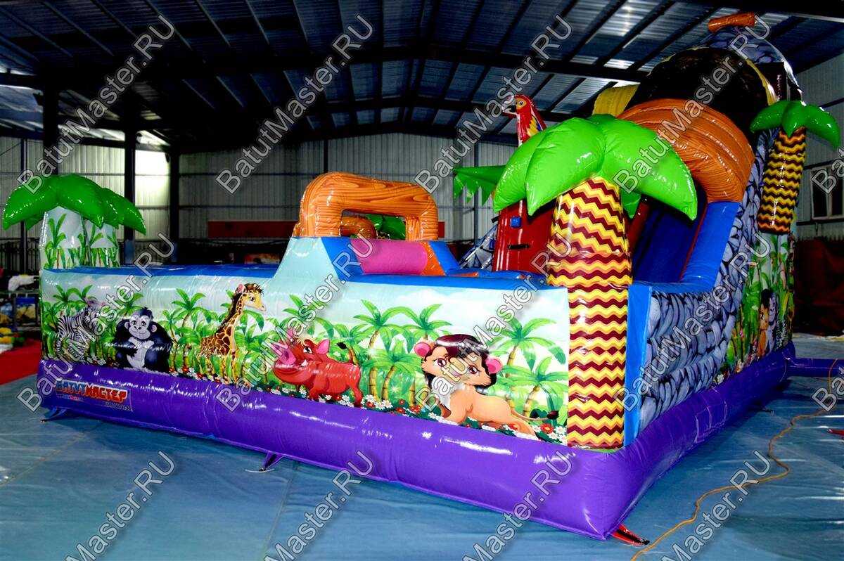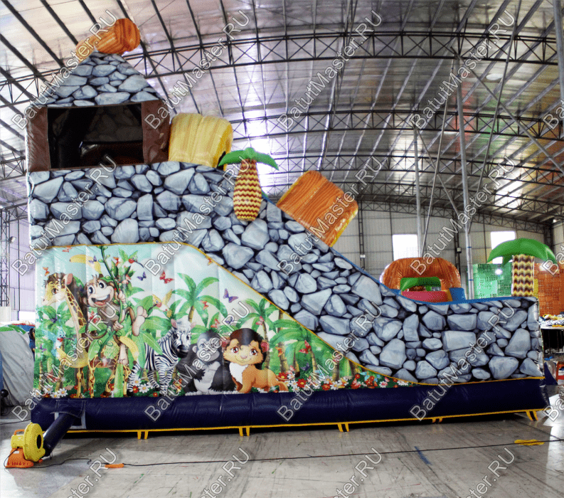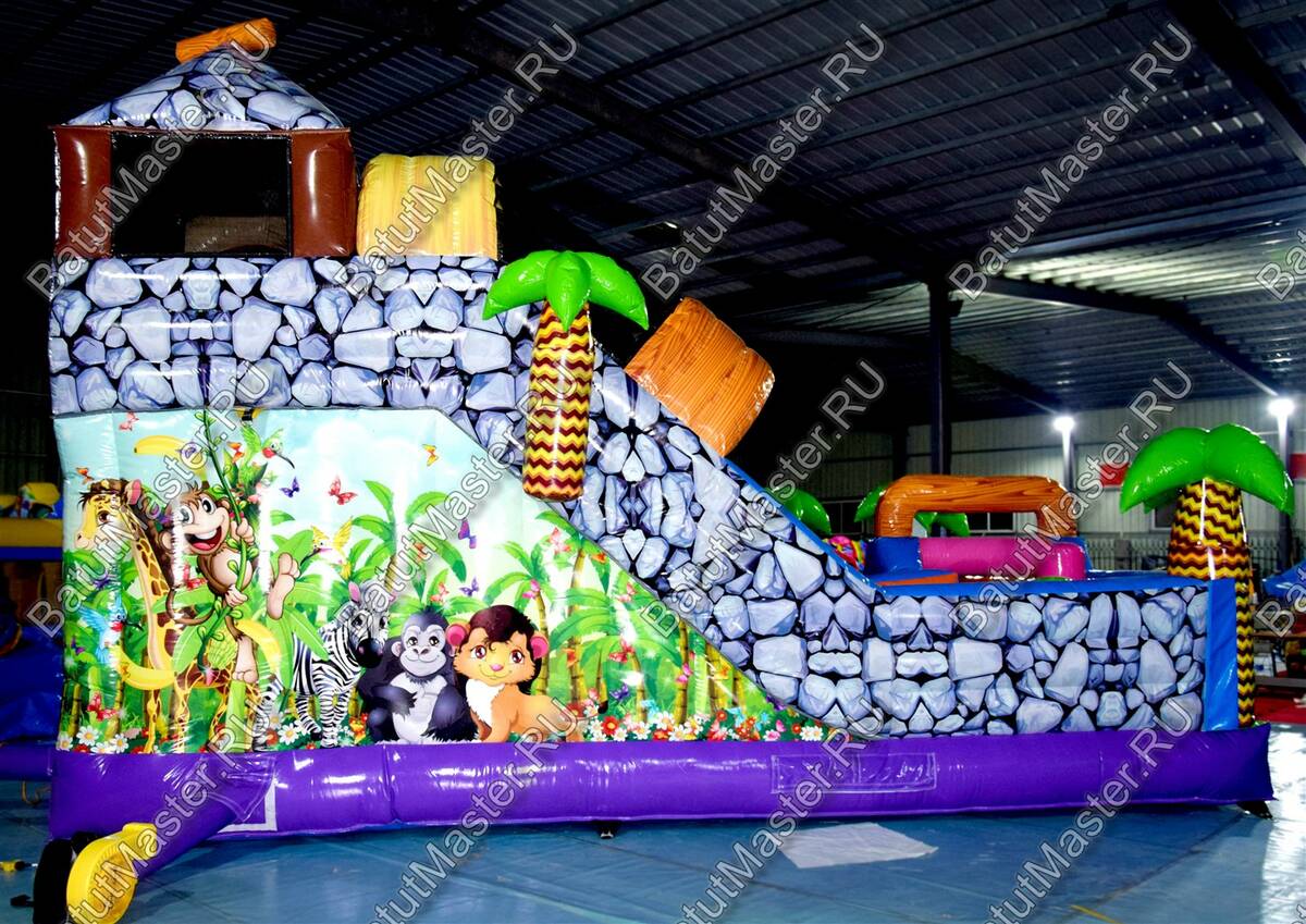 Уникальный, интересный игровой комплекс «В гостях у зебры» привлечет внимание детей разной возрастной категории. Это не просто надувной батут, это целая арена для невероятных приключений, где дети получат незабываемые эмоции. ¶Здесь огромное количество разнообразных модулей, каждый из которых притягивает взгляд и призывает к веселью. Детям интересно будет забраться на горизонтальные перекладины, а также покорить скалодром, побегать вокруг лапок панды или спуститься с горки, которых на веселой арене несколько. Все яркое и притягивает взгляд.¶Украшением батут являются большие надувные пальмы, животные тропиков, а также рисунки в виде полянки.