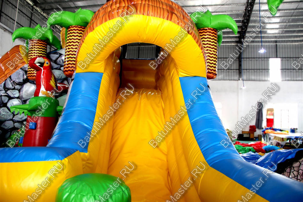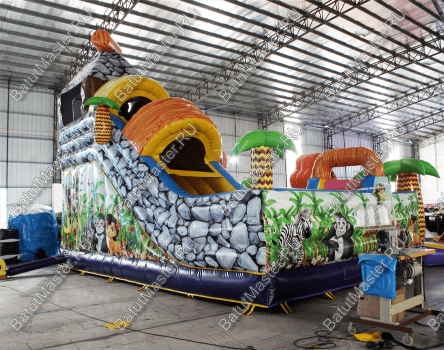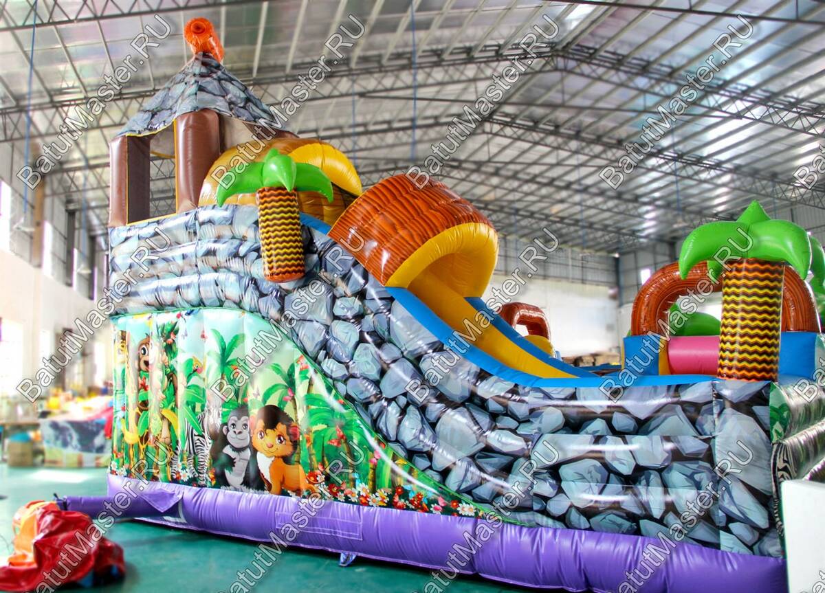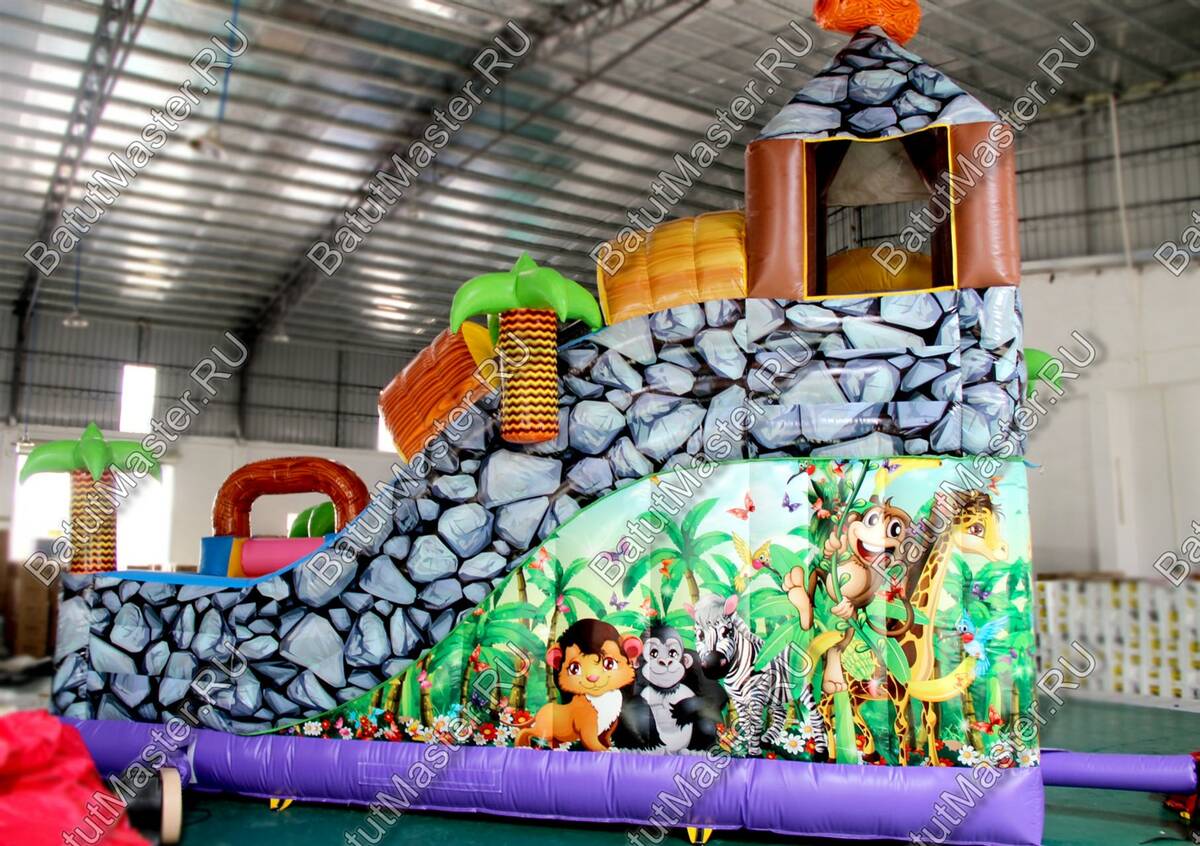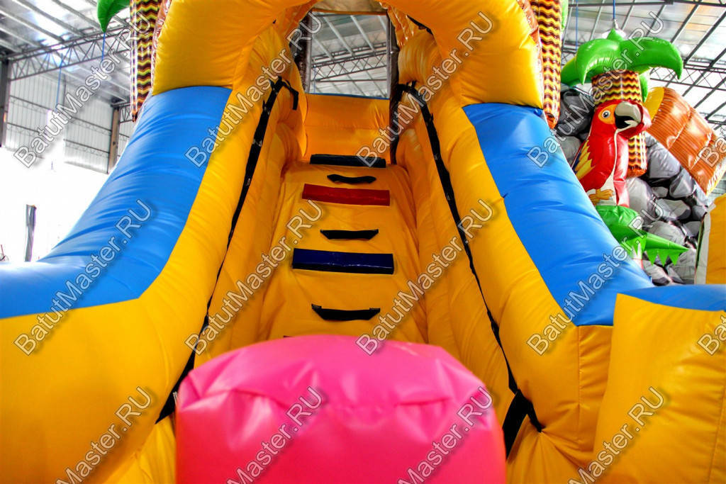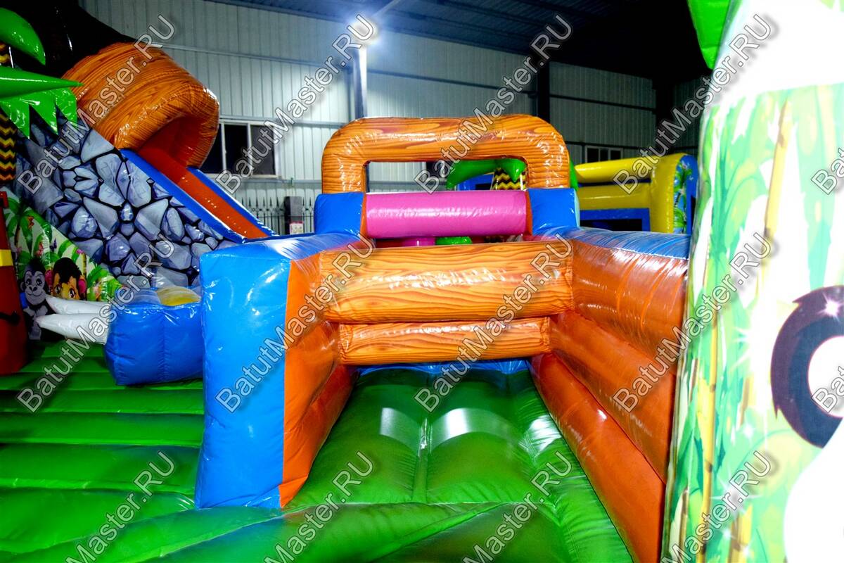 Уникальный, интересный игровой комплекс «В гостях у зебры» привлечет внимание детей разной возрастной категории. Это не просто надувной батут, это целая арена для невероятных приключений, где дети получат незабываемые эмоции. ¶Здесь огромное количество разнообразных модулей, каждый из которых притягивает взгляд и призывает к веселью. Детям интересно будет забраться на горизонтальные перекладины, а также покорить скалодром, побегать вокруг лапок панды или спуститься с горки, которых на веселой арене несколько. Все яркое и притягивает взгляд.¶Украшением батут являются большие надувные пальмы, животные тропиков, а также рисунки в виде полянки.